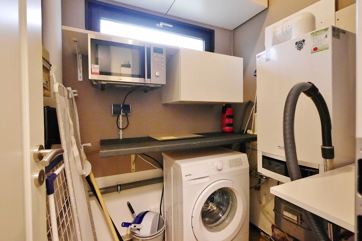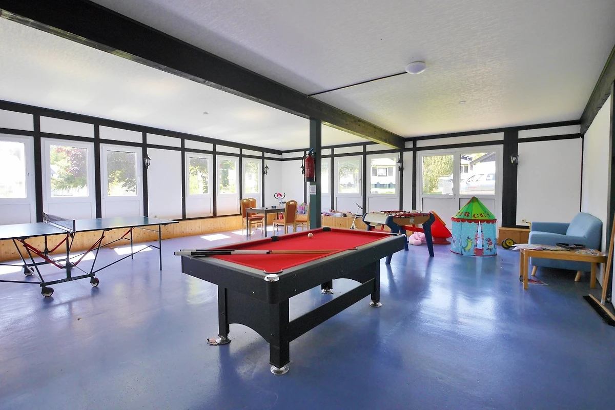 Waschmaschine, im Winter ein Rodelschlitten, Spielesammlung und eine Holzeisenbahn für Kinder.