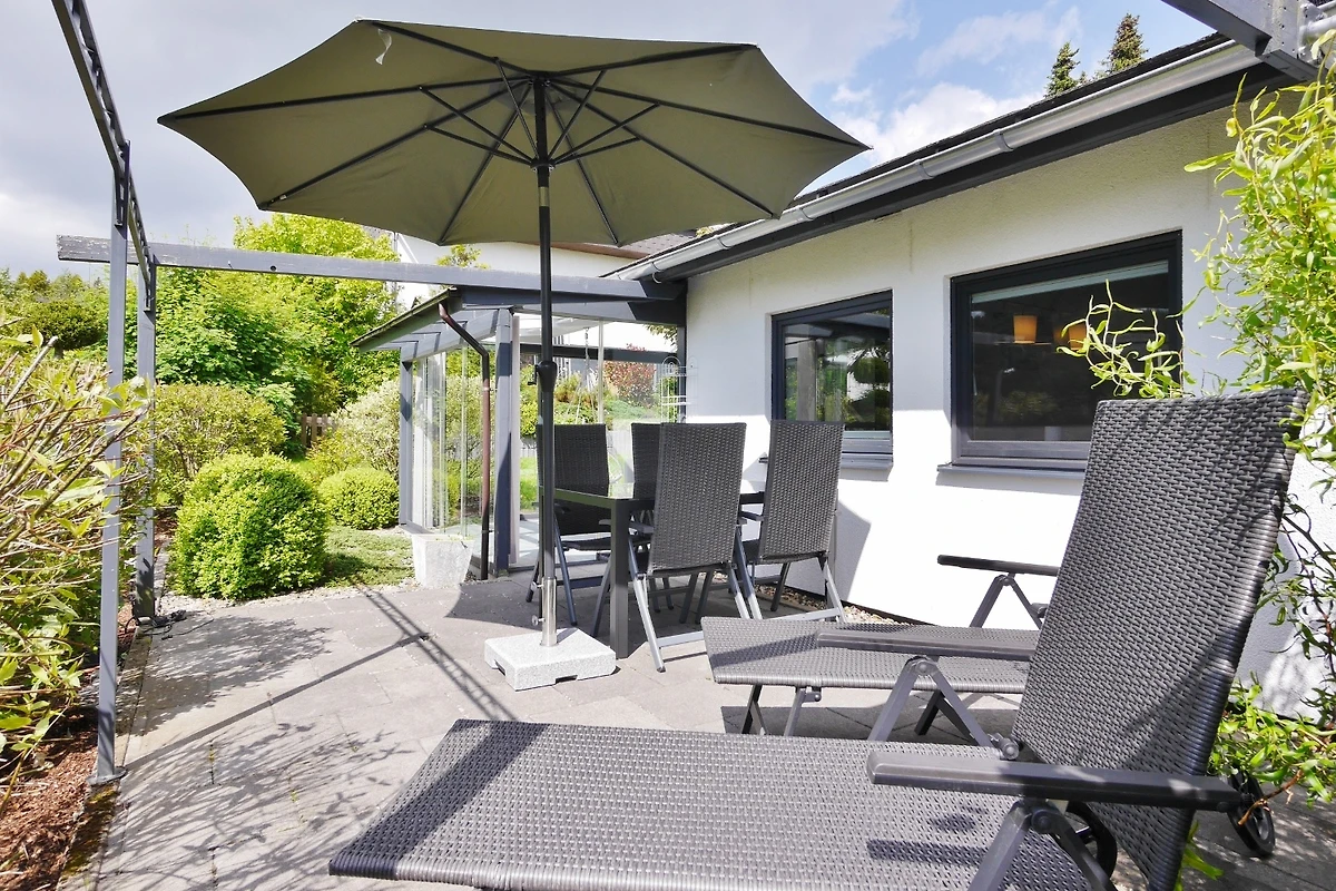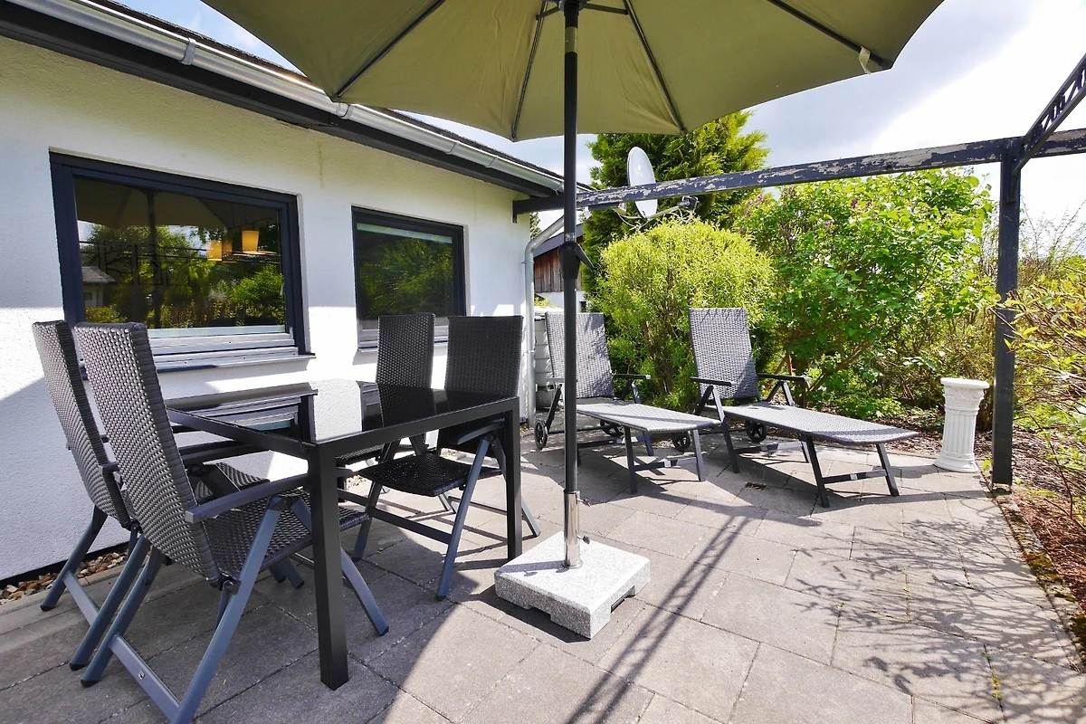 - Süd-Terrasse mit Sitzgruppe, Liegestühlen und E-Grill