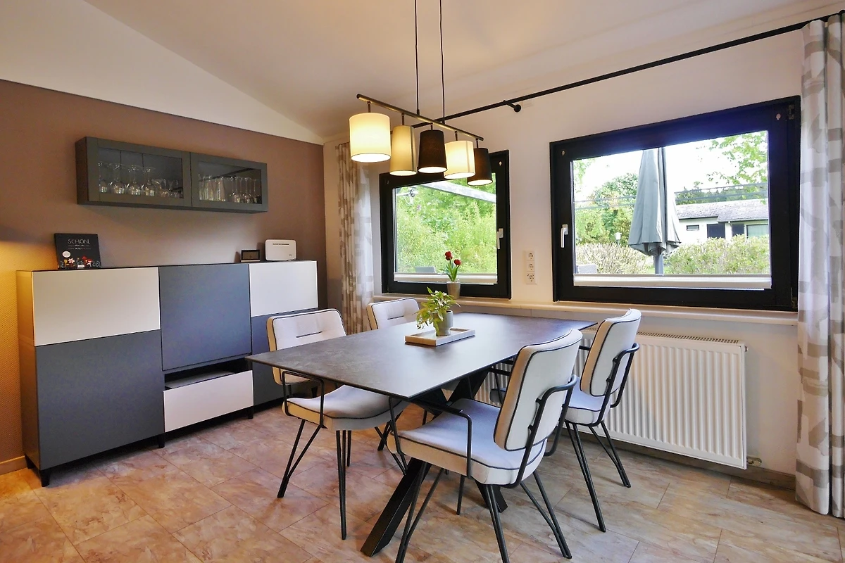Gut durchdachtes und neu eingerichtetes Ferienhaus mit traumhaftem Wintergarten, der sich von drei Seiten durch Schiebetüren öffnen lässt. Wie schön muss es hier im Sommer sein. Wir hatten leider Pech mit dem Wetter aber der Kamin vermittelte eine kuschelige Atmosphäre vor dem TV. Die Meine-Karte hat auch gute Schlechtwetterangebote, die wir reichlich genutzt haben. Unsere Jungs waren begeistert und wollen wiederkommen - aber dann mit gutem Wetter.