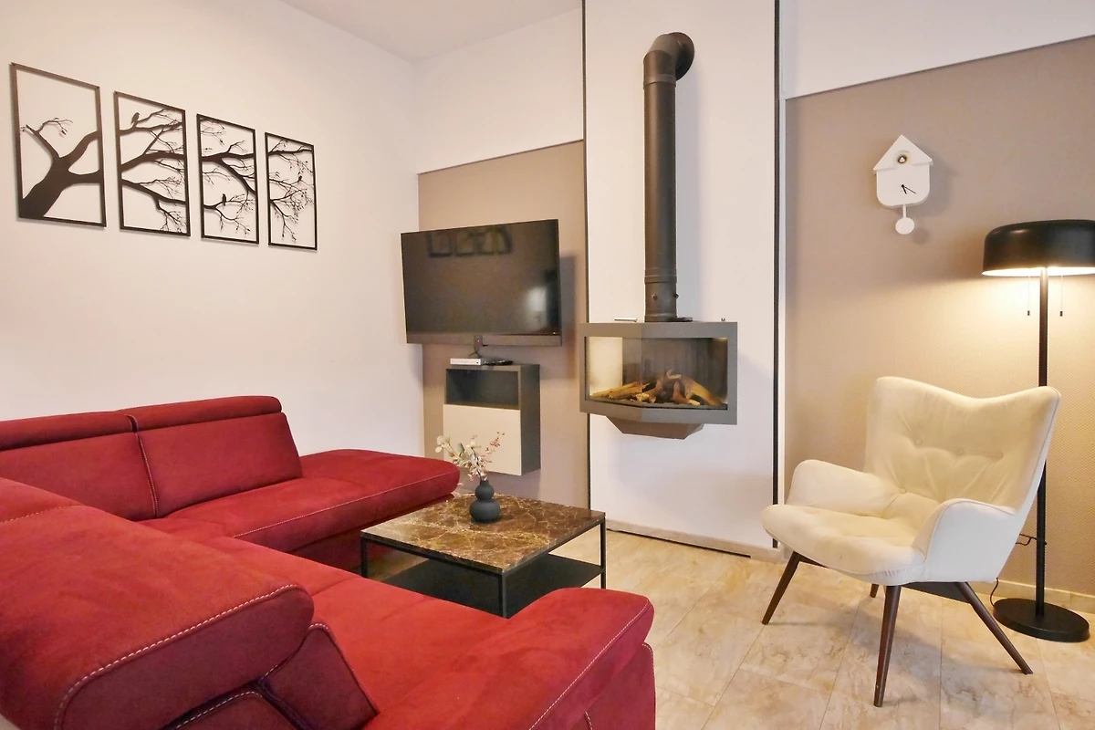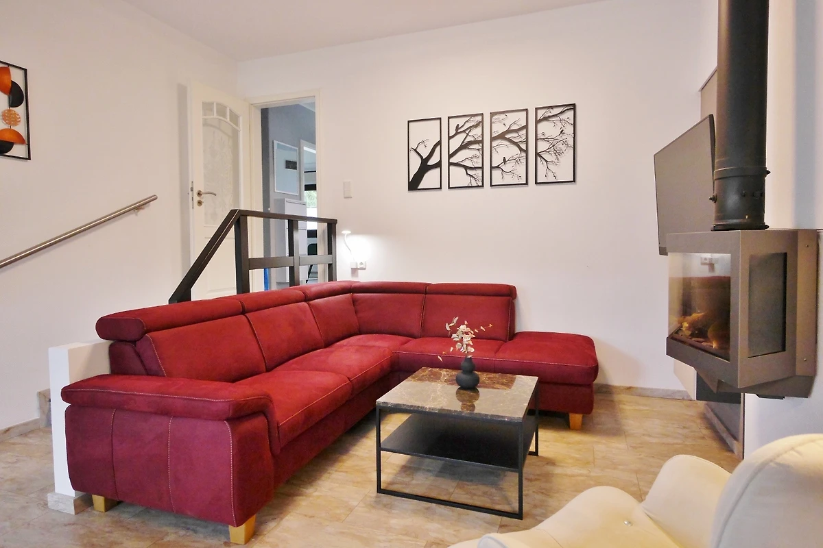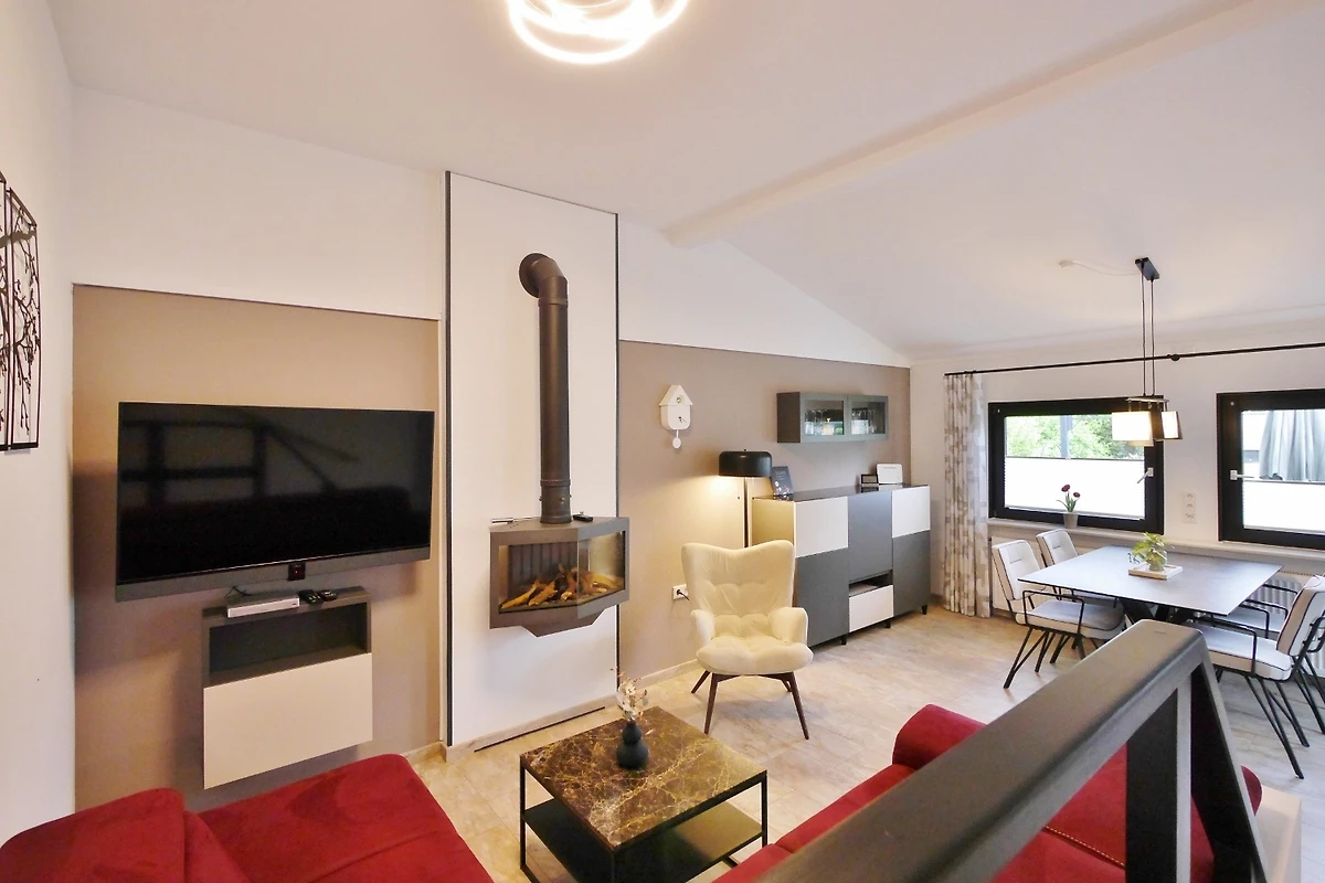 - Wohnzimmer mit Kamin, Essbereich und TV, Hifi, BlueRay.