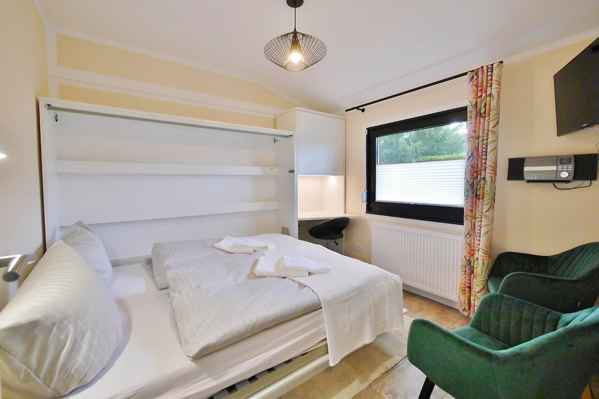 und Schreibtisch. Durch das Schrankbett hat man tagsüber viel Platz zum