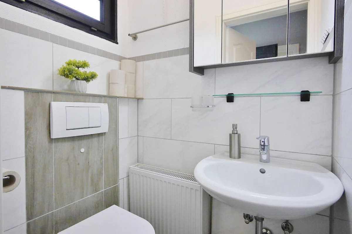 - modernes Duschbad mit ebenerdiger Dusche, Fön, Kosmetikspiegel und Fenster