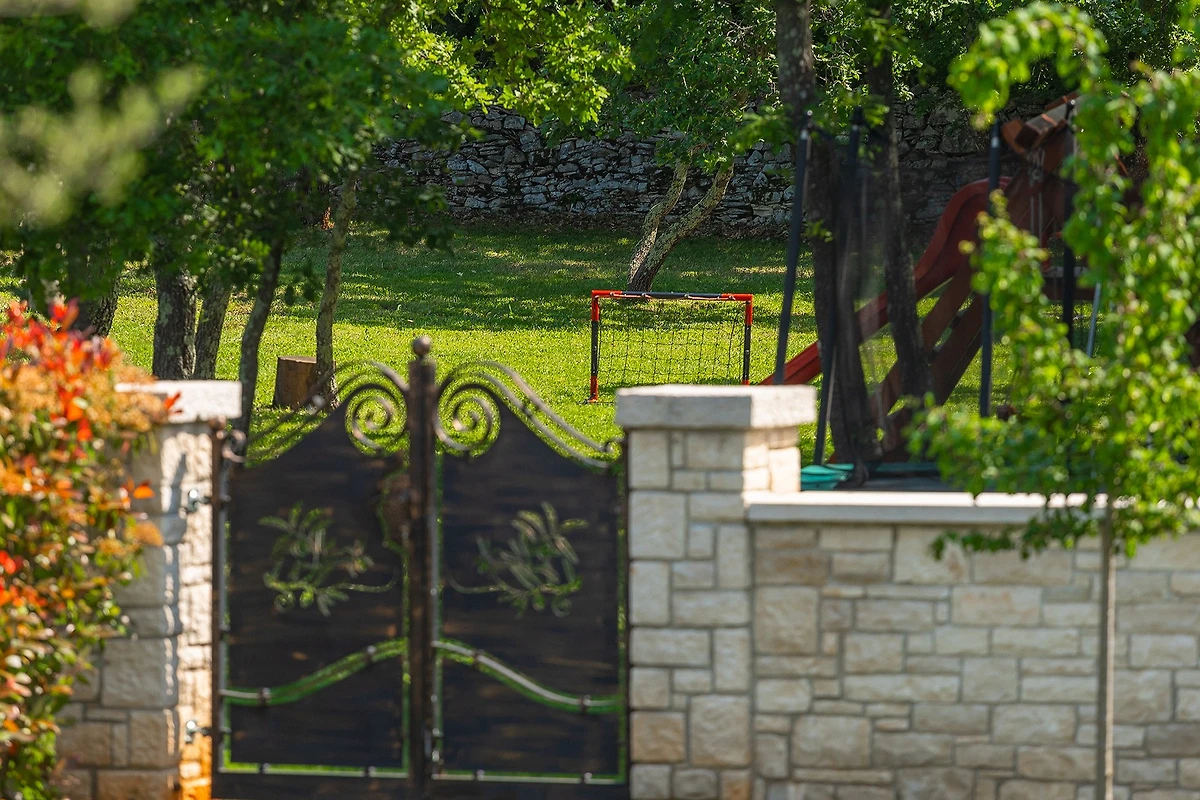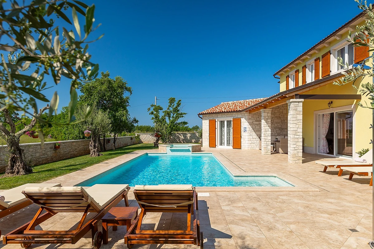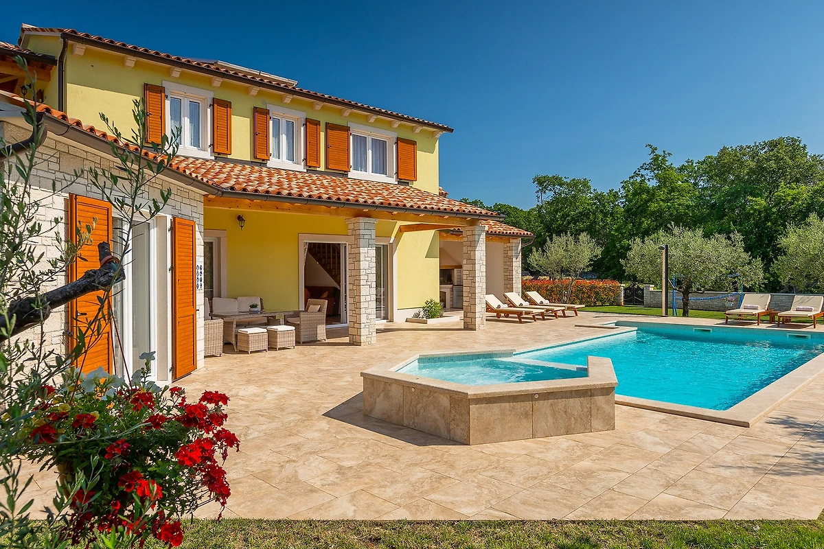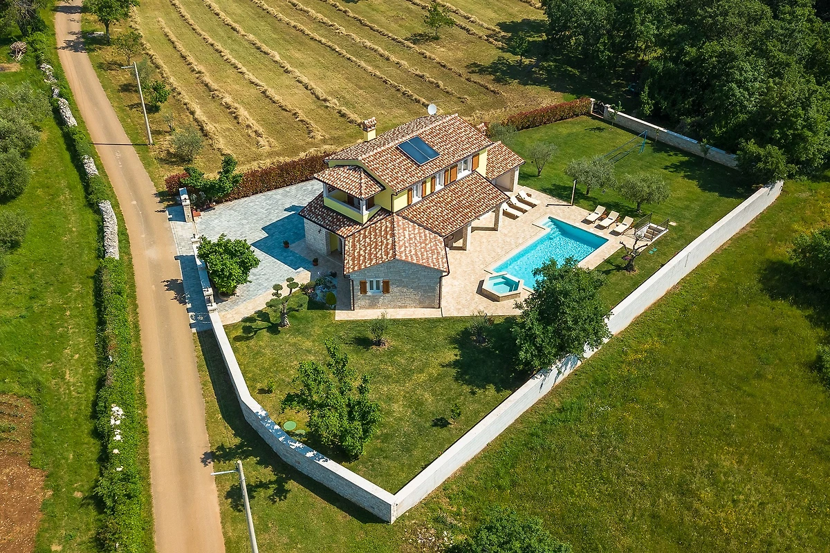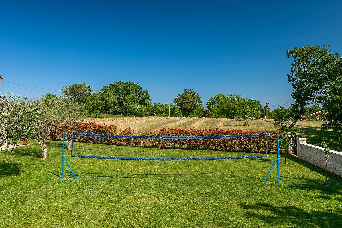 Das Äussere der Villa und der 1300 m² grosse Garten werden Sie auf den ersten Blick überzeugen. Das Anwesen ist weit von den anderen Häusern des Dorfes entfernt. Es ist von allen Seiten von idyllischen Wiesen und Feldern umgeben und bietet Ihnen absolute Ruhe und Privatsphäre. Auf der überdachten Terrasse können Sie mit einem Glas Wein aus der Region anstossen oder in der Sommerküche mit Grill und Mini-Kühlschrank ein Festmahl zubereiten. Das Schwimmbad, in dem Sie von Mai bis Oktober ein erfrischendes Bad nehmen können, hat einen Eingang mit Stufen. Daneben befindet sich ein Whirlpool, den Sie nicht mehr verlassen möchten. Während Sie die Sonne Istriens geniessen, können sich Ihre Kleinen auf dem Spielplatz mit Rutsche und Schaukel im Schatten der umliegenden Bäume vergnügen. Ein Teil des Gartens ist als kleines Fussball- und Volleyballfeld angelegt, so dass der Spass nicht nur den Kleinen vorbehalten bleibt.