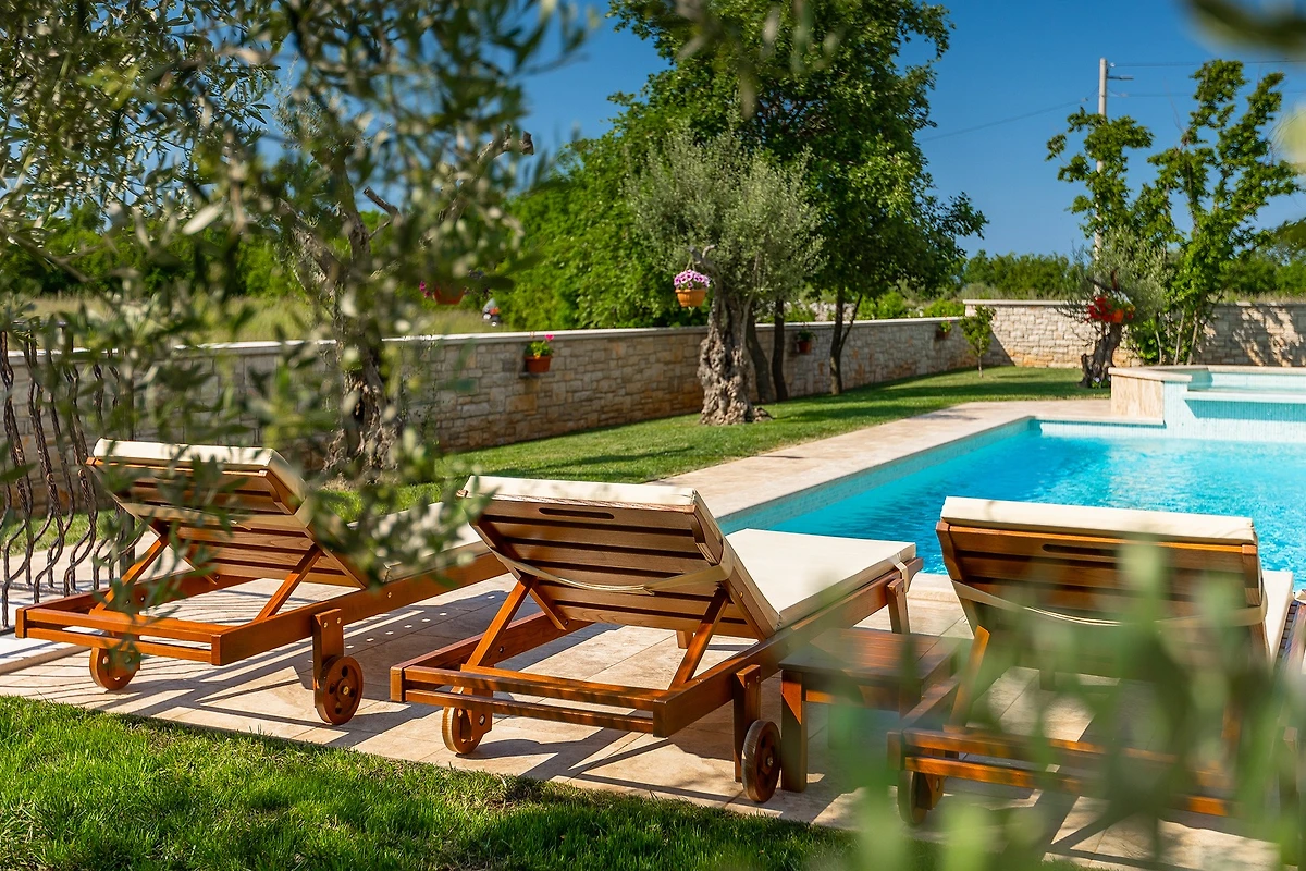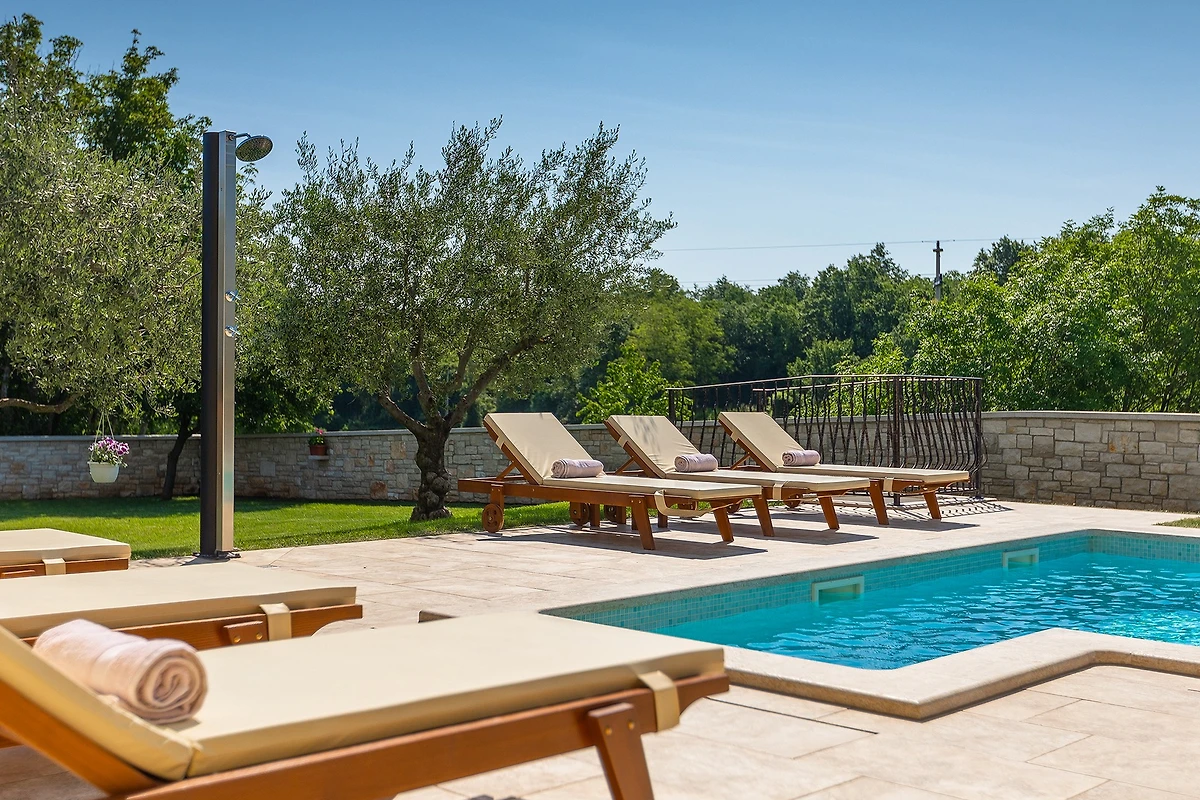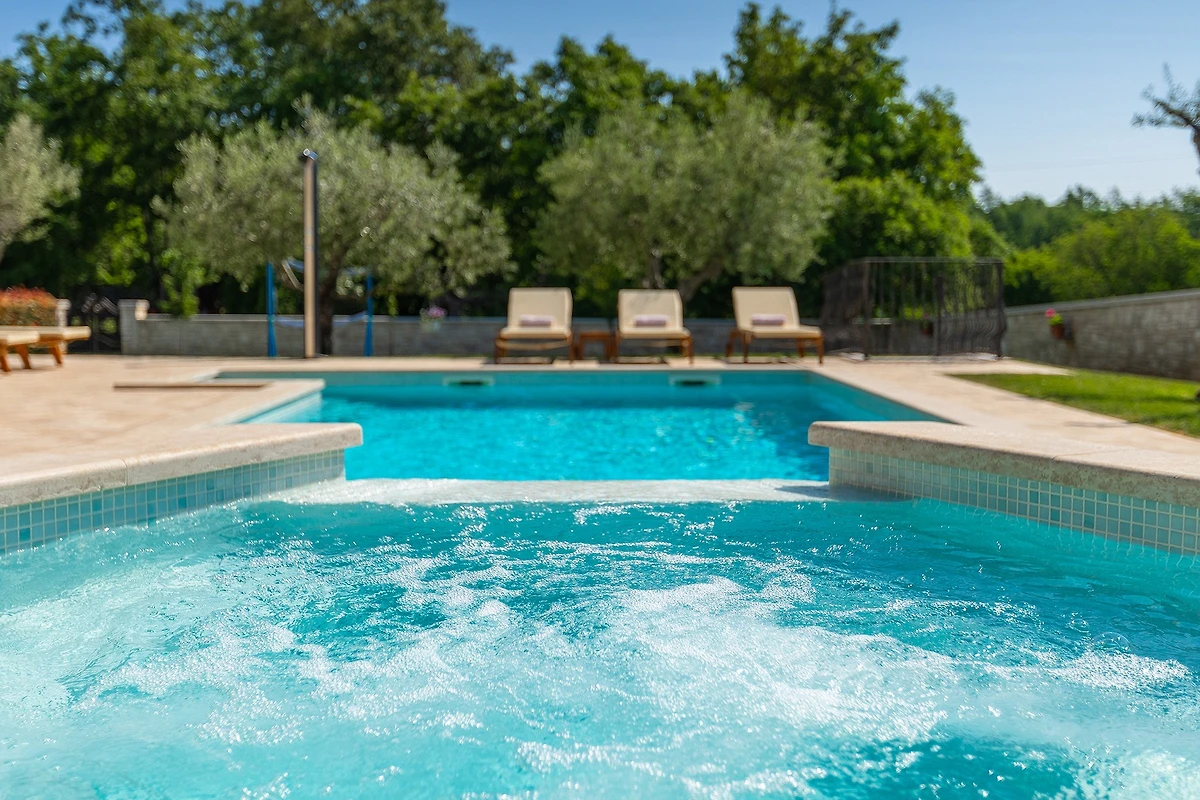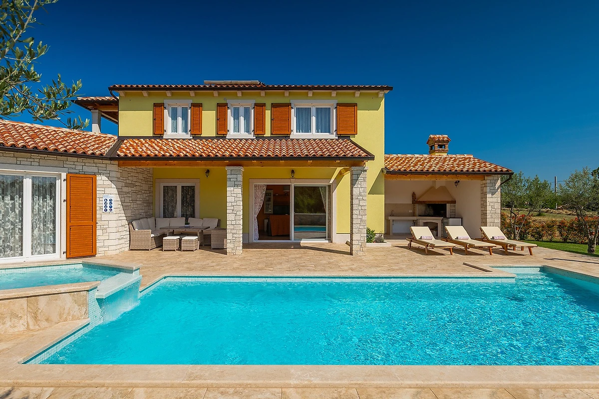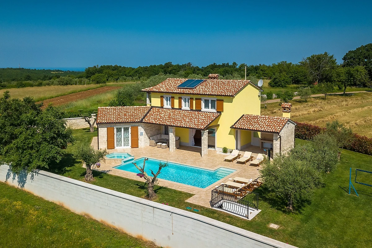 Das Äussere der Villa und der 1300 m² grosse Garten werden Sie auf den ersten Blick überzeugen. Das Anwesen ist weit von den anderen Häusern des Dorfes entfernt. Es ist von allen Seiten von idyllischen Wiesen und Feldern umgeben und bietet Ihnen absolute Ruhe und Privatsphäre. Auf der überdachten Terrasse können Sie mit einem Glas Wein aus der Region anstossen oder in der Sommerküche mit Grill und Mini-Kühlschrank ein Festmahl zubereiten. Das Schwimmbad, in dem Sie von Mai bis Oktober ein erfrischendes Bad nehmen können, hat einen Eingang mit Stufen. Daneben befindet sich ein Whirlpool, den Sie nicht mehr verlassen möchten. Während Sie die Sonne Istriens geniessen, können sich Ihre Kleinen auf dem Spielplatz mit Rutsche und Schaukel im Schatten der umliegenden Bäume vergnügen. Ein Teil des Gartens ist als kleines Fussball- und Volleyballfeld angelegt, so dass der Spass nicht nur den Kleinen vorbehalten bleibt.