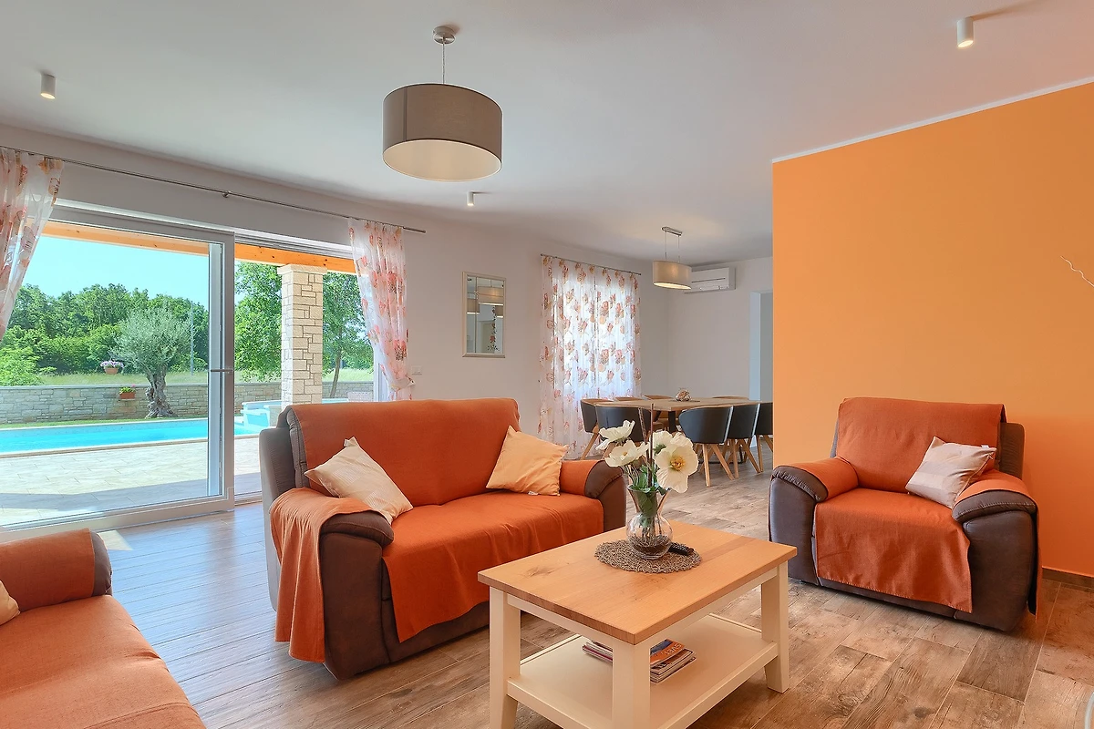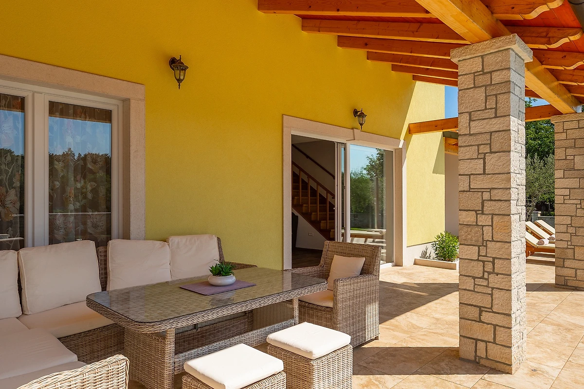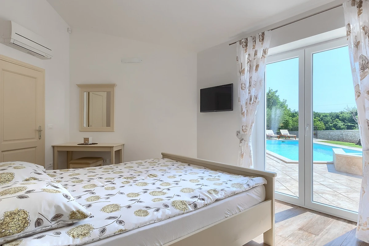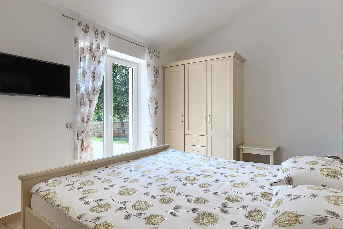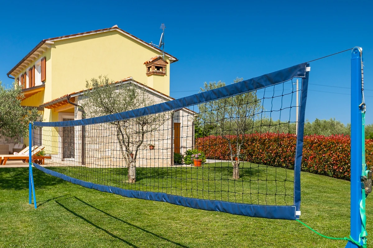 Das Äussere der Villa und der 1300 m² grosse Garten werden Sie auf den ersten Blick überzeugen. Das Anwesen ist weit von den anderen Häusern des Dorfes entfernt. Es ist von allen Seiten von idyllischen Wiesen und Feldern umgeben und bietet Ihnen absolute Ruhe und Privatsphäre. Auf der überdachten Terrasse können Sie mit einem Glas Wein aus der Region anstossen oder in der Sommerküche mit Grill und Mini-Kühlschrank ein Festmahl zubereiten. Das Schwimmbad, in dem Sie von Mai bis Oktober ein erfrischendes Bad nehmen können, hat einen Eingang mit Stufen. Daneben befindet sich ein Whirlpool, den Sie nicht mehr verlassen möchten. Während Sie die Sonne Istriens geniessen, können sich Ihre Kleinen auf dem Spielplatz mit Rutsche und Schaukel im Schatten der umliegenden Bäume vergnügen. Ein Teil des Gartens ist als kleines Fussball- und Volleyballfeld angelegt, so dass der Spass nicht nur den Kleinen vorbehalten bleibt.