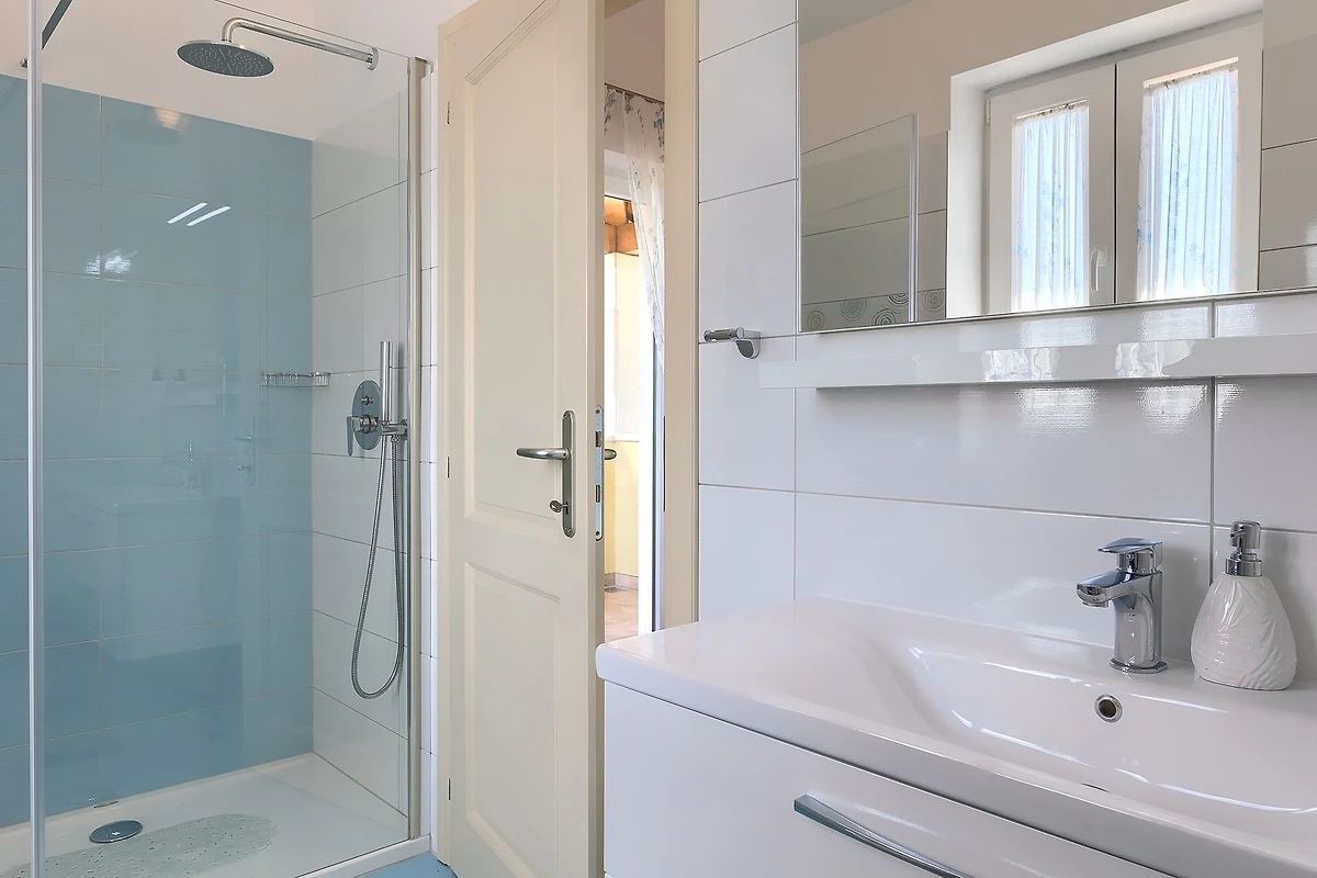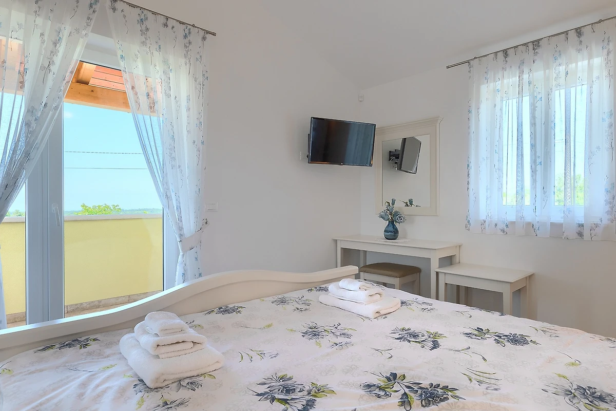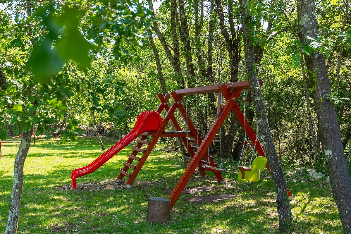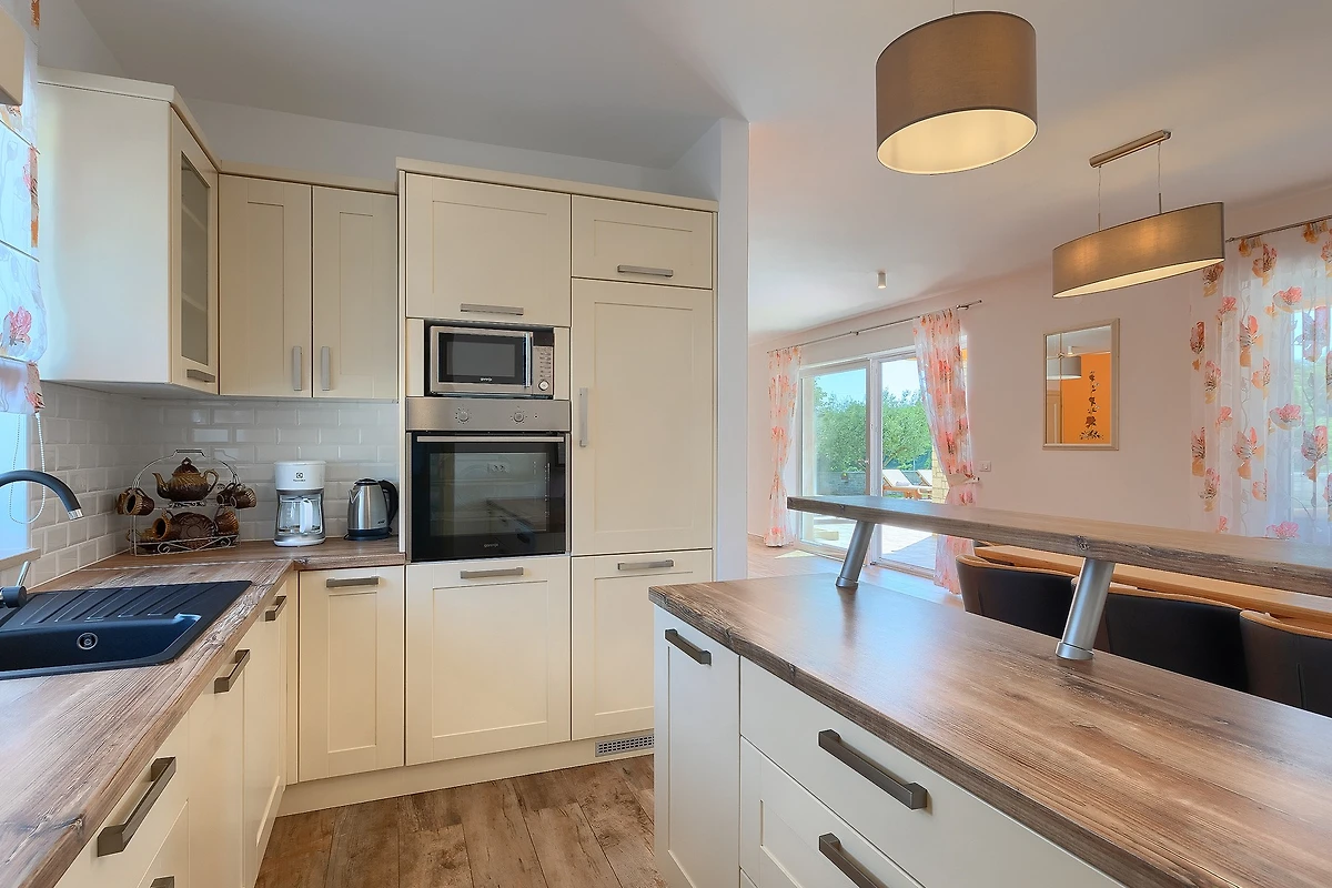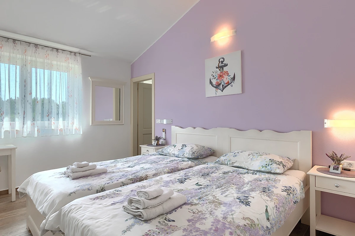 Das Äussere der Villa und der 1300 m² grosse Garten werden Sie auf den ersten Blick überzeugen. Das Anwesen ist weit von den anderen Häusern des Dorfes entfernt. Es ist von allen Seiten von idyllischen Wiesen und Feldern umgeben und bietet Ihnen absolute Ruhe und Privatsphäre. Auf der überdachten Terrasse können Sie mit einem Glas Wein aus der Region anstossen oder in der Sommerküche mit Grill und Mini-Kühlschrank ein Festmahl zubereiten. Das Schwimmbad, in dem Sie von Mai bis Oktober ein erfrischendes Bad nehmen können, hat einen Eingang mit Stufen. Daneben befindet sich ein Whirlpool, den Sie nicht mehr verlassen möchten. Während Sie die Sonne Istriens geniessen, können sich Ihre Kleinen auf dem Spielplatz mit Rutsche und Schaukel im Schatten der umliegenden Bäume vergnügen. Ein Teil des Gartens ist als kleines Fussball- und Volleyballfeld angelegt, so dass der Spass nicht nur den Kleinen vorbehalten bleibt.