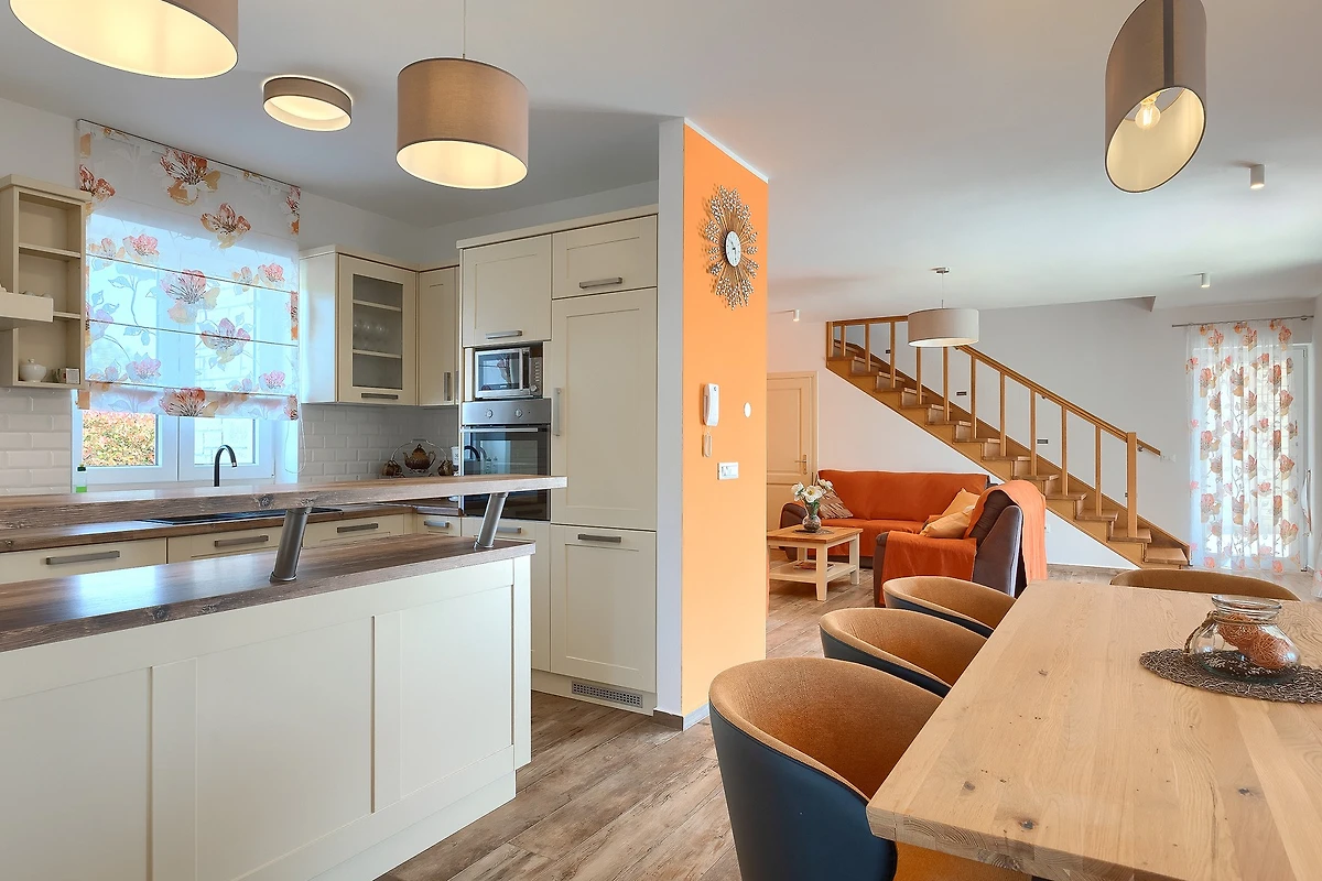 Im Erdgeschoss fällt als erstes die Kombination aus warmer und moderner Atmosphäre und das Licht auf, das durch den gesamten offenen Wohnbereich fliesst. Zwei grosse Glastüren, die auf die Terrasse führen, sind an der Wand angebracht und lassen natürliches Licht in das Wohnzimmer, die Küche und den Essbereich strömen. Das Wohnzimmer ist teilweise durch eine halbe Wand von der Küche getrennt, und das Sofa bietet bequem Platz für bis zu 6 Personen. Während Sie mit Ihrer Familie oder Freunden im Wohnzimmer oder am grossen Esstisch sitzen, können Sie den Blick auf den Pool, den Garten und die mediterrane Vegetation geniessen. Bereiten Sie Ihre Spezialitäten in der voll ausgestatteten Küche mit Induktionskochfeld zu oder servieren Sie Ihren Morgenkaffee an der Küchentheke mit einem unschlagbaren Ausblick.