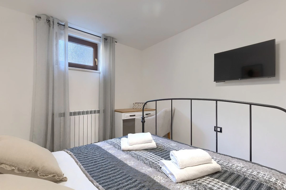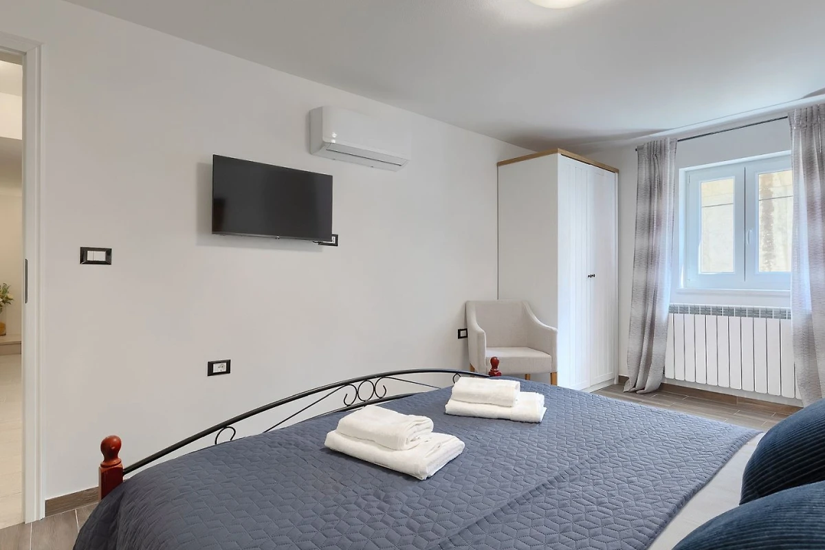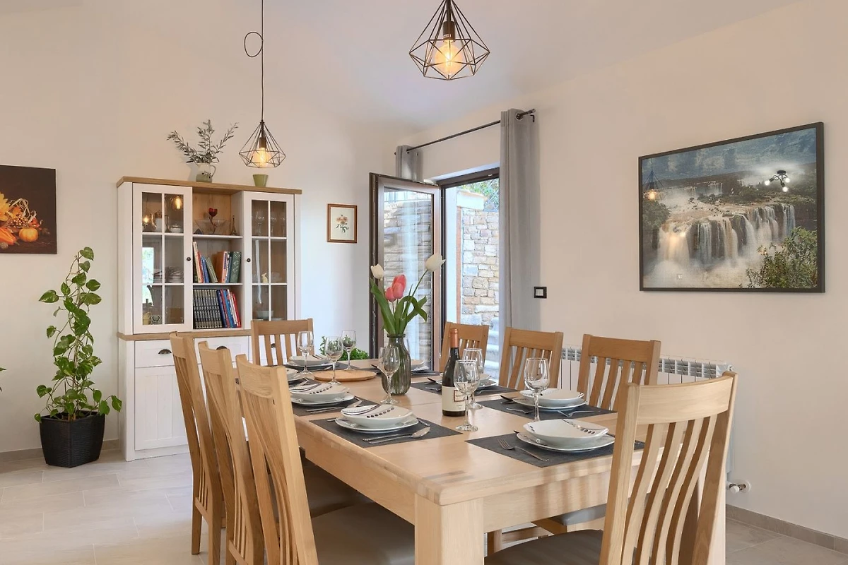 Im zweiten Stock der Villa finden Sie ein geräumiges Wohnzimmer mit einer Sitzecke für 8 Personen. Dank dem grossen Fernseher und vielen Multimedia-Optionen ist dies ein idealer Ort für Familientreffen. Es gibt auch einen Essbereich mit einem grossen Tisch für 8 Personen und eine moderne Küche mit allem, was Sie für die Zubereitung eines herzhaften Frühstücks oder der unverzichtbaren Tasse frischen Kaffees am Morgen benötigen. Die Villa ist mit modernen Möbeln und stilvollen Elementen ausgestattet, so dass Sie sich hier jederzeit wohlfühlen werden, und die istrischen Steinelemente sorgen für eine angenehme Frische an heissen Sommertagen.