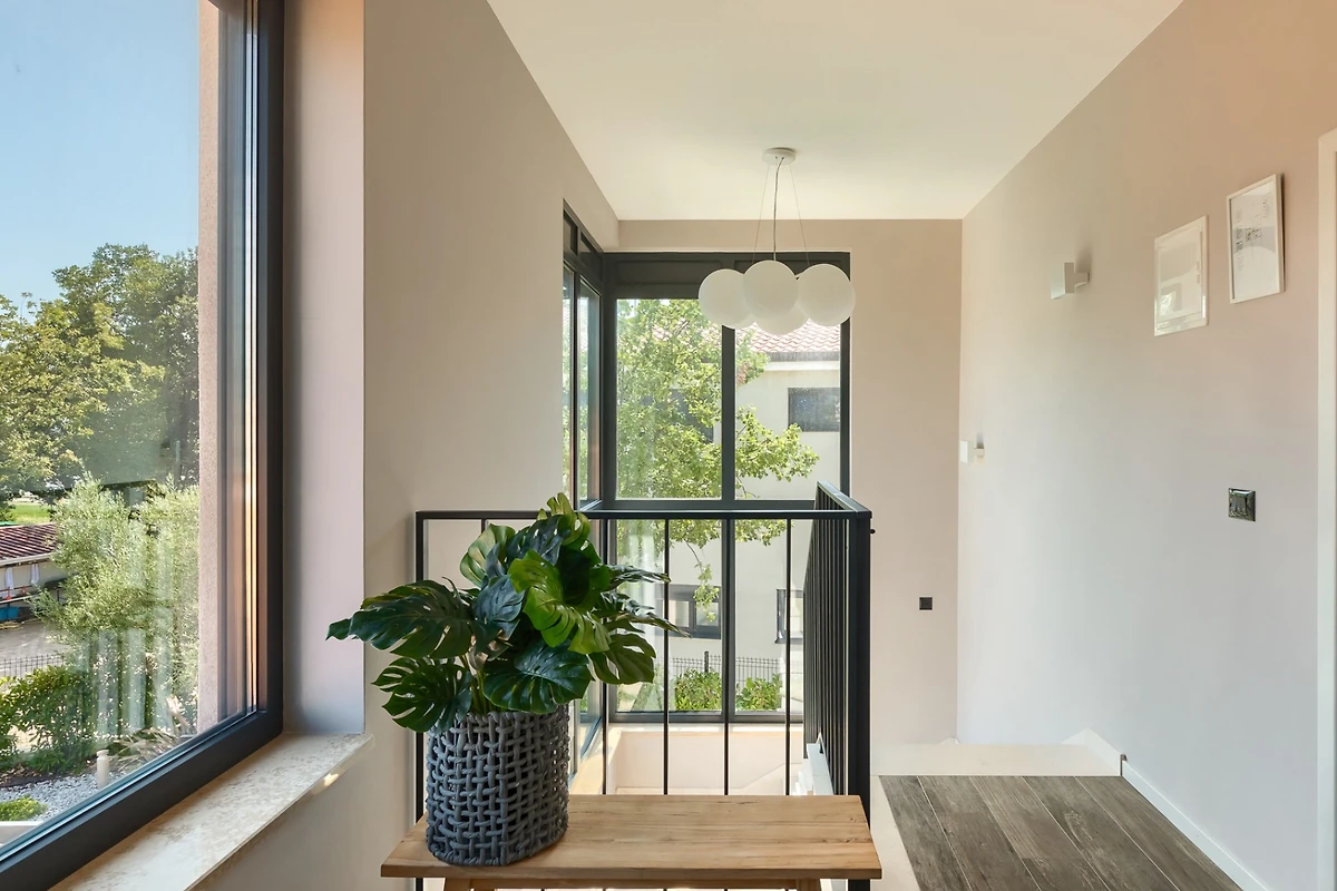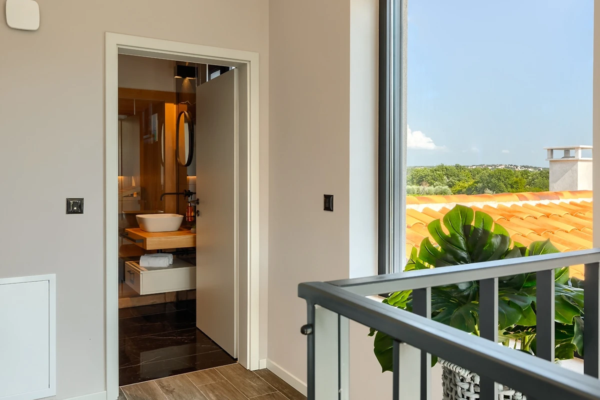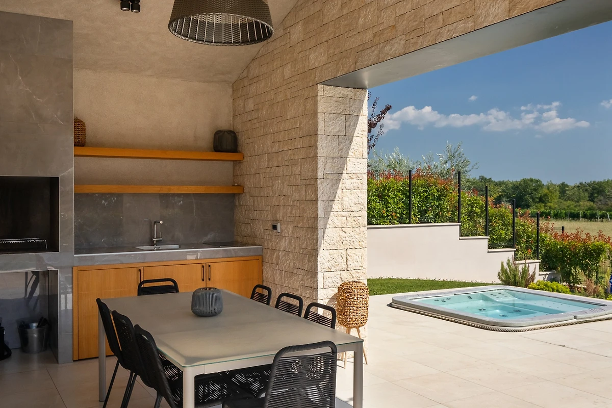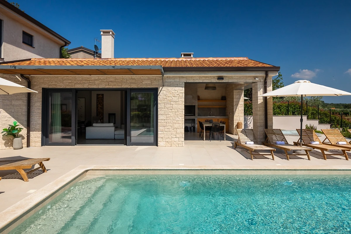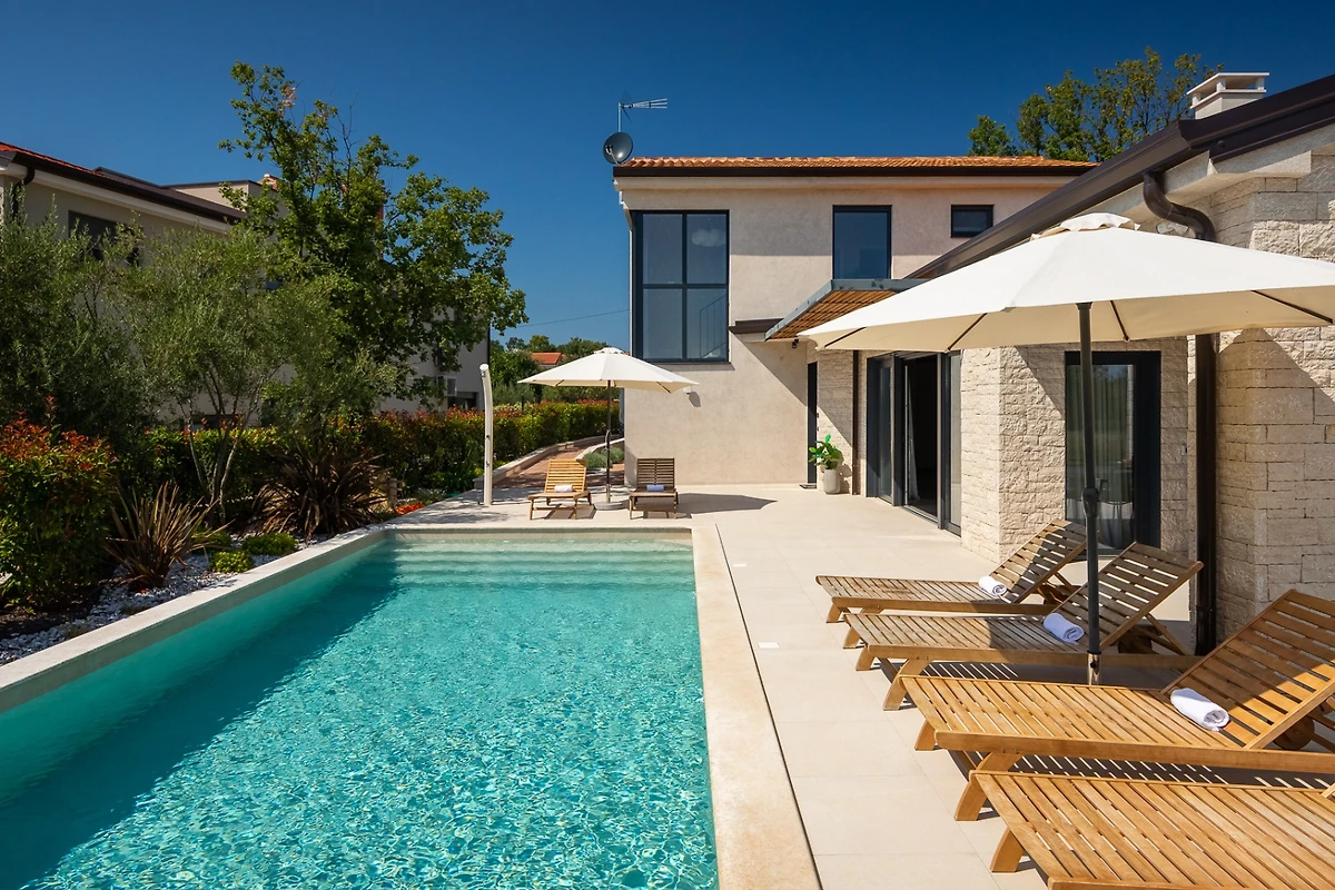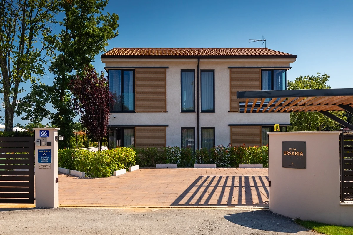 Die Villa Ursaria befindet sich am Rande des ruhigen Dorfes Kadumi, nicht weit von Poreč entfernt. Diese moderne Villa verfügt über 4 Schlafzimmer und 4 Bäder und ist für 8 Personen geeignet. Es hat ein modernes Äusseres in Erdtönen und kontrastierenden Materialien wie Stein und Stahl. Von jeder Ecke des Hauses aus kann man auf die Terrasse blicken, die von üppiger mediterraner Vegetation umgeben ist.