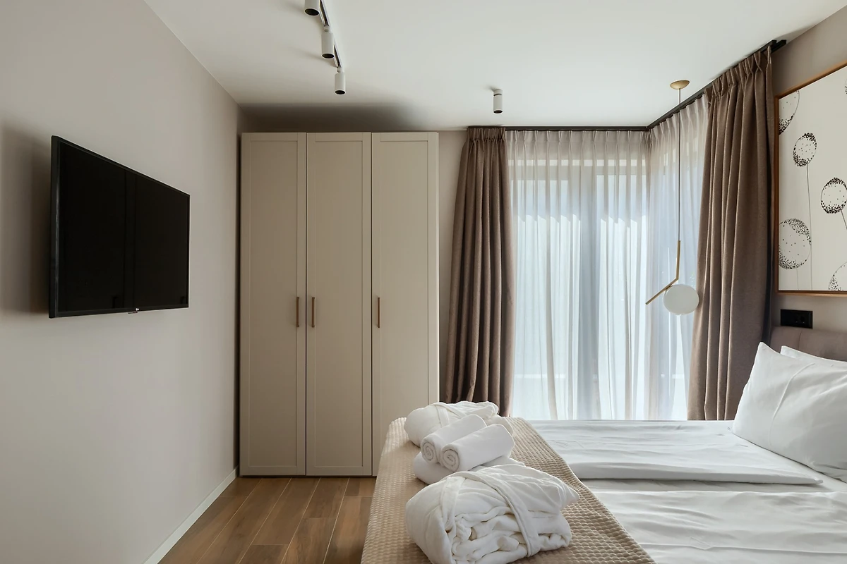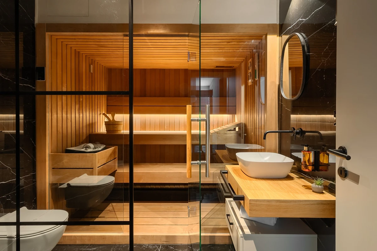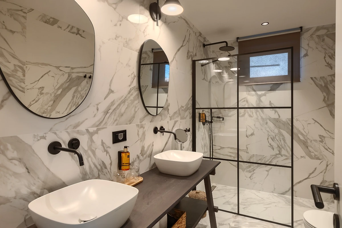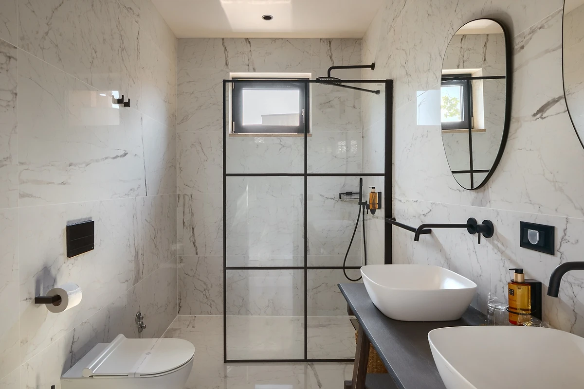 Villa Ursaria hat 4 Schlafzimmer, 2 im Erdgeschoss und 2 im ersten Stock. Jedes Schlafzimmer hat ein Doppelbett und ein eigenes Bad. In jedem Badezimmer finden Sie 2 Waschbecken und eine Duschkabine, sowie Toilettenartikel, einen Haartrockner und Bademäntel. Alle Zimmer und Bäder sind in der gleichen minimalistischen, sauberen Ästhetik gehalten wie der Rest der Villa. Im ersten Stock des Hauses finden Sie ausserdem einen Wellnessbereich mit finnischer Sauna und eigenem Bad.
