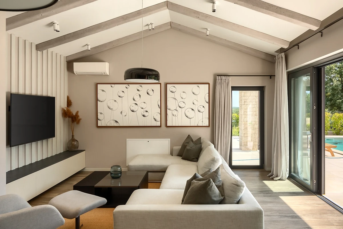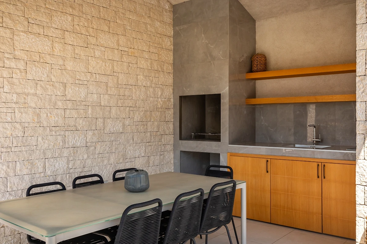 Dieses Ferienhaus erstreckt sich auf 180 m² und besteht aus 2 Etagen. Im Erdgeschoss befindet sich ein heller offener Raum, bestehend aus Wohnzimmer, voll ausgestatteter Küche und Esstisch mit 8 Stühlen. Grosse Fenster, die sich über die gesamte Wand des Wohnzimmers erstrecken, sorgen für ständiges natürliches Licht und machen den Raum angenehm. Ausserdem blicken die Fenster auf die Aussenterrasse mit dem Pool. Der Raum wird von neutralen, hellen Tönen dominiert, die eine entspannte und gemütliche Atmosphäre schaffen. Alle Räume sind klimatisiert und für kältere Tage gibt es einen Kamin und eine Fussbodenheizung.