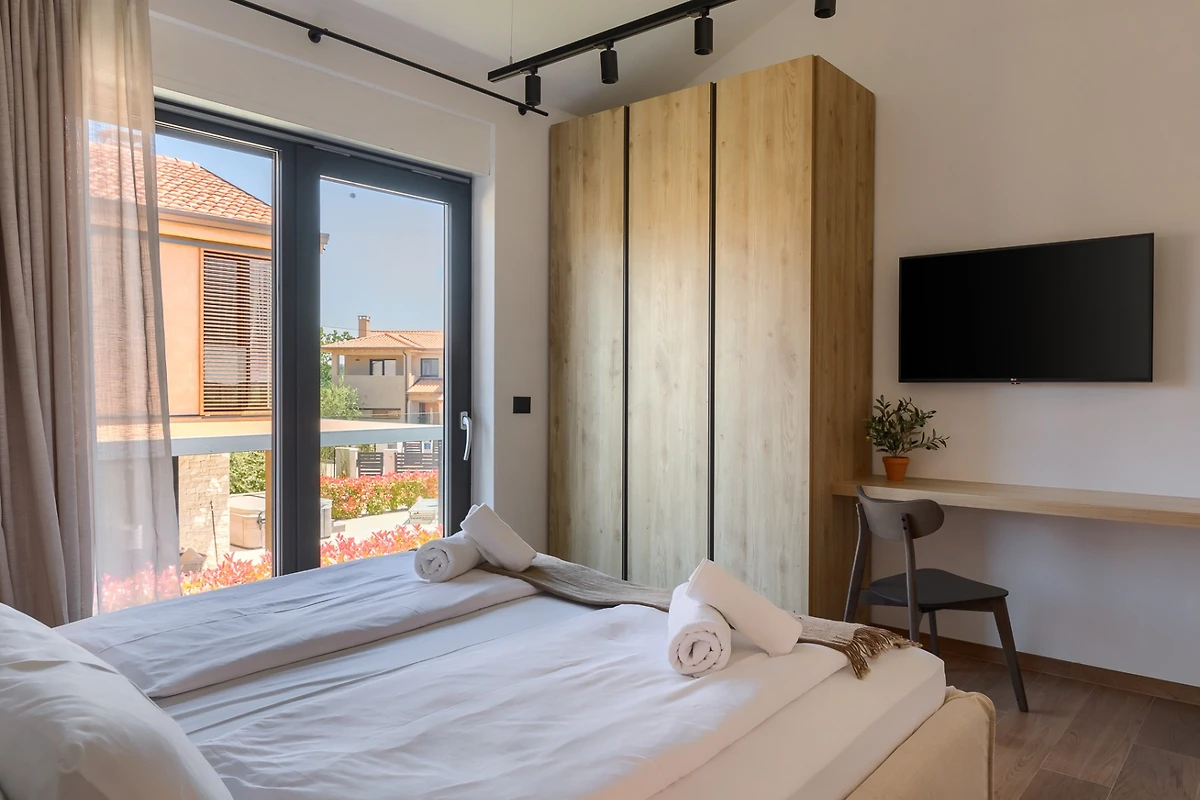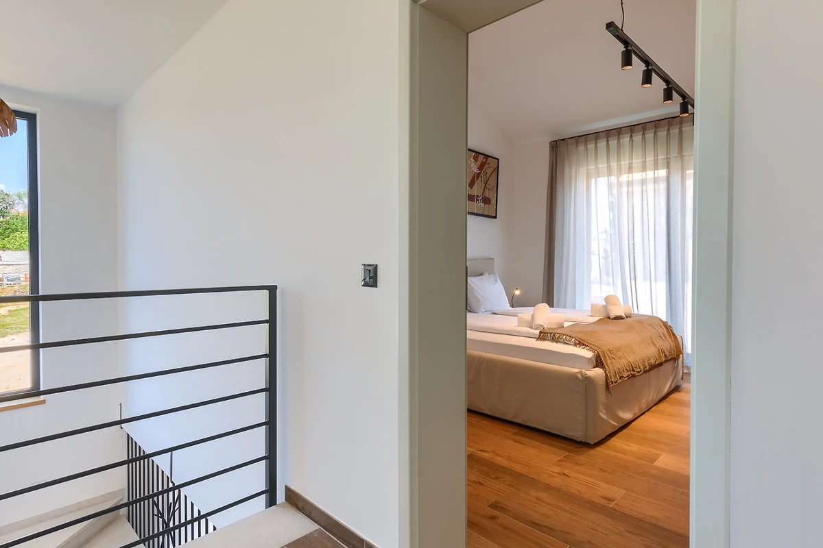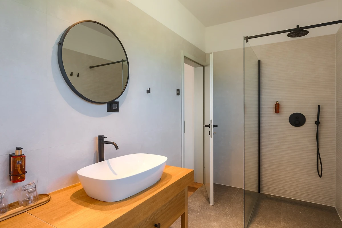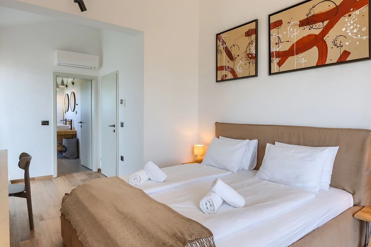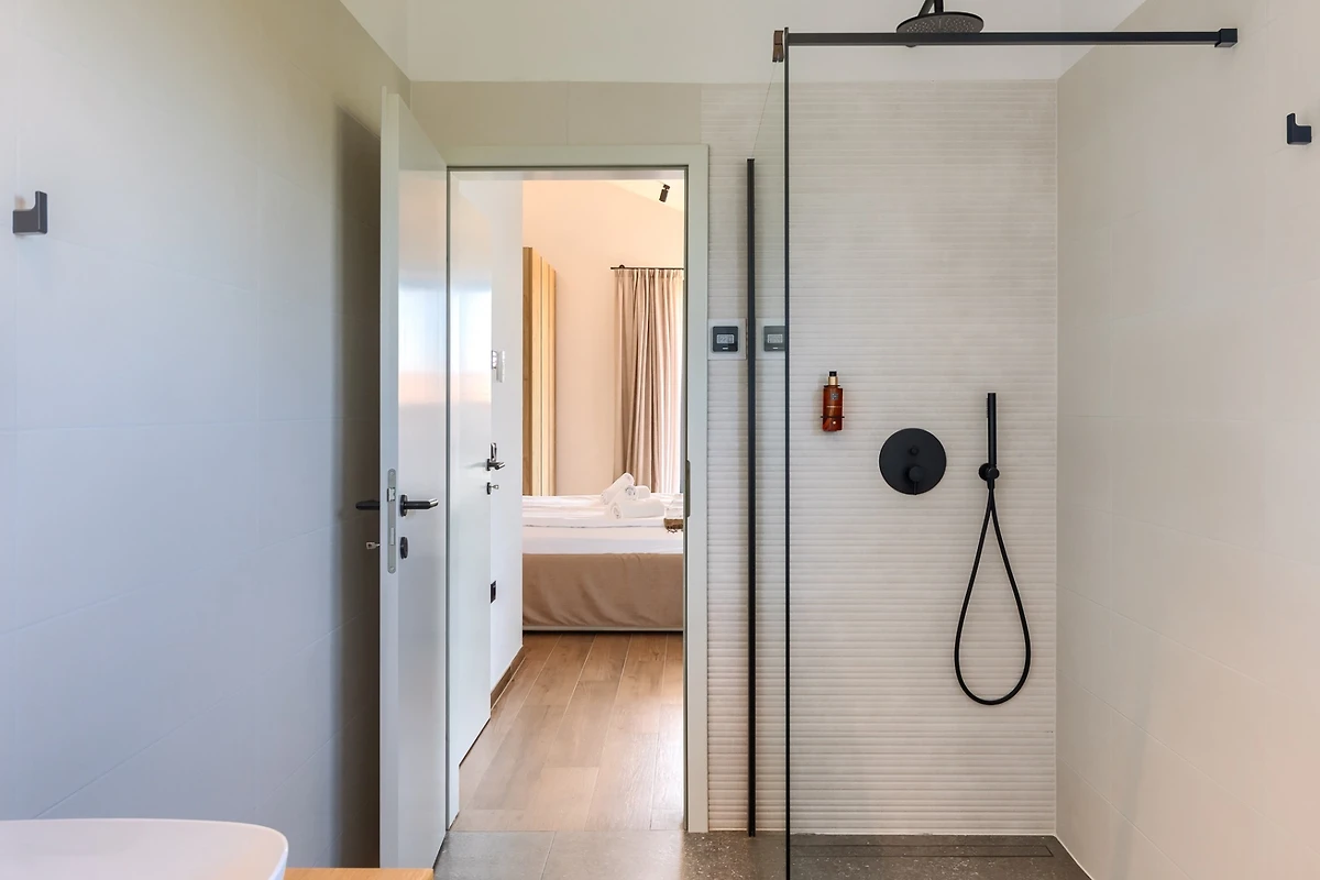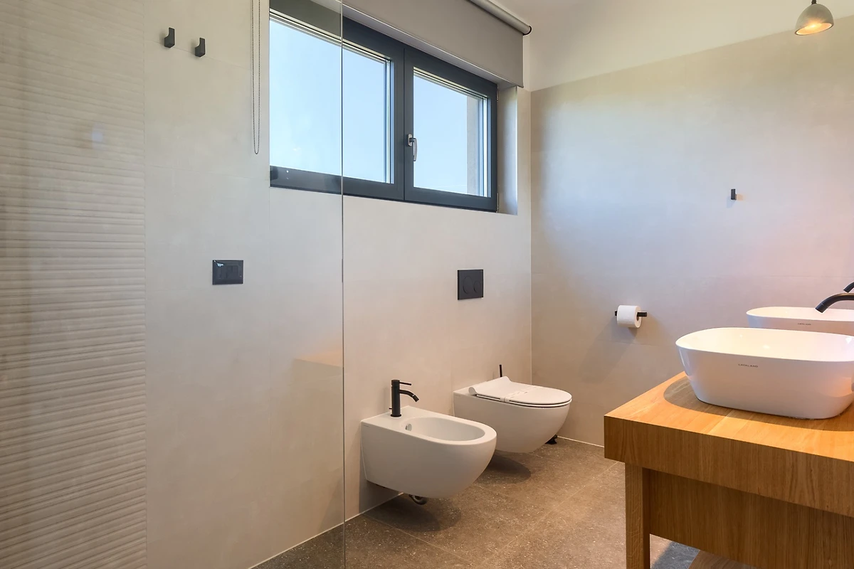 Villa Albona hat 3 Schlafzimmer im ersten Stock. Jedes Schlafzimmer hat ein Doppelbett und ein eigenes Bad. In jedem Badezimmer finden Sie 2 Waschbecken und eine Duschkabine, sowie Toilettenartikel, einen Haartrockner und Bademäntel. Alle Zimmer und Bäder sind in der gleichen minimalistischen, sauberen Ästhetik gehalten wie der Rest der Villa. Im Erdgeschoss des Hauses finden Sie ausserdem einen Wellnessbereich mit finnischer Sauna und eigenem Bad.