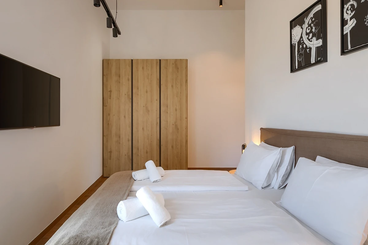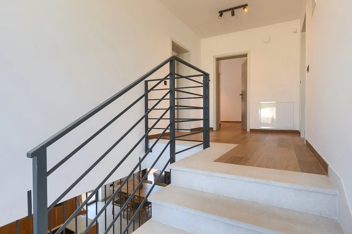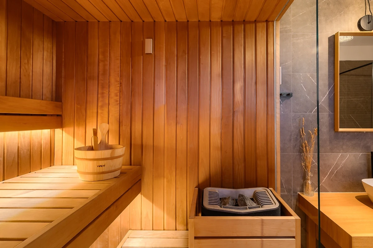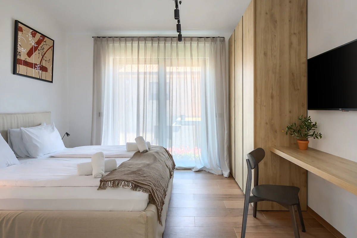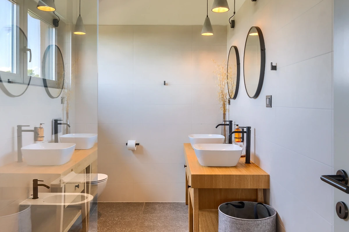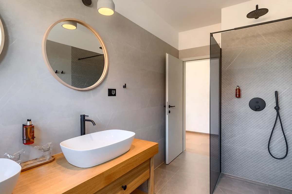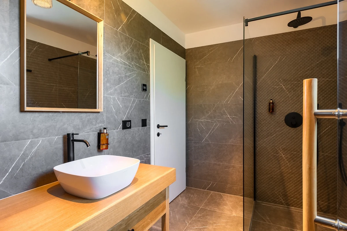 Villa Albona hat 3 Schlafzimmer im ersten Stock. Jedes Schlafzimmer hat ein Doppelbett und ein eigenes Bad. In jedem Badezimmer finden Sie 2 Waschbecken und eine Duschkabine, sowie Toilettenartikel, einen Haartrockner und Bademäntel. Alle Zimmer und Bäder sind in der gleichen minimalistischen, sauberen Ästhetik gehalten wie der Rest der Villa. Im Erdgeschoss des Hauses finden Sie ausserdem einen Wellnessbereich mit finnischer Sauna und eigenem Bad.