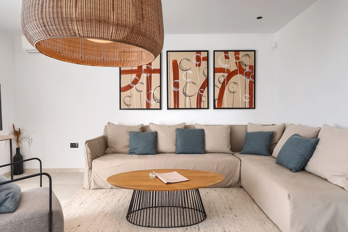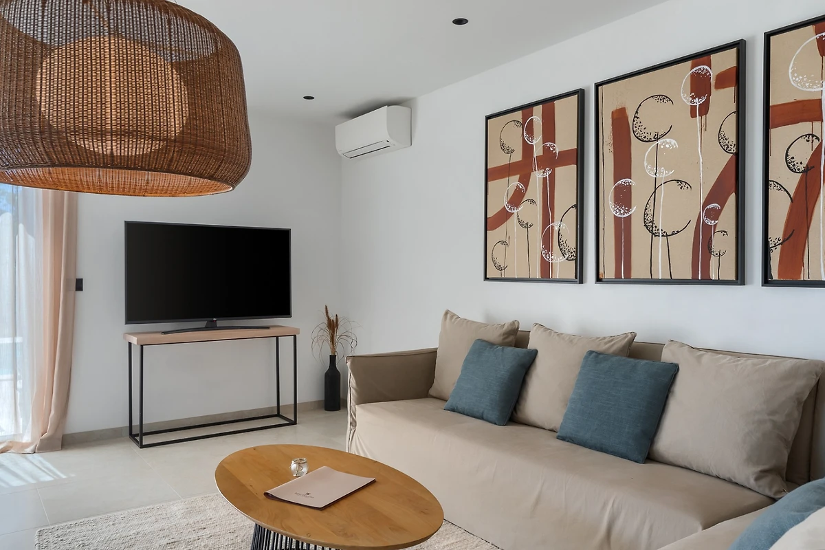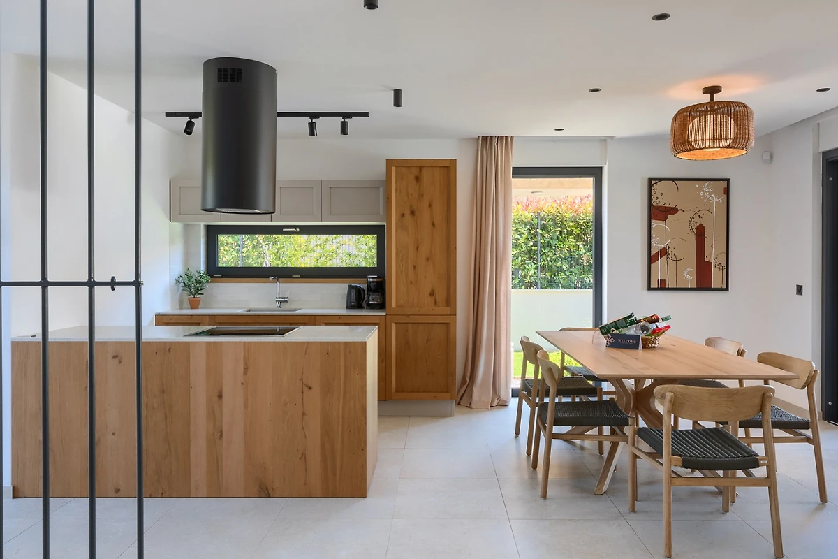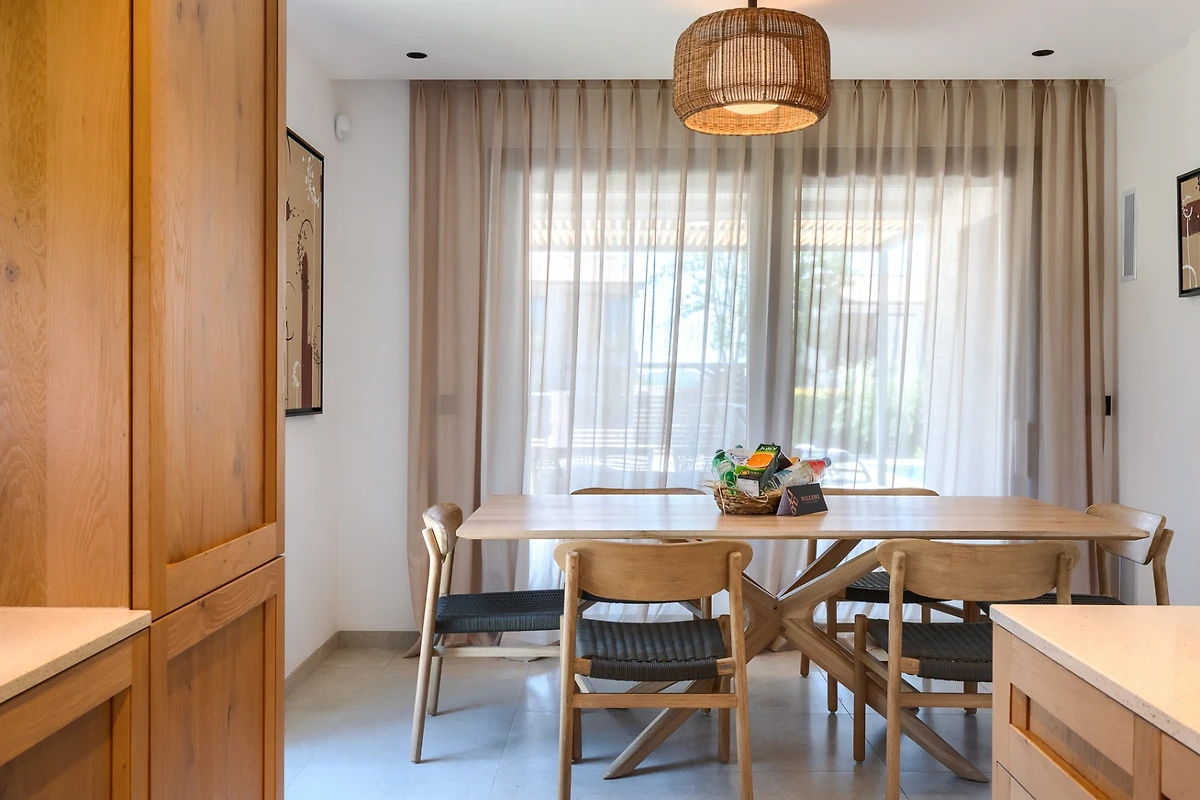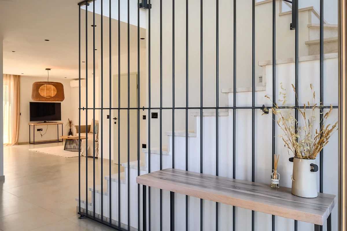 Dieses Ferienhaus erstreckt sich auf 175 m² und besteht aus 2 Etagen. Im Erdgeschoss befindet sich ein heller offener Raum, bestehend aus Wohnzimmer, voll ausgestatteter Küche und Esstisch mit 6 Stühlen. Grosse Fenster sorgen für ständiges natürliches Licht und machen den Raum angenehm. Ausserdem blicken die Fenster auf die Aussenterrasse mit dem Pool. Der Raum wird von neutralen, hellen Tönen dominiert, die eine entspannte und gemütliche Atmosphäre schaffen. Die Inneneinrichtung ist reich an industriellen Details, die mit der Wärme der Holzelemente kontrastieren. Alle Räume sind klimatisiert und für kältere Tage gibt es einen Kamin und eine Fussbodenheizung.