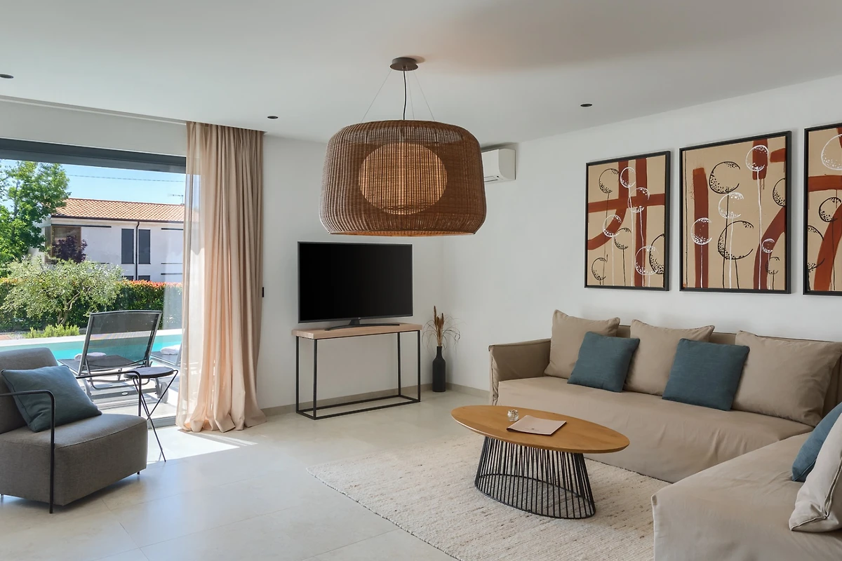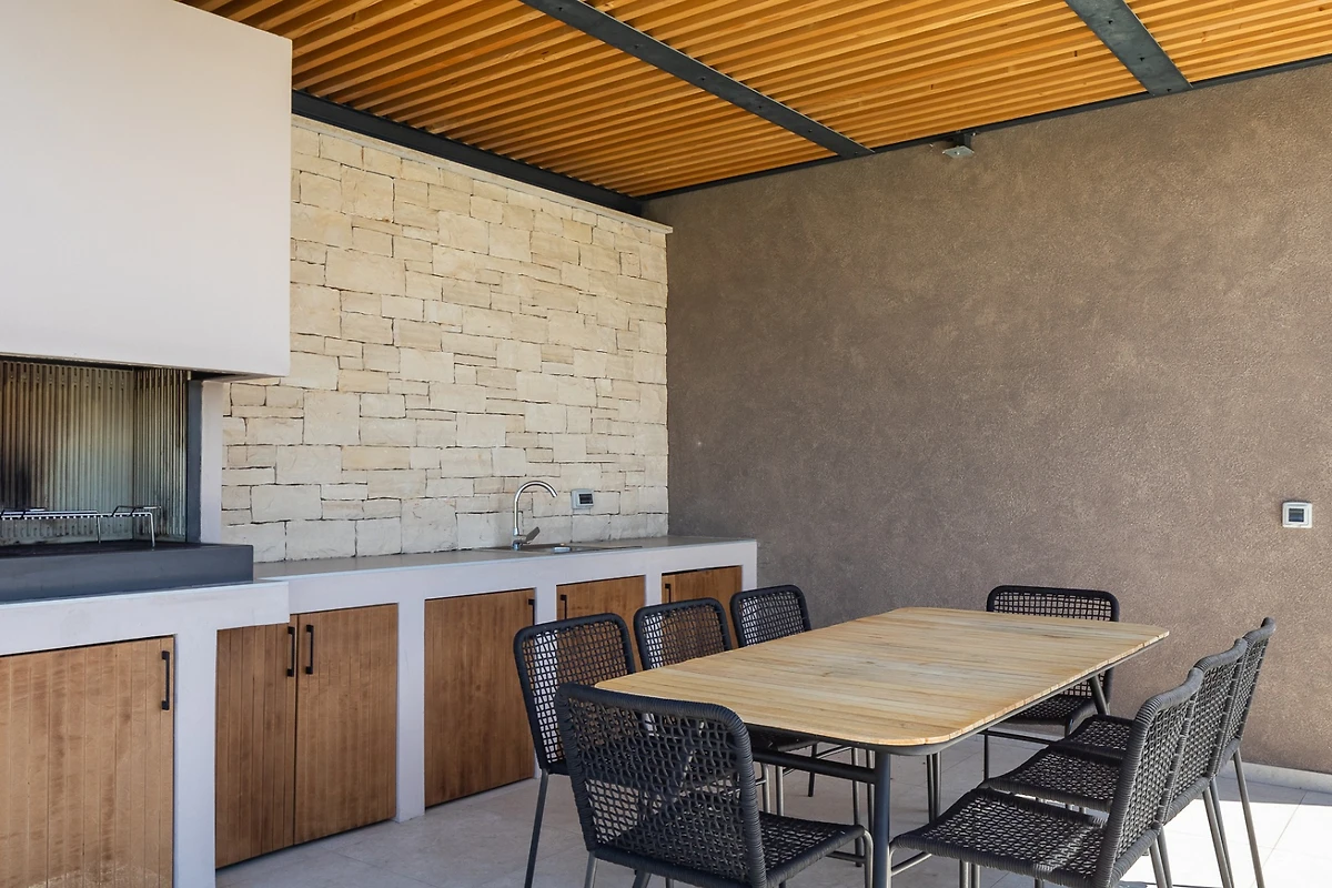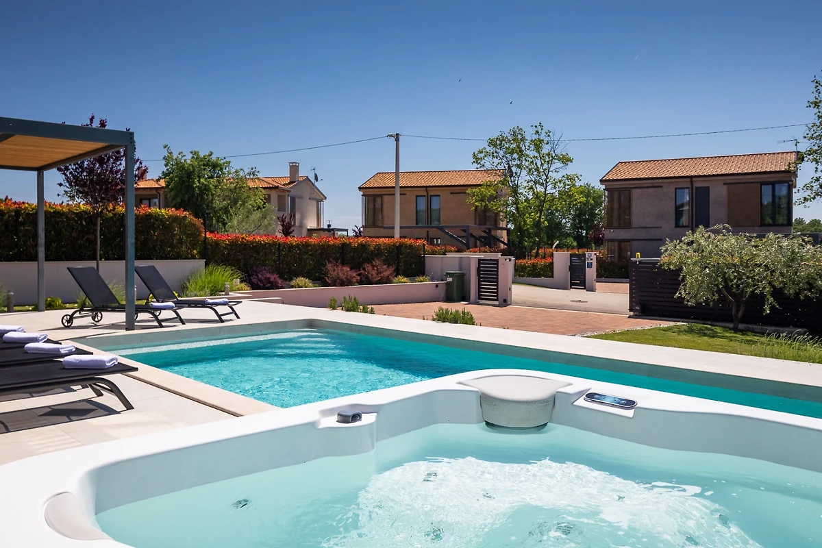 Die Villa ist von einem 740 m² grossen, umzäunten Garten umgeben, in dem Sie einen 32 m² grossen Salzwasserpool, einen Aussen-Whirlpool und 6 Liegen zum Entspannen und Sonnenbaden finden. Wenn Sie in der Nebensaison in der Villa übernachten und schwimmen möchten, brauchen Sie sich keine Sorgen zu machen. Es gibt eine Option, um den Pool zu beheizen. Die Villa verfügt auch über eine überdachte Terrasse mit Sommerküche, Grill und Esstisch mit 6 Stühlen. Es gibt auch einen Entspannungsbereich mit Gartenmöbeln, ideal für abendliche Zusammenkünfte mit einem guten Glas Wein. Ein privater Parkplatz für maximal 2 Fahrzeuge ist ebenfalls vorhanden.