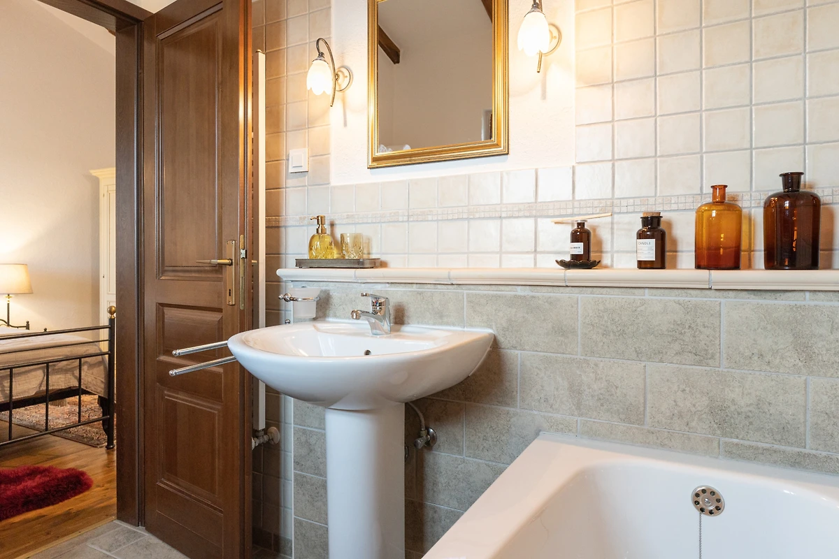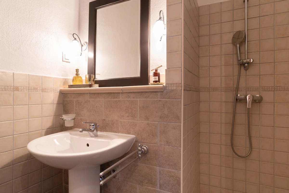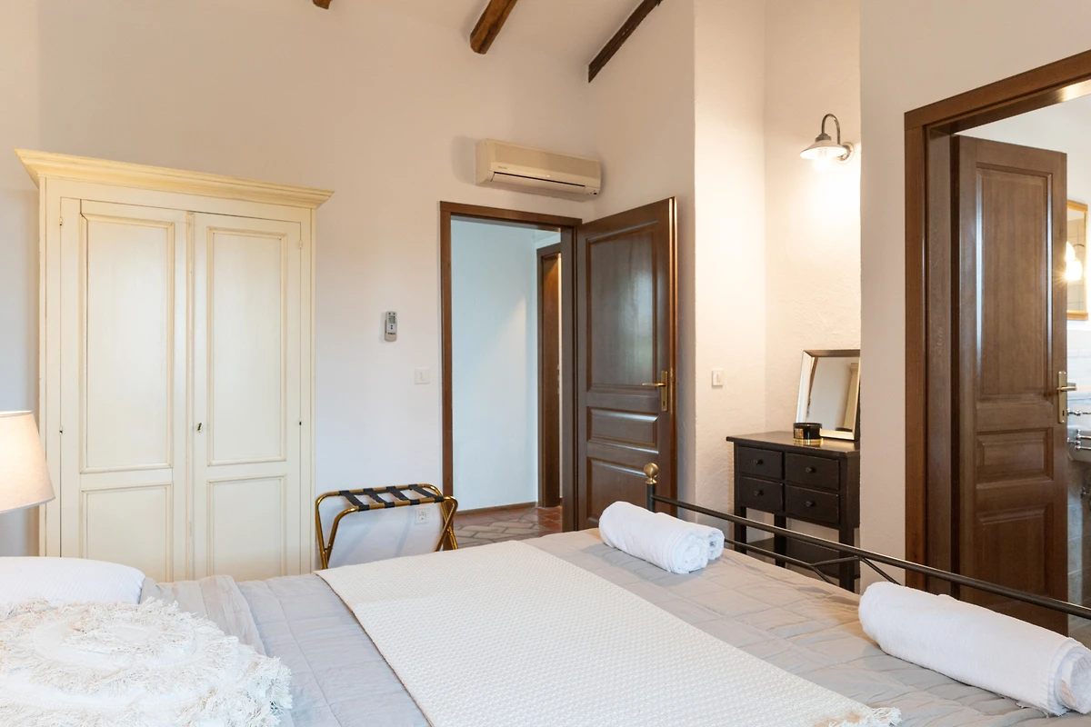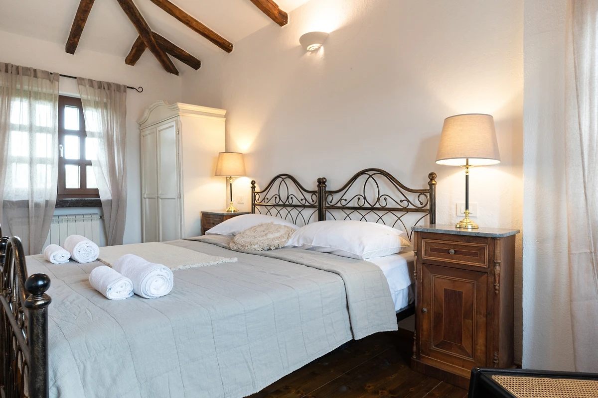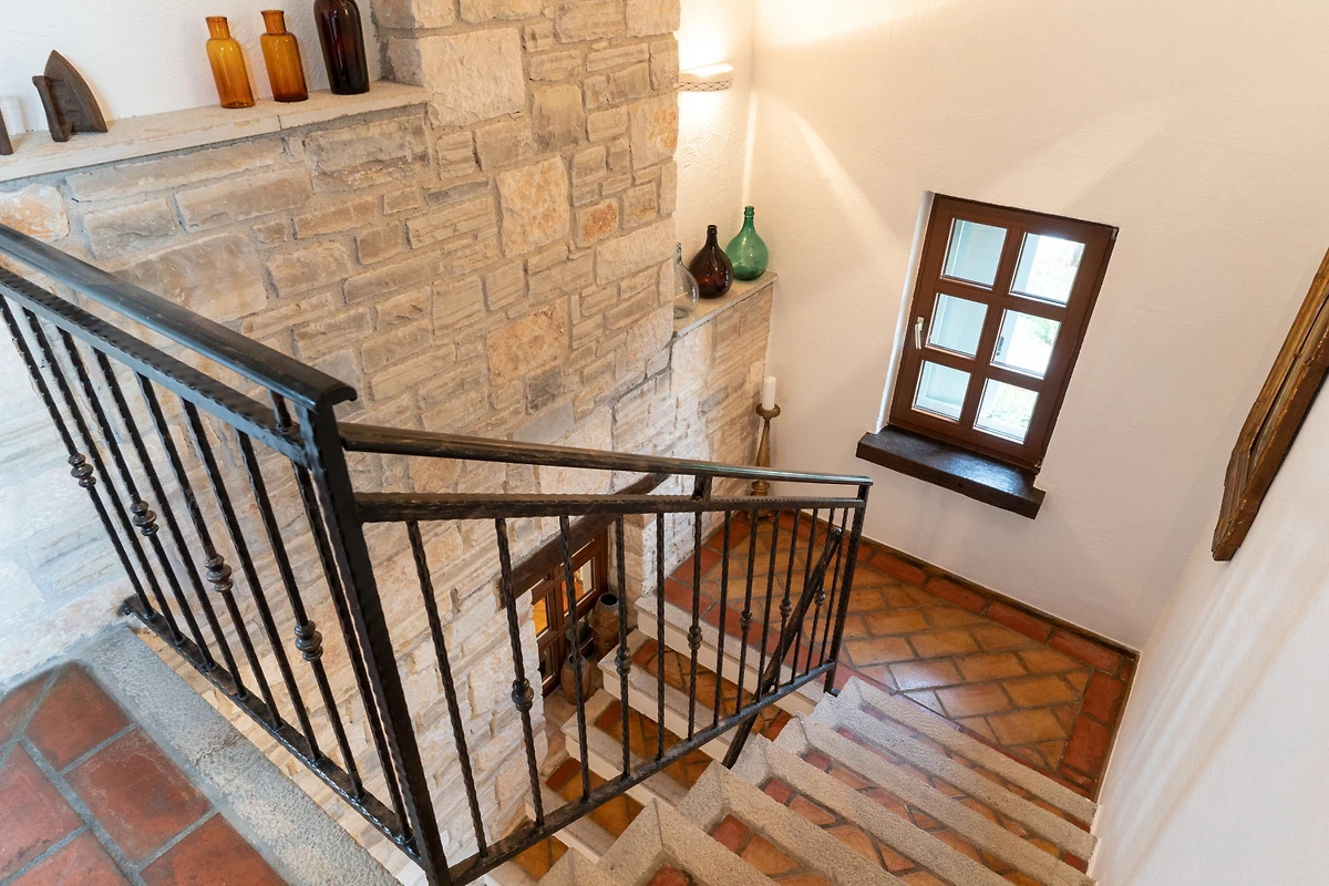 Das Ferienhaus verfügt über 4 Schlafzimmer, von denen 3 über ein eigenes Bad verfügen, während sich 1 Bad im Erdgeschoss befindet, direkt neben der Tür des angrenzenden Zimmers. Es gibt 2 Schlafzimmer im Erdgeschoss und 2 im ersten Stock, alle mit Doppelbetten. Vom ersten Stock und von der Terrasse aus können Sie den Blick auf die 10 km entfernte Adria geniessen. Der traditionell-moderne Stil des Erdgeschosses setzt sich im Obergeschoss fort, das durch Naturstein und Holz in Kombination mit modernen Möbeln gekennzeichnet ist.