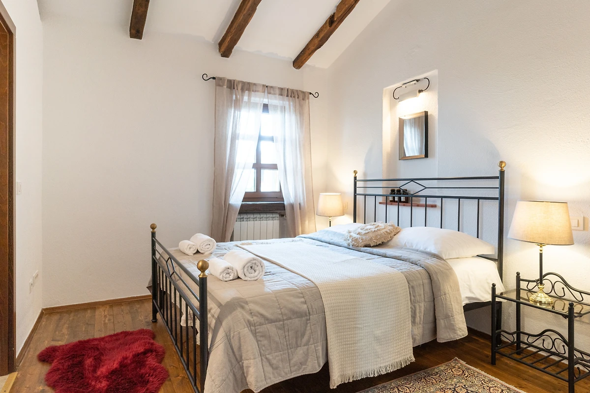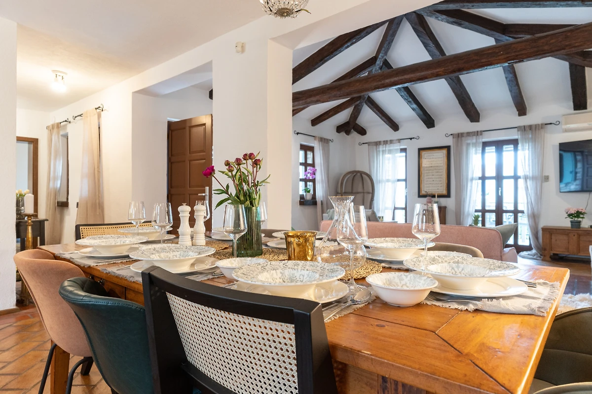 Dieses Ferienhaus bietet ihren Gästen 190 m² Wohnfläche und besteht aus einem Erdgeschoss und einem Obergeschoss. Im Erdgeschoss befindet sich ein geräumiges Wohnzimmer, das dank seines Komforts und der Anzahl der Sitzplätze in ein kleines Home-Cinema verwandelt werden kann. Es ist mit einem Sofa, einem Diwan und einem Sessel, einem Steinkamin und einem Fernseher ausgestattet. Neben dem Wohnzimmer befindet sich ein Esszimmer mit Esstisch und eine voll ausgestattete Küche, in der Sie leicht köstliche Mahlzeiten zubereiten können. Die Villa wird Sie mit ihrem traditionellen Charme, aber auch mit ihrem istrianischen und mediterranen Geist verzaubern. Alle Räume sind klimatisiert und für kältere Tage steht eine Zentralheizung zur Verfügung.