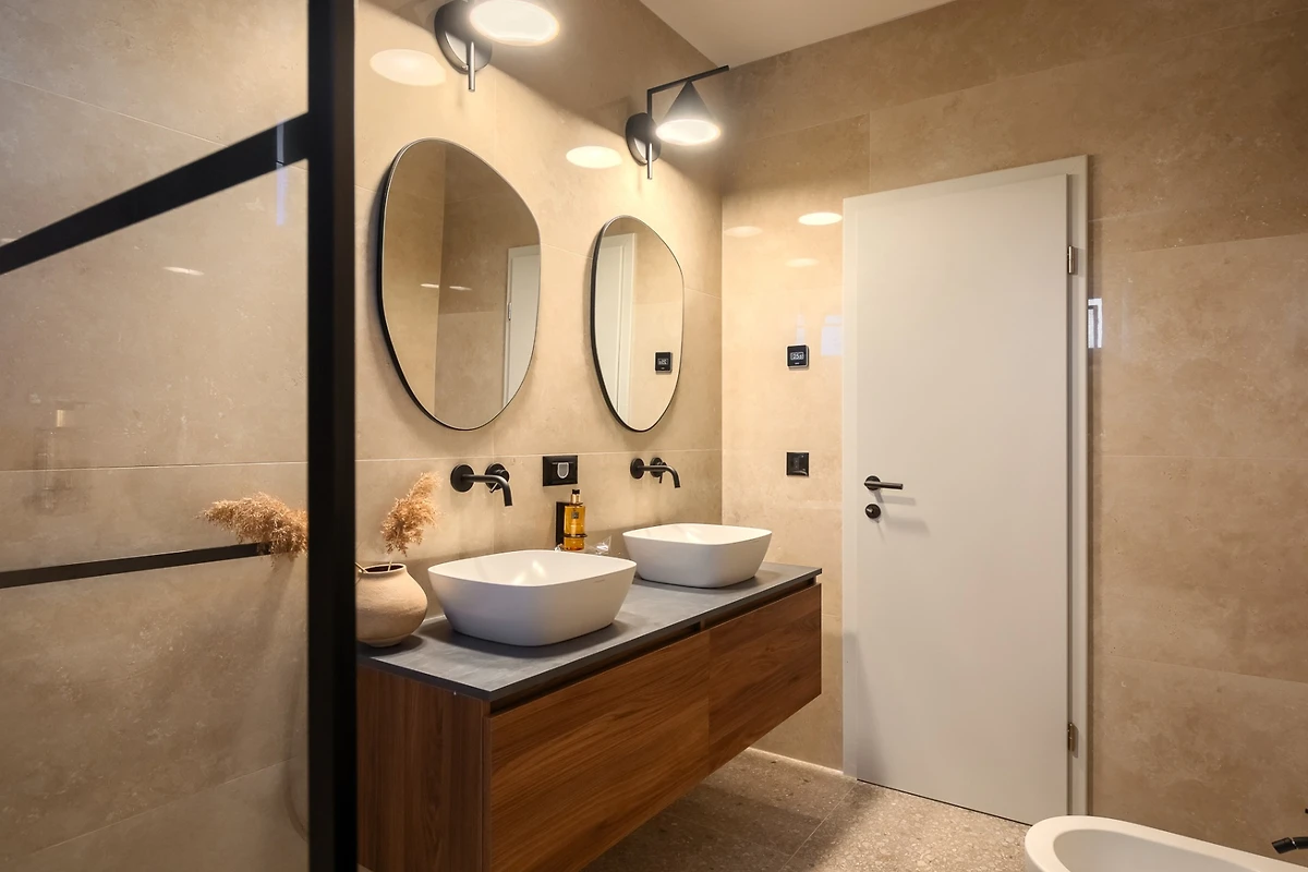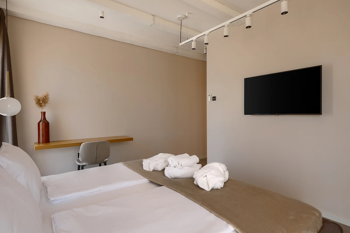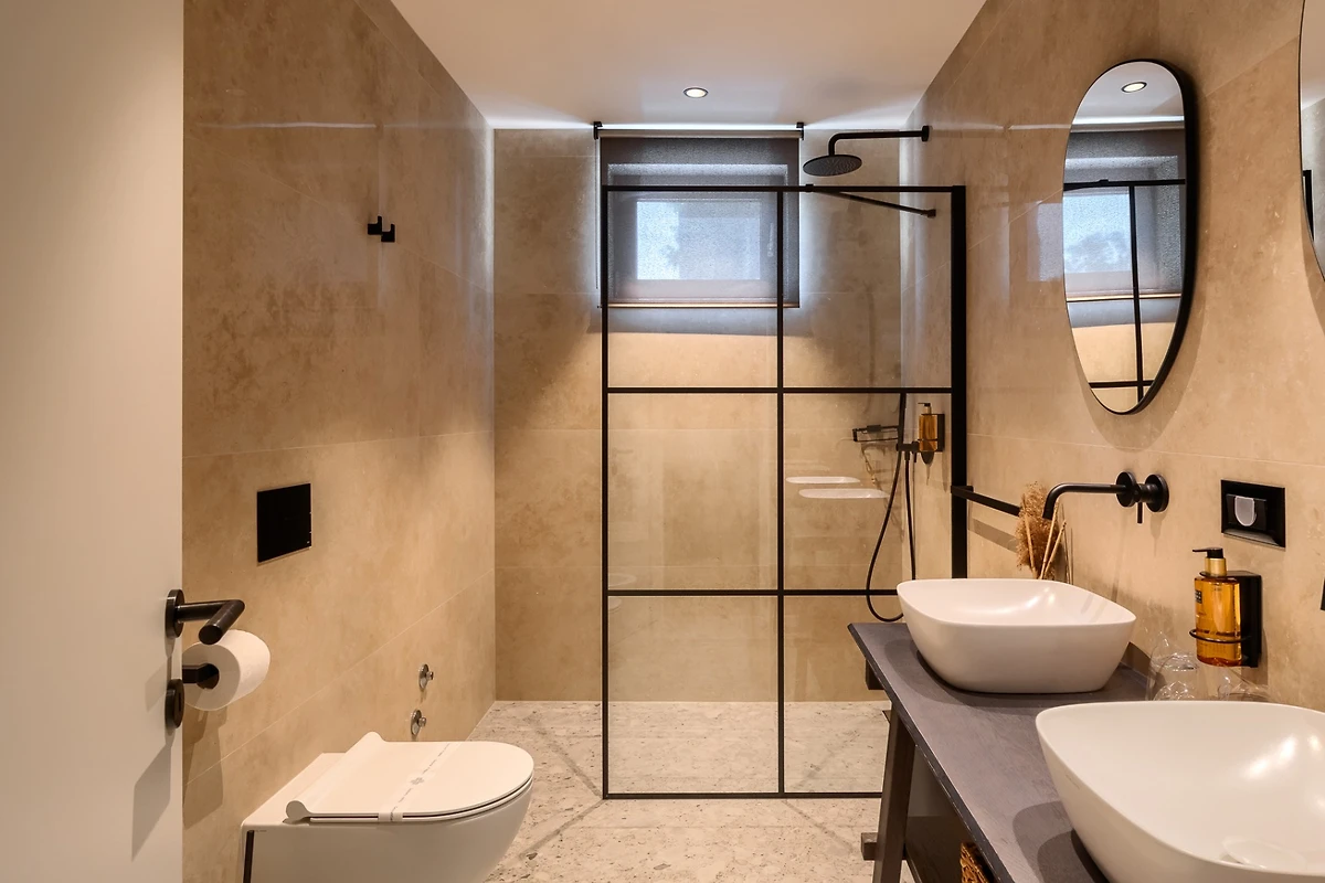 Villa Curitico hat 4 Schlafzimmer, 2 im Erdgeschoss und 2 im ersten Stock. Jedes Schlafzimmer hat ein Doppelbett und ein eigenes Bad. In jedem Badezimmer finden Sie 2 Waschbecken und eine Duschkabine, sowie Toilettenartikel, Haartrockner und Bademäntel. Alle Zimmer und Bäder sind in der gleichen minimalistischen, sauberen Ästhetik gehalten wie der Rest der Villa. Im ersten Stock des Hauses finden Sie ausserdem einen Wellnessbereich mit finnischer Sauna und eigenem Bad.