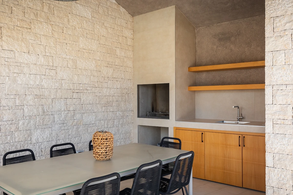 Die Villa ist von einem 1050 m² grossen, umzäunten Garten umgeben, in dem Sie einen 50 m² grossen Salzwasserpool, einen Aussen-Whirlpool und 8 Liegen zum Entspannen und Sonnenbaden finden. Die Villa verfügt auch über eine überdachte Terrasse mit Sommerküche, Grill und Esstisch mit 8 Stühlen. Ein privater Parkplatz für maximal 3 Fahrzeuge ist ebenfalls vorhanden.