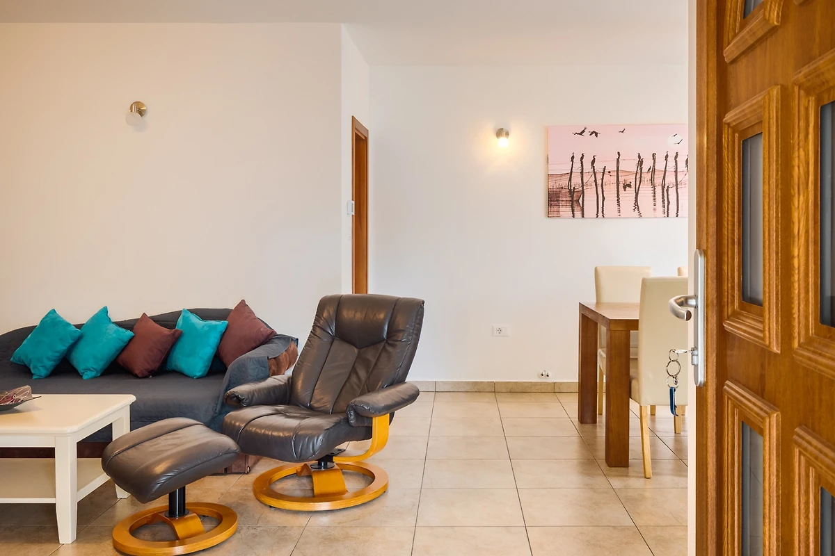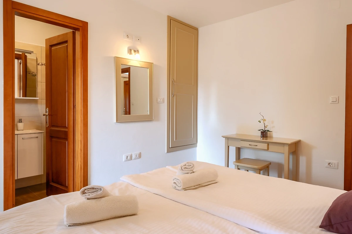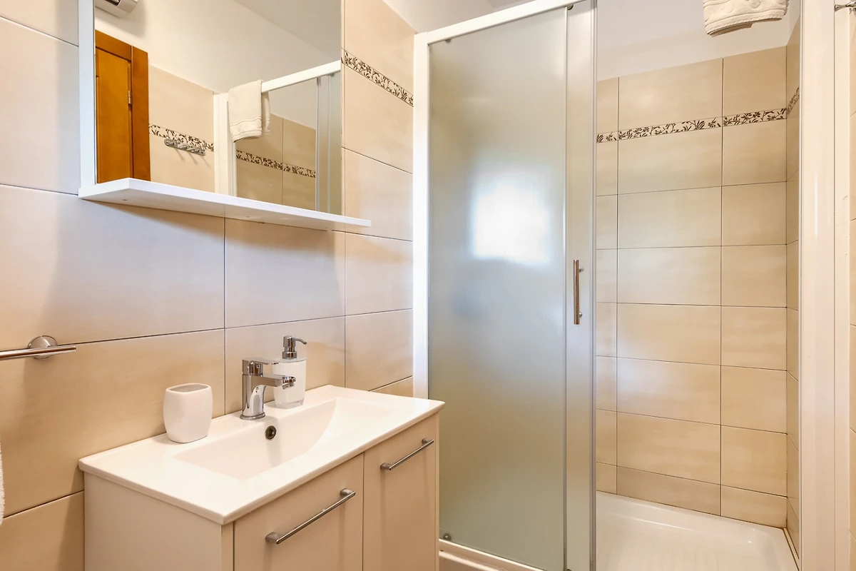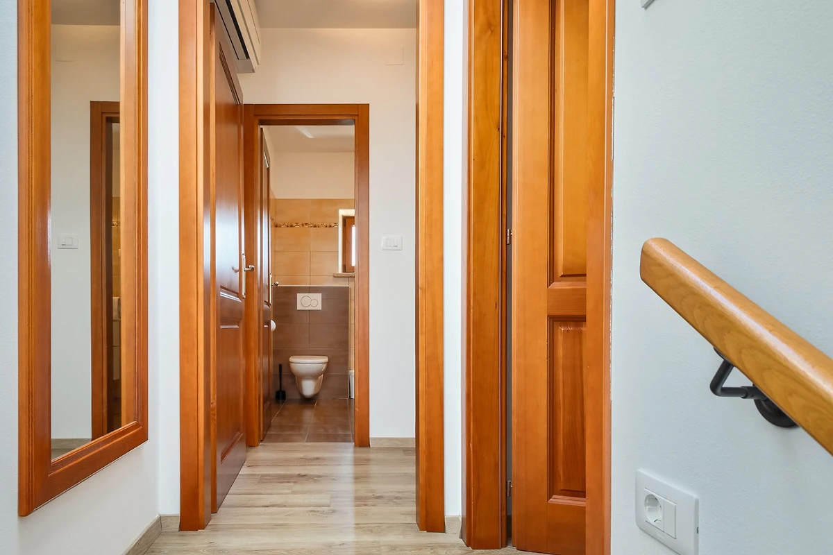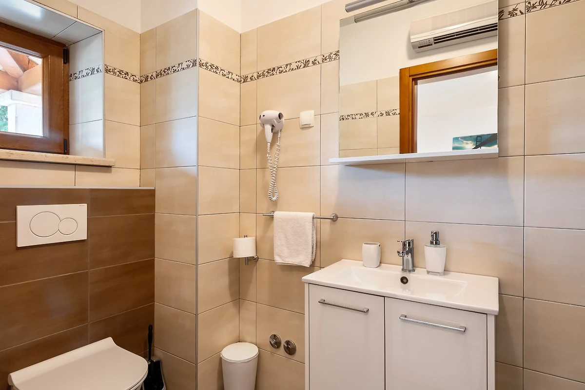 Das Innere der Villa umfasst 100 m² und besteht aus 2 Etagen. Im Erdgeschoss befindet sich eine voll ausgestattete Küche mit einer Bar, in der Sie alles finden, was Sie für einen komfortablen und funktionellen Aufenthalt benötigen. Es gibt auch einen Esstisch mit 6 Stühlen, an dem Sie die zubereiteten Mahlzeiten geniessen können. Daneben befindet sich das Wohnzimmer, in dem Sie sich nach langen Tagen der Erkundung der Gegend entspannen können. Im Erdgeschoss befindet sich auch ein Bad mit Dusche. Alle Zimmer sind klimatisiert.