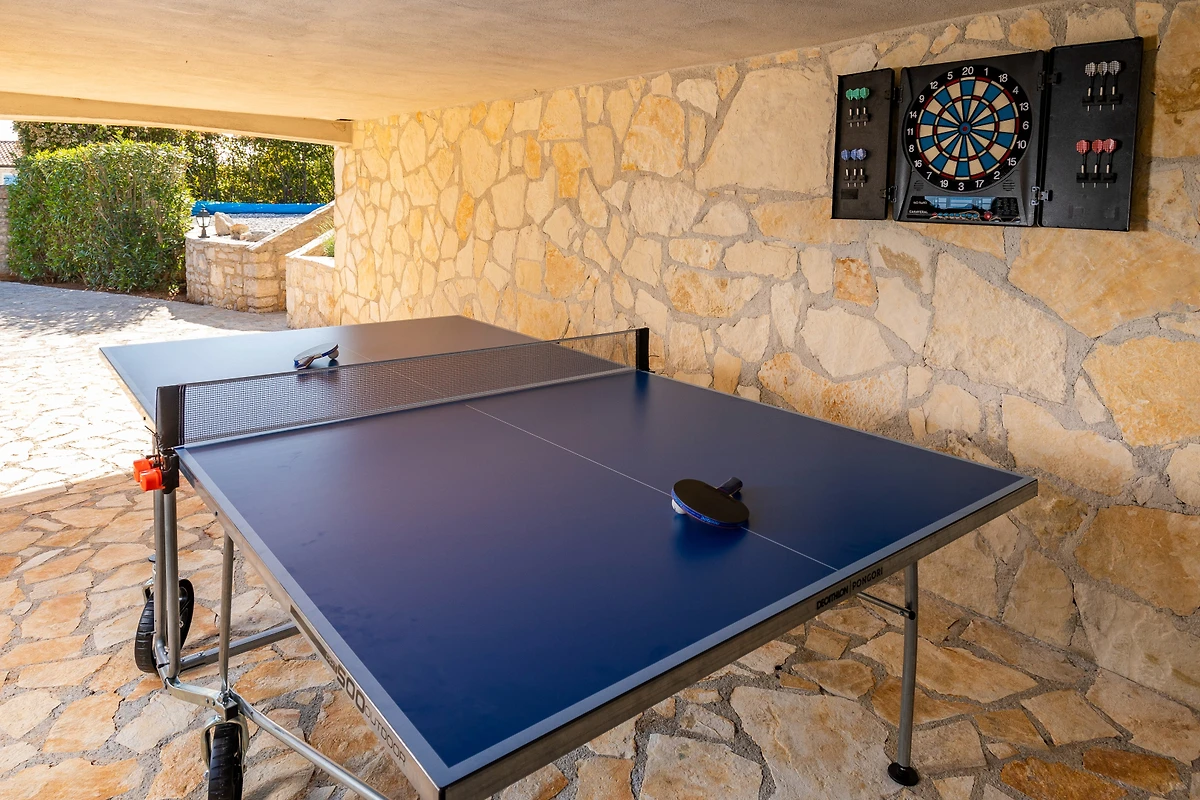 Im Hof neben der Hauptvilla befindet sich ein zusätzliches 52 m² grosses Gebäude mit einem Schlafzimmer mit Doppelbett und einem Badezimmer mit Dusche. Kinder und Erwachsene werden es geniessen, Tischtennis und Darts zu spielen. Die Villa ist komplett eingezäunt und hat einen schönen Garten mit viel Grün, ideal, wenn Sie Ihre Haustiere mitbringen. Es gibt 4 private Parkplätze im Innenhof und 2 weitere im Freien.