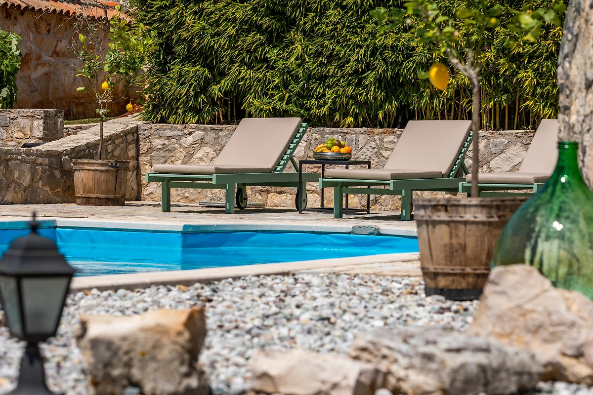 Die Gesamtfläche des Anwesens beträgt 744 m². Das Ferienhaus verfügt über eine schöne überdachte Terrasse, die mit Vorhängen verschlossen werden kann. Es gibt auch einen Holzkohle- oder Holzgrill und einen Esstisch, so dass Sie Ihr Frühstück in einer einzigartigen Umgebung im Freien geniessen können oder Ihr Abendessen, während Sie den Sonnenuntergang beobachten. Der 96 m² grosse Swimmingpool bietet tagsüber und abends Abkühlung, und es gibt 8 Liegestühle zum Entspannen und Sonnenbaden nach dem Schwimmen. Der Pool ist beheizt, so dass man auch in den kälteren Jahreszeiten darin schwimmen kann.