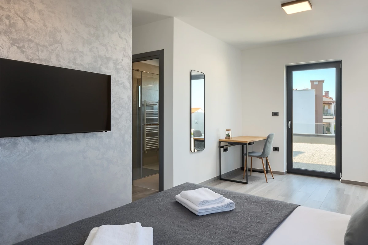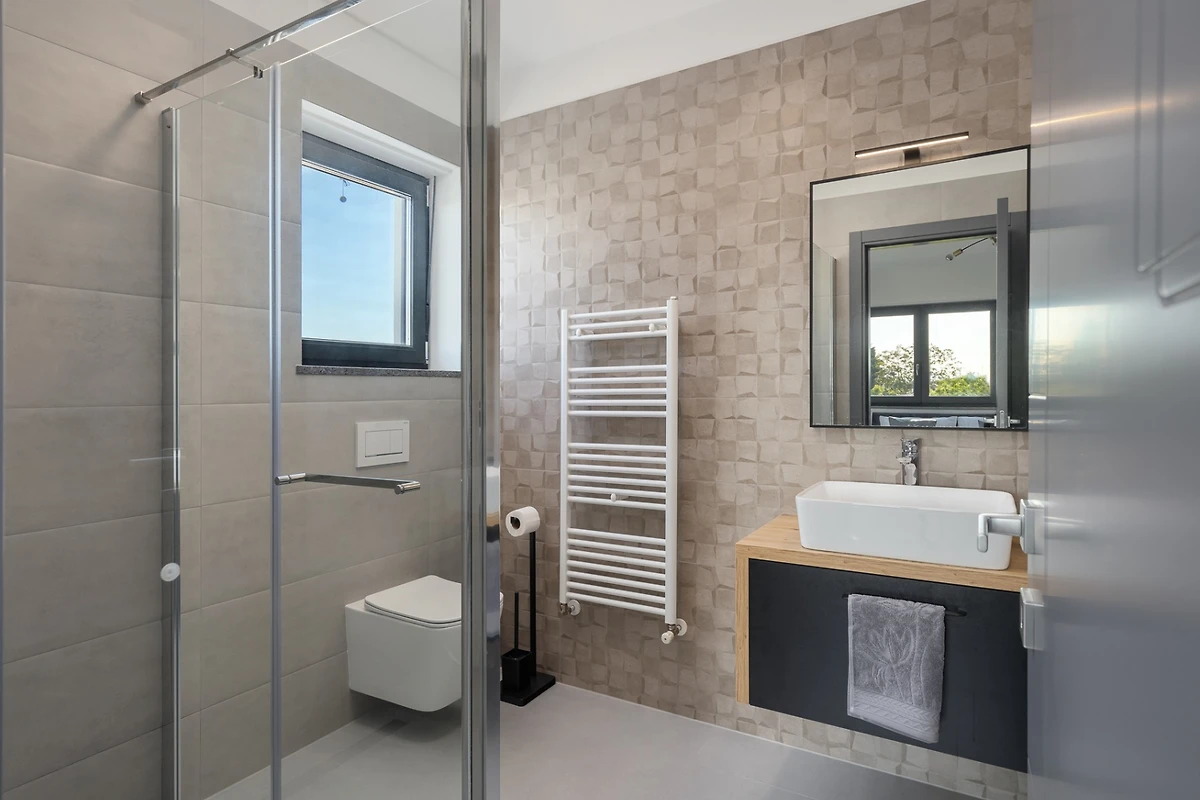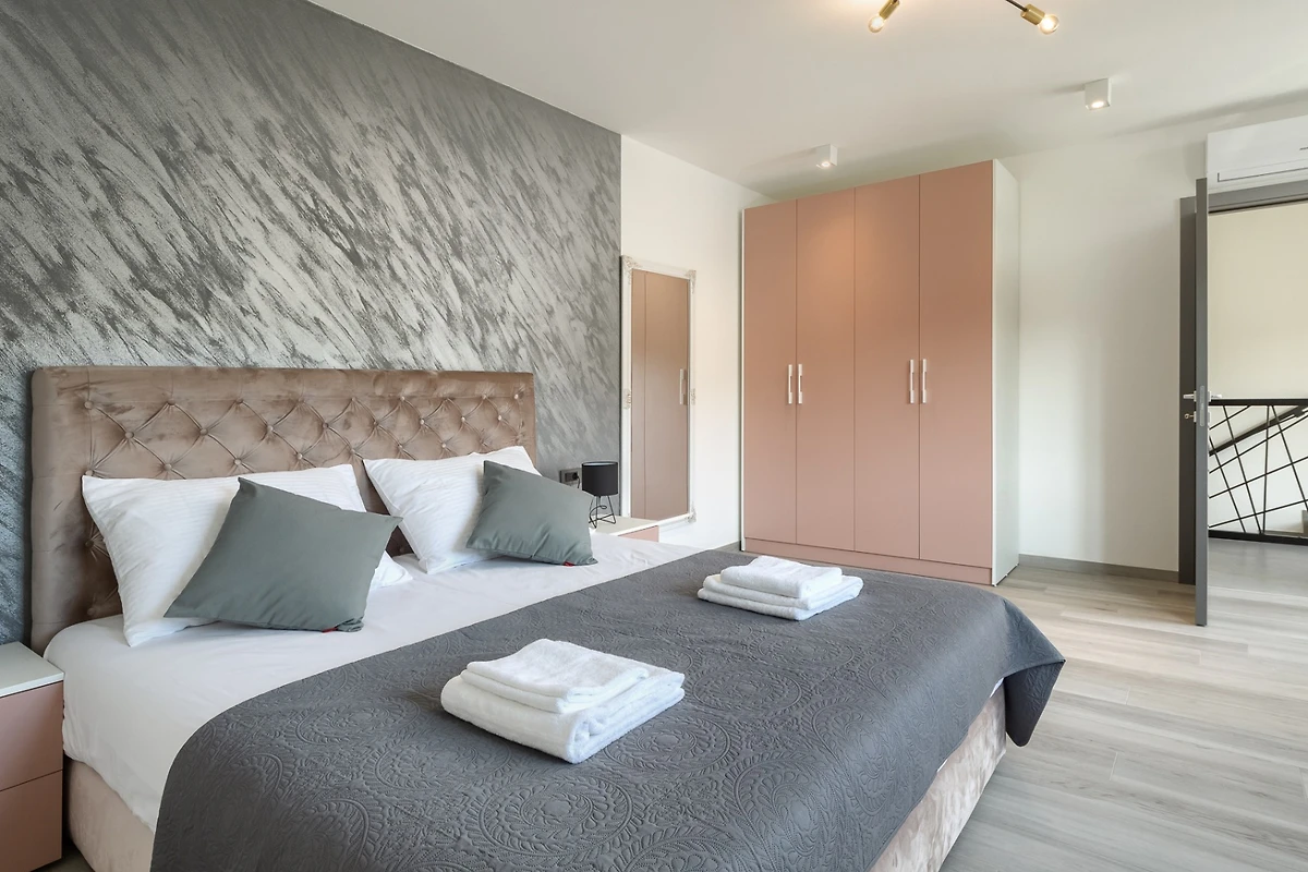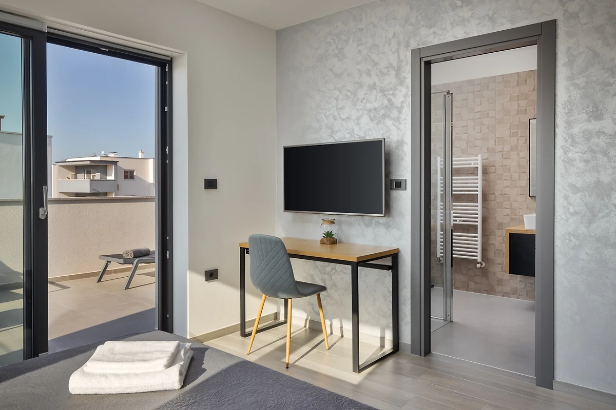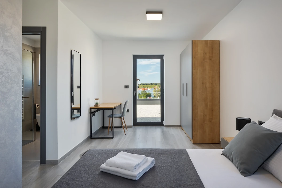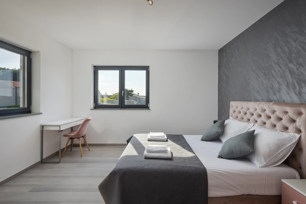Die luxuriösen Schlafzimmer sind so angeordnet, dass sich 4 im ersten Stock und 1 im Erdgeschoss befinden. Das Design ist modern und angenehm mit neutralen Farben, die dir helfen, dich zu entspannen. Jedes Zimmer hat eine Klimaanlage, ein Doppelbett, einen Fernseher und einen Schreibtisch. 3 der Zimmer haben einen Balkon mit Sitzgelegenheit, von dem aus du bei deinem Morgenkaffee die Aussicht auf Pula geniessen kannst. Das Zimmer im Erdgeschoss hat ausserdem Zugang zur Pool-Lounge. In 3 der Schlafzimmer findest du ein eigenes Bad. Insgesamt gibt es 2 Bäder im Erdgeschoss und 3 im Obergeschoss. Das Design ist modern und minimalistisch und schafft eine luxuriöse Atmosphäre. Jedes Badezimmer hat eine begehbare Dusche und ist mit Körperpflegeprodukten und einem Haartrockner ausgestattet. Die 2 Bäder im Obergeschoss haben elegante Doppelwaschbecken.