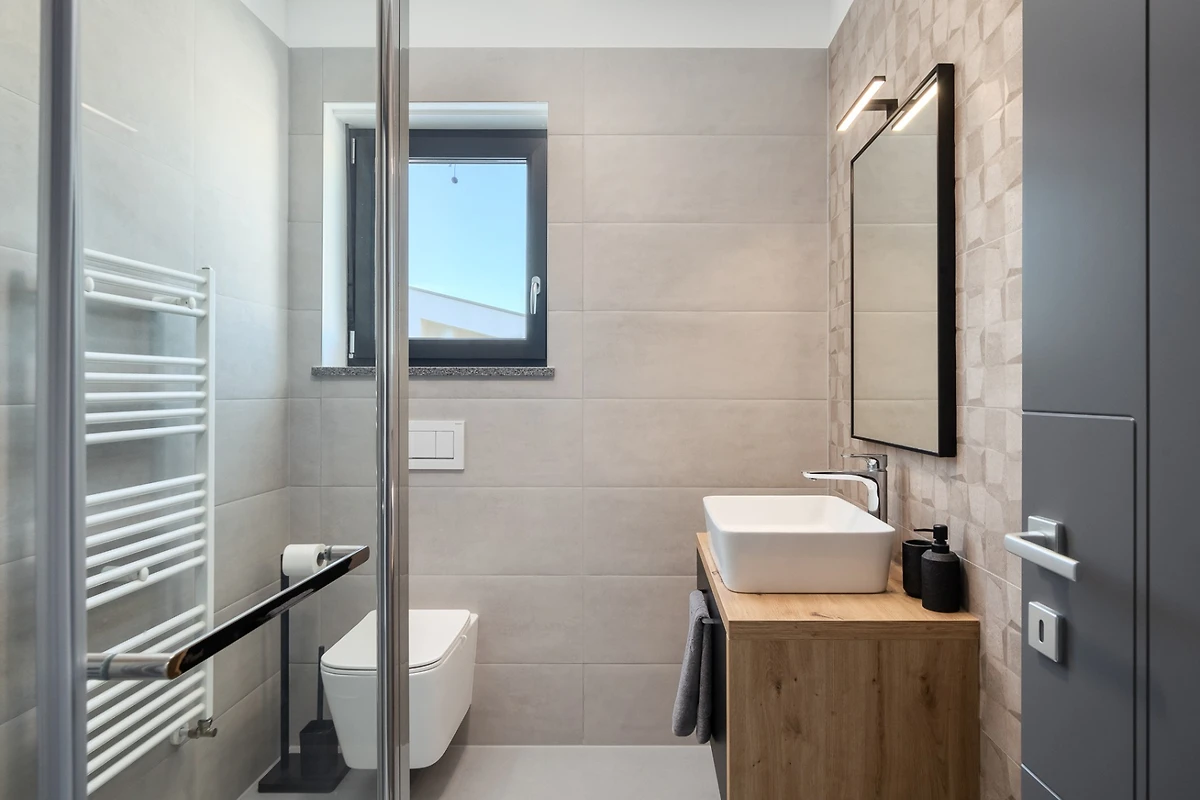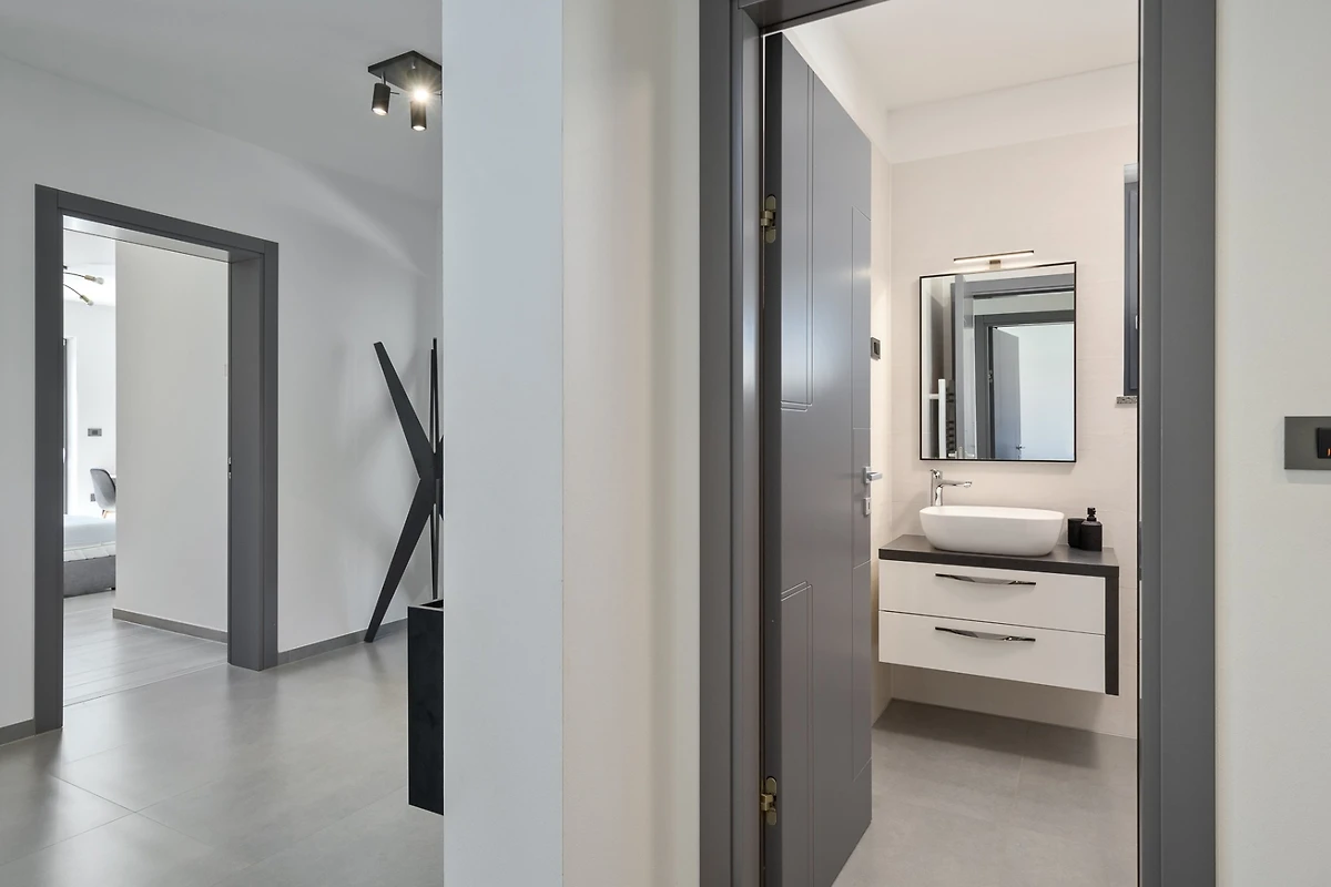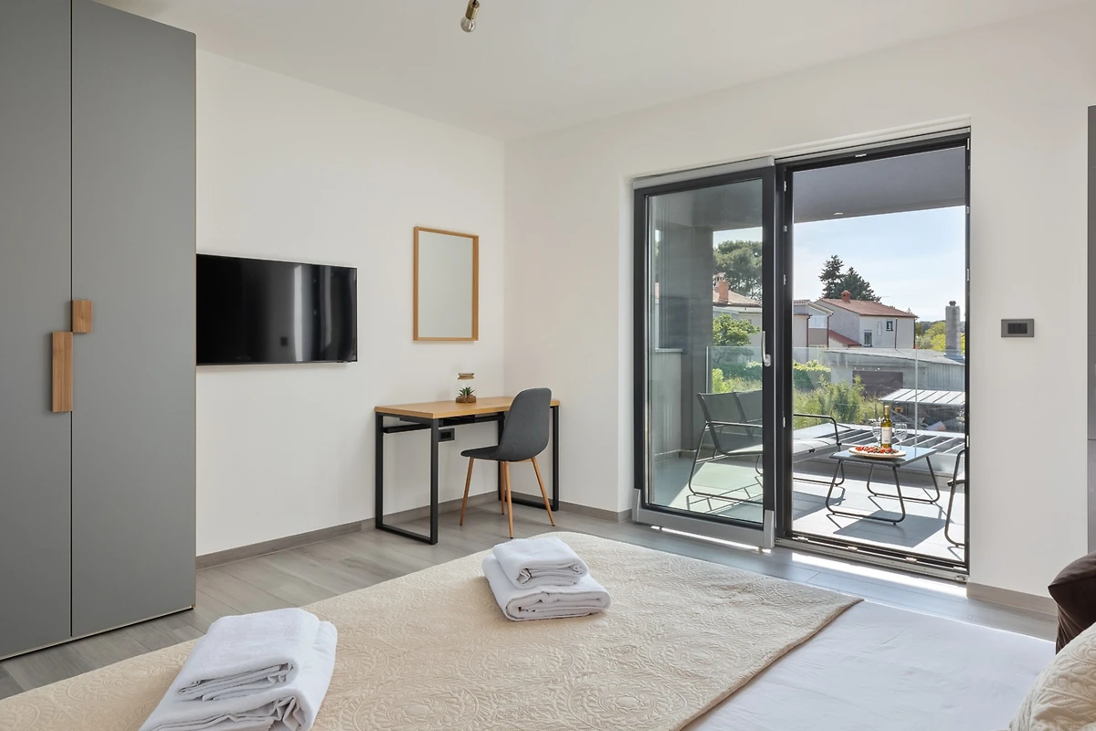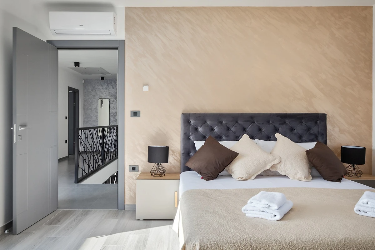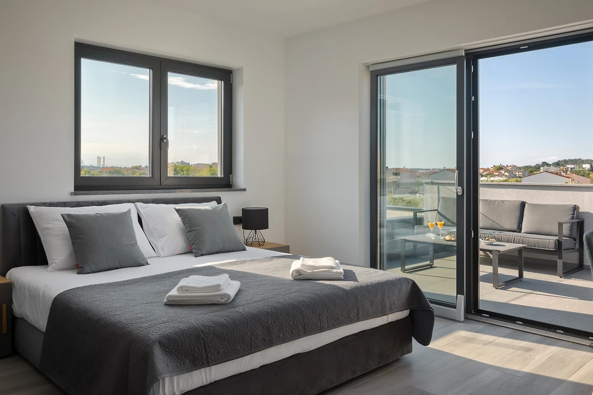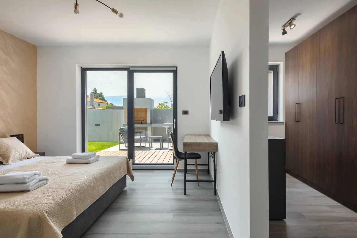 Die luxuriösen Schlafzimmer sind so angeordnet, dass sich 4 im ersten Stock und 1 im Erdgeschoss befinden. Das Design ist modern und angenehm mit neutralen Farben, die dir helfen, dich zu entspannen. Jedes Zimmer hat eine Klimaanlage, ein Doppelbett, einen Fernseher und einen Schreibtisch. 3 der Zimmer haben einen Balkon mit Sitzgelegenheit, von dem aus du bei deinem Morgenkaffee die Aussicht auf Pula geniessen kannst. Das Zimmer im Erdgeschoss hat ausserdem Zugang zur Pool-Lounge. In 3 der Schlafzimmer findest du ein eigenes Bad. Insgesamt gibt es 2 Bäder im Erdgeschoss und 3 im Obergeschoss. Das Design ist modern und minimalistisch und schafft eine luxuriöse Atmosphäre. Jedes Badezimmer hat eine begehbare Dusche und ist mit Körperpflegeprodukten und einem Haartrockner ausgestattet. Die 2 Bäder im Obergeschoss haben elegante Doppelwaschbecken.