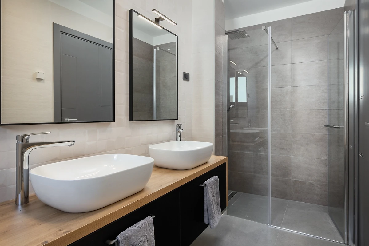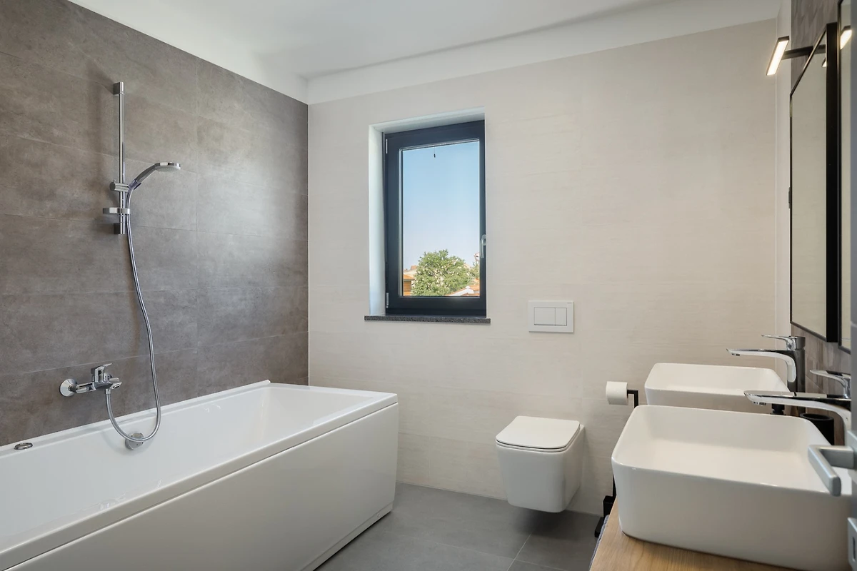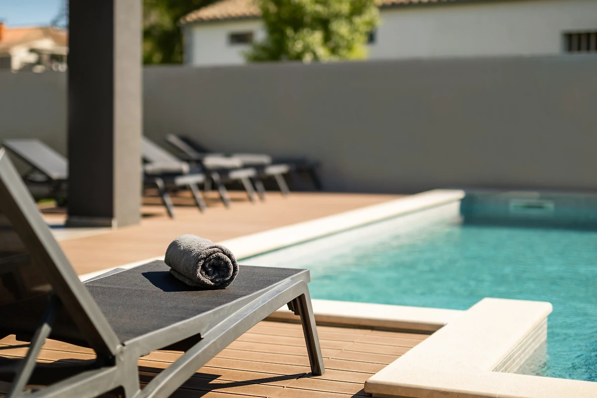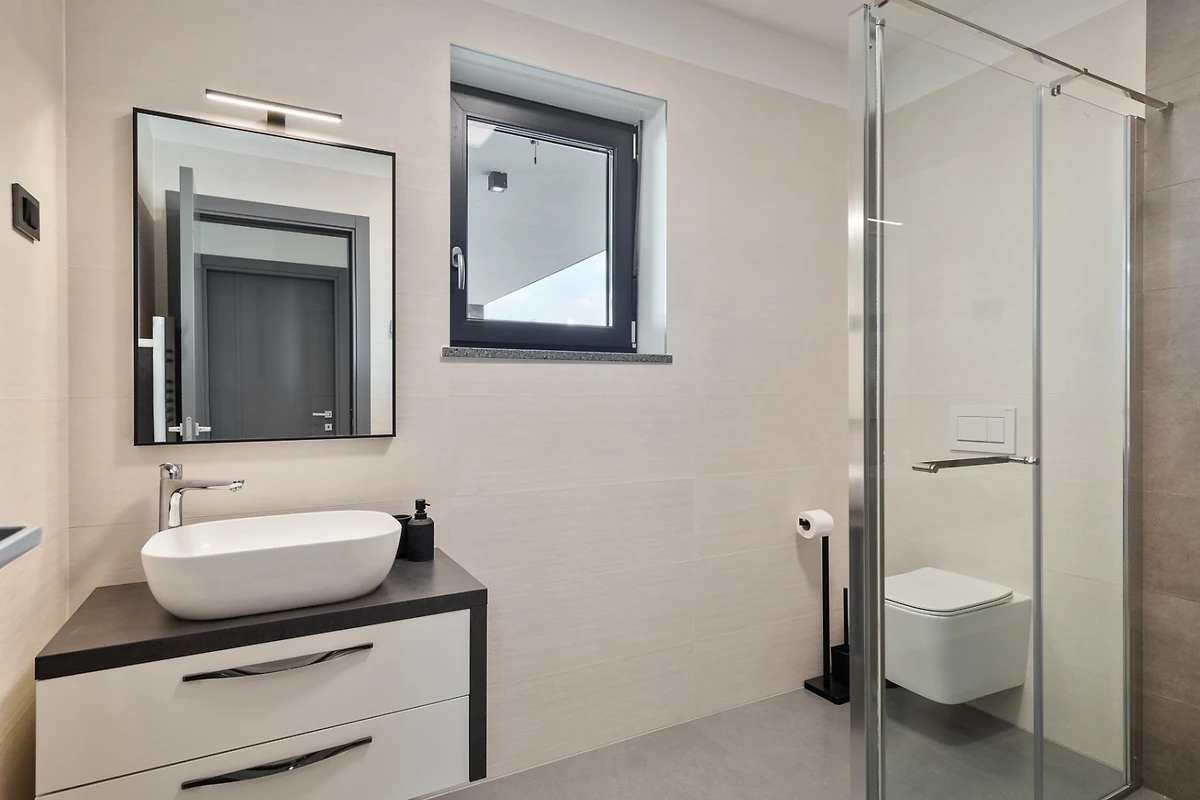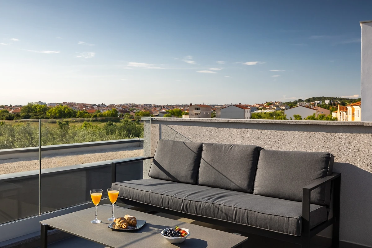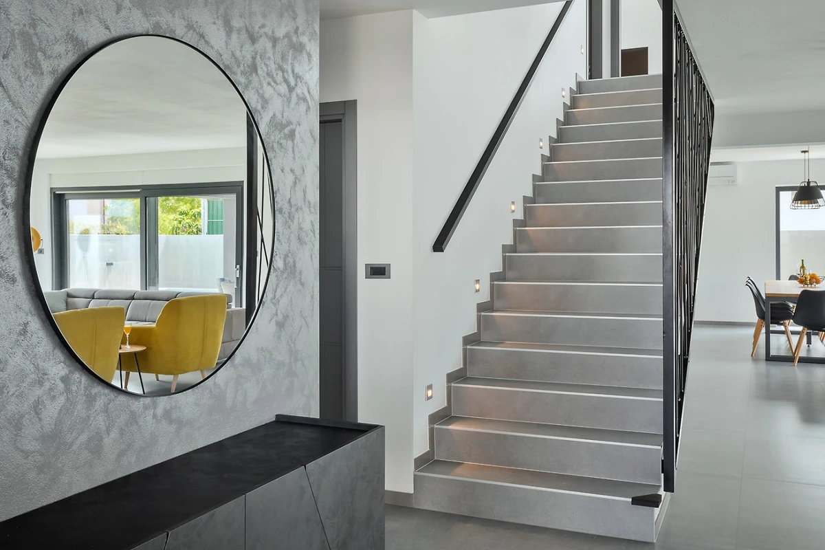 Die luxuriösen Schlafzimmer sind so angeordnet, dass sich 4 im ersten Stock und 1 im Erdgeschoss befinden. Das Design ist modern und angenehm mit neutralen Farben, die dir helfen, dich zu entspannen. Jedes Zimmer hat eine Klimaanlage, ein Doppelbett, einen Fernseher und einen Schreibtisch. 3 der Zimmer haben einen Balkon mit Sitzgelegenheit, von dem aus du bei deinem Morgenkaffee die Aussicht auf Pula geniessen kannst. Das Zimmer im Erdgeschoss hat ausserdem Zugang zur Pool-Lounge. In 3 der Schlafzimmer findest du ein eigenes Bad. Insgesamt gibt es 2 Bäder im Erdgeschoss und 3 im Obergeschoss. Das Design ist modern und minimalistisch und schafft eine luxuriöse Atmosphäre. Jedes Badezimmer hat eine begehbare Dusche und ist mit Körperpflegeprodukten und einem Haartrockner ausgestattet. Die 2 Bäder im Obergeschoss haben elegante Doppelwaschbecken.