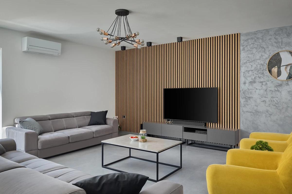 Im Erdgeschoss des Hauses spürst du sofort die Geräumigkeit des offenen Wohnbereichs, der Wohnzimmer, Esszimmer und Küche vereint. Die moderne Einrichtung und die neutralen Farben sorgen für einen nahtlosen Übergang im gesamten Raum, der durch dekorative Akzente in Gelb- und Beigetönen unterstrichen wird. An den meisten Tagen strömt viel natürliches Licht durch die breiten Glaswände. Das Wohnzimmer ist mit zwei gemütlichen Sofas und Sesseln sowie einem Smart-TV ausgestattet und eignet sich perfekt für ein geselliges Beisammensein im klimatisierten Raum. Auf der anderen Seite des Raumes befindet sich ein grosser Esstisch mit 10 Plätzen, der auf Wunsch mit einem Kindersitz ausgestattet werden kann. Die moderne Küche verfügt über ein Induktionskochfeld und ist voll ausgestattet mit hochwertigen Geräten und einer Kücheninsel, auf der du kulinarische Köstlichkeiten zubereiten kannst.