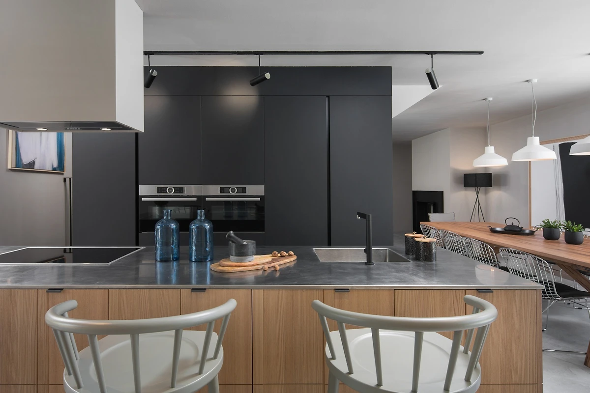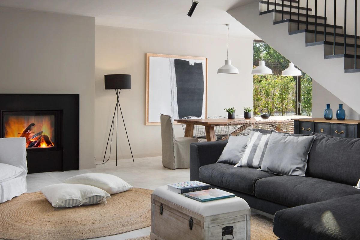 Das Innere der Villa ist 360 m² gross und besteht aus 2 Etagen. Im Erdgeschoss befindet sich ein offener Raum mit einer Küche, einem Esszimmer und einem Wohnzimmer. Der Raum ist angenehm, geräumig und luftig, mit dem Zusatz eines Kamins, der an kalten Tagen für Wärme sorgt. Die voll ausgestattete, moderne Küche empfängt Sie mit allen möglichen Geräten für die Zubereitung von Mahlzeiten, und es gibt auch grundlegende Küchengewürze. Die Villa wird von neutralen, beruhigenden Farben dominiert, und die blauen Akzenttüren sorgen für einen Hauch von Interesse und Wirkung.