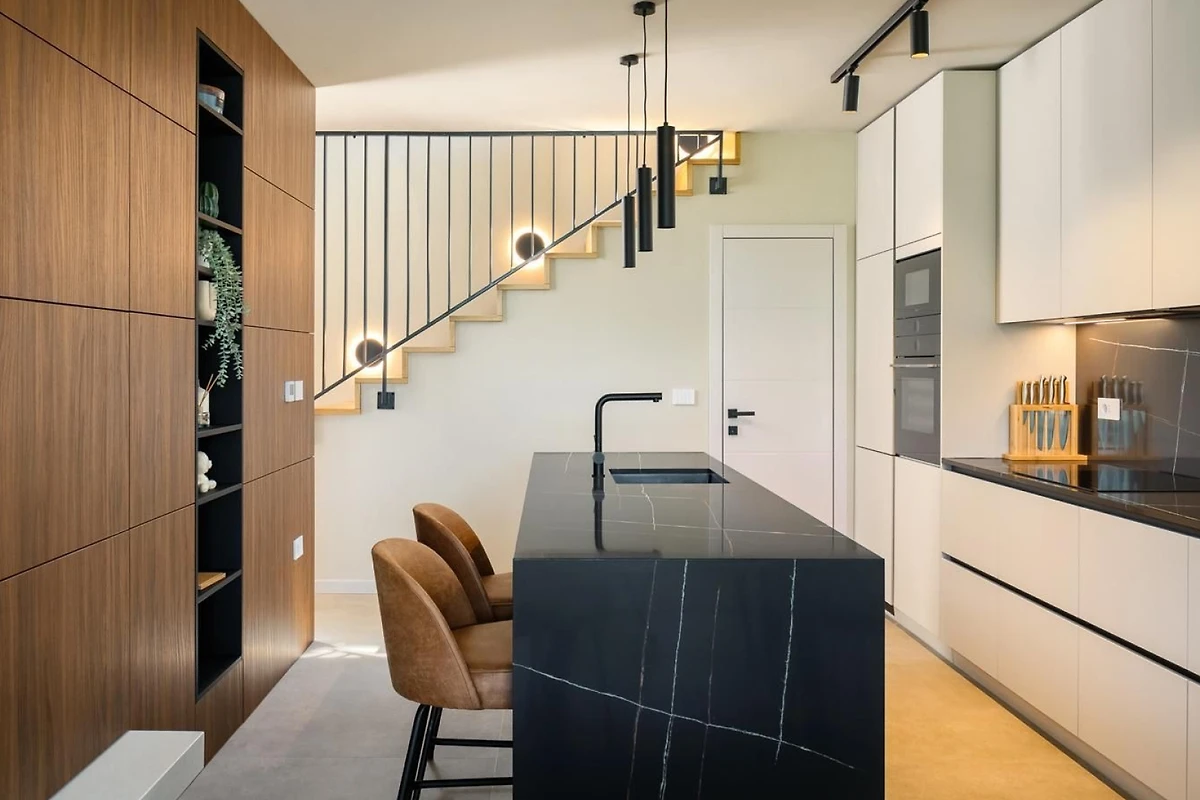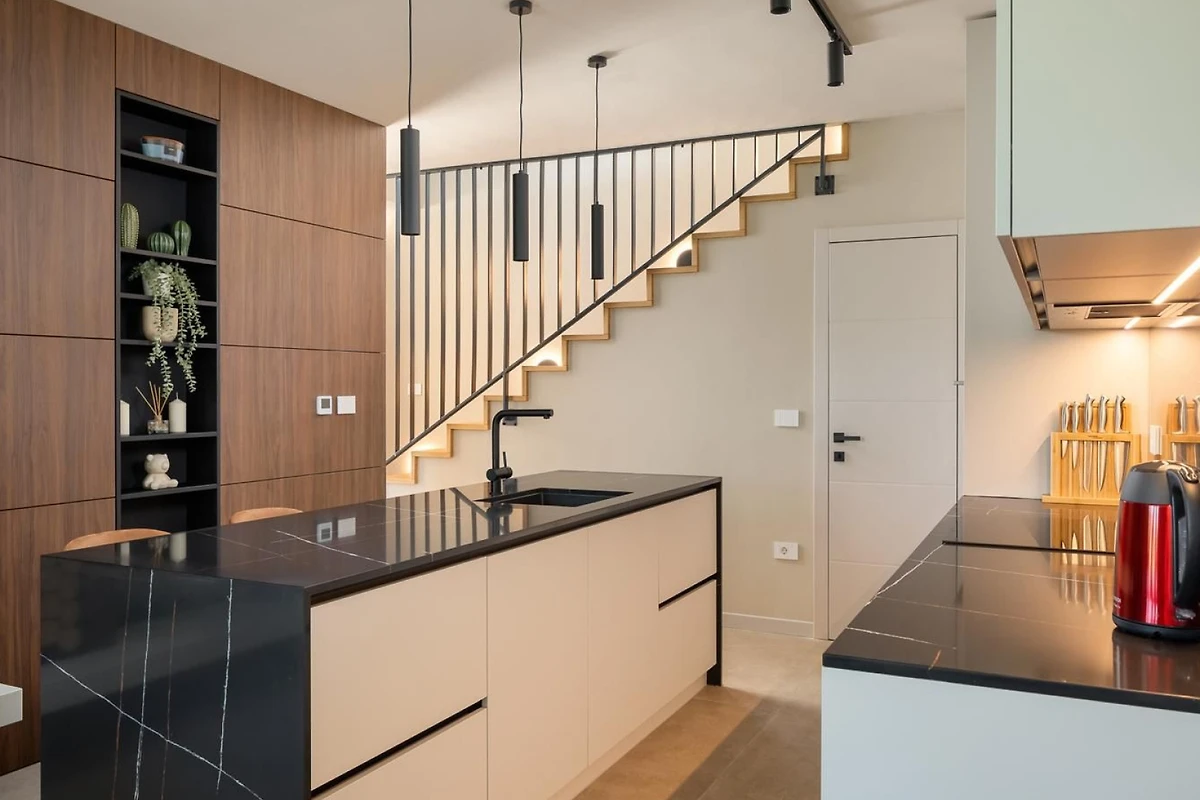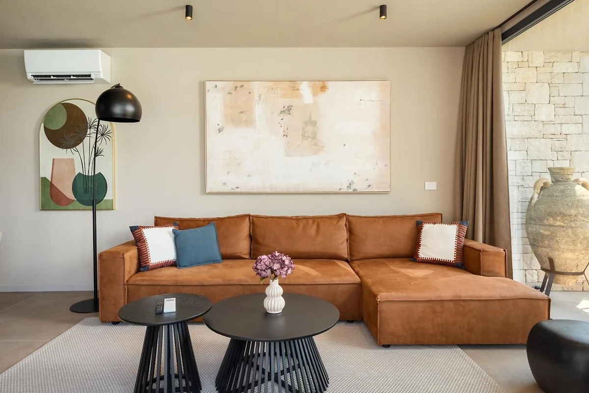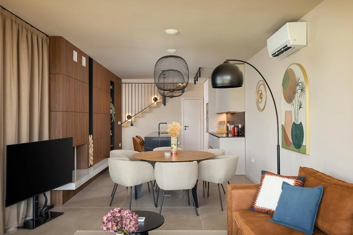 Die Villa ist 123 m² gross und besteht aus einem Erdgeschoss und einem Obergeschoss. Im Erdgeschoss gibt es ein offenes Wohnzimmer, ein Esszimmer und eine Küche. Die Glaswand schafft die Illusion einer Verbindung mit dem Aussenbereich und lässt ausserdem viel natürliches Licht herein. Die Raumaufteilung ist ideal, um mit Freunden oder der Familie zusammenzukommen, und der Innenkamin sorgt für eine angenehme und warme Atmosphäre. Alle Räume sind klimatisiert, mit Fussbodenheizung für kältere Tage.