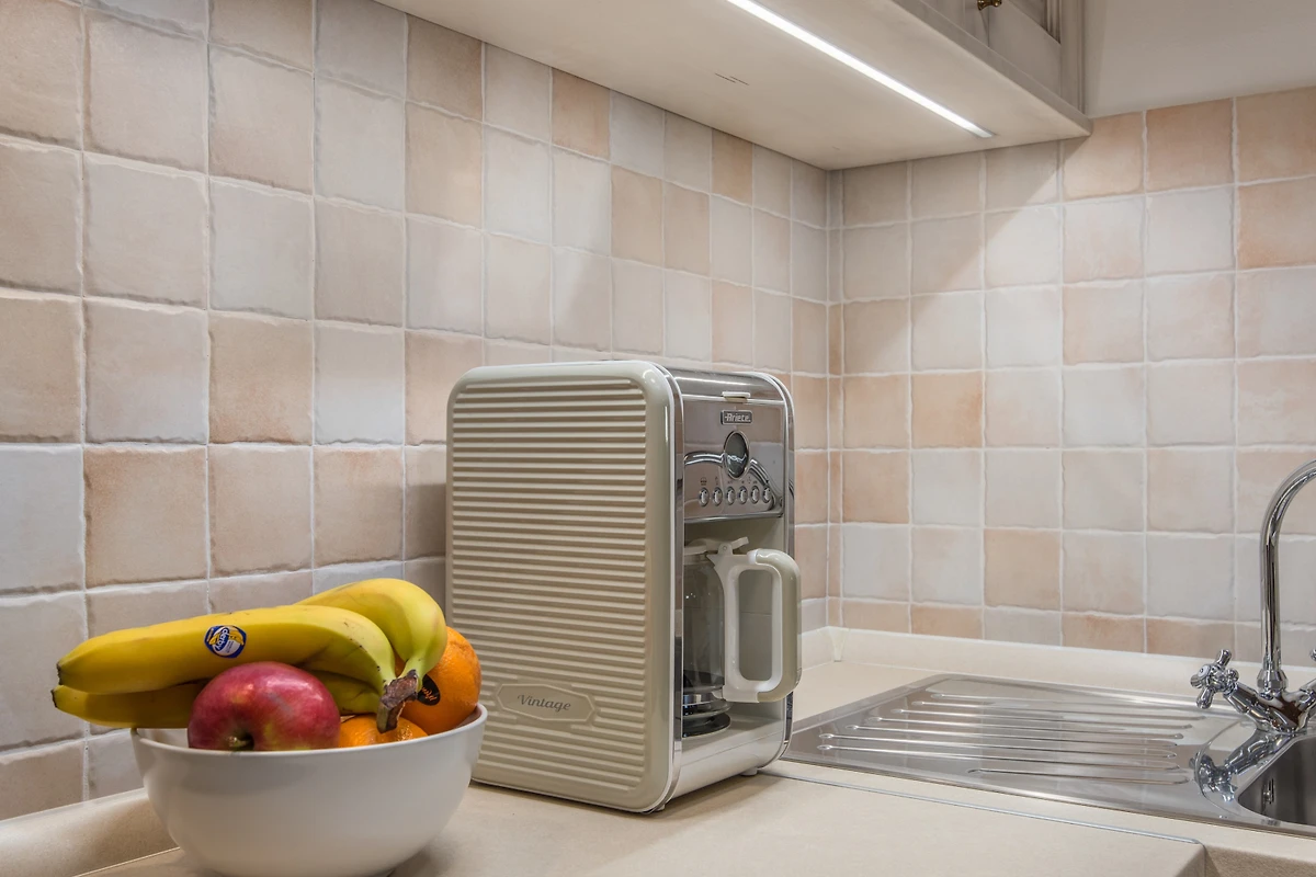 Das Innere der Villa ist 70 m² gross und besteht aus 2 Etagen - dem Erdgeschoss und dem ersten Stock. Im Erdgeschoss gibt es ein Wohnzimmer mit Kamin, eine voll ausgestattete Küche und ein Esszimmer mit 6 Plätzen. Die Küche ist modern-rustikal, mit Holzelementen, die auch in antiken Küchen zu finden sind. Abgesehen von der Ästhetik werden Sie sicherlich von den zahlreichen modernen Geräten begeistert sein, die die Zubereitung der Mahlzeiten erheblich erleichtern. Alle Zimmer sind klimatisiert.