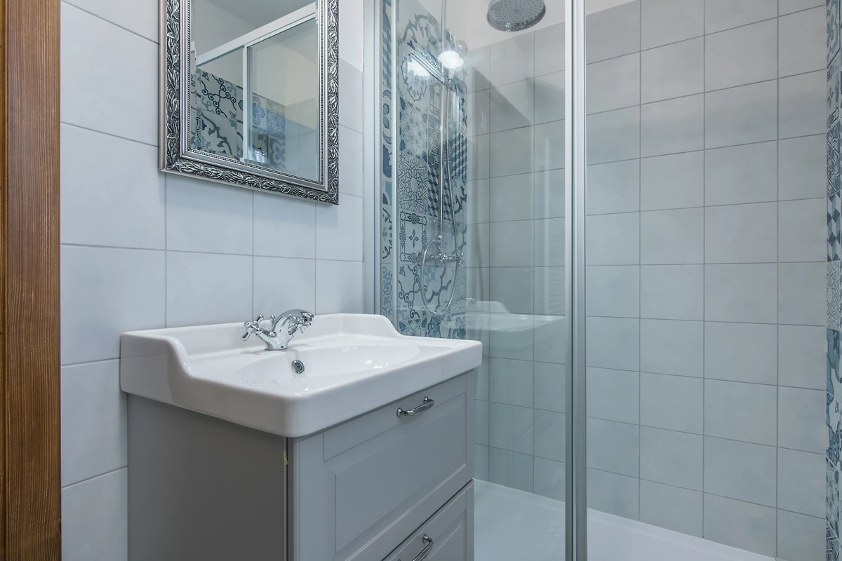 Wenn Sie die Treppe hinaufgehen, erreichen Sie den 1. Stock, wo sich 2 Schlafzimmer und 2 badezimmer befinden. 1 Schlafzimmer ist mit einem Doppelbett ausgestattet, während 1 Schlafzimmer über 2 Einzelbetten verfügt. Wenn Sie einen intimen Urlaub mit Ihrer Familie planen, ist diese Anordnung ideal. Die badezimmer sind modern und mit begehbaren Duschen ausgestattet.