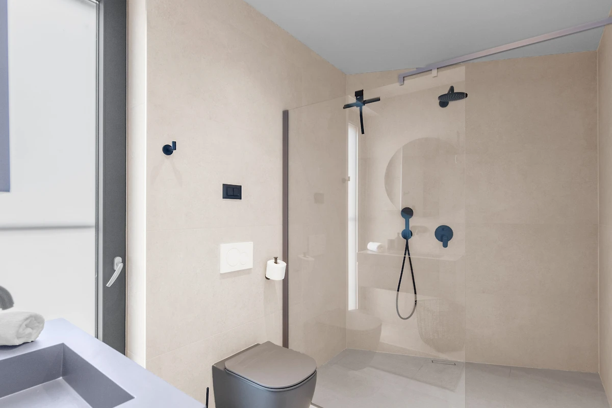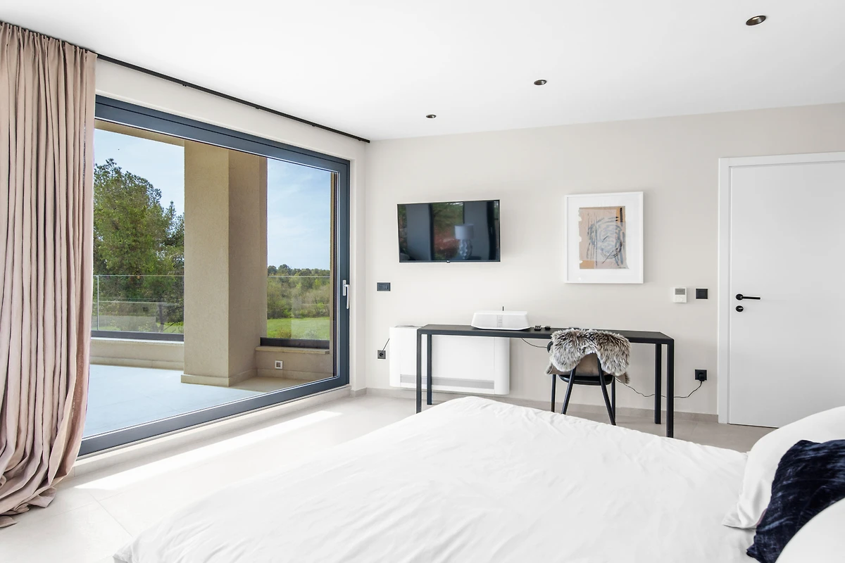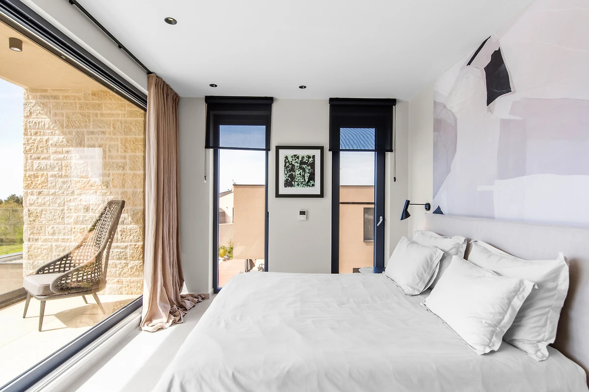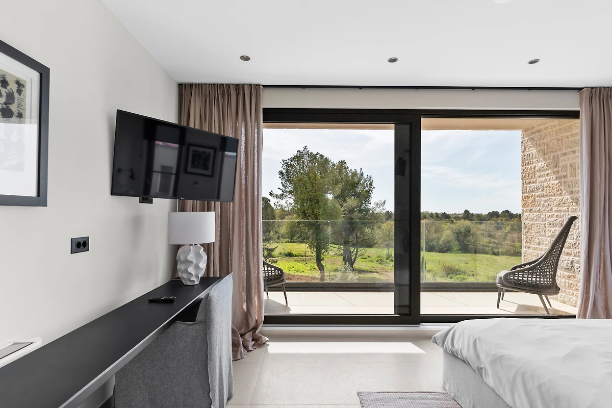 In der gesamten Einrichtung finden Sie einzigartige Details, die einen subtilen Luxus schaffen, nicht nur in den Gemeinschaftsbereichen, sondern auch in den Schlafzimmern. Es gibt 4 Schlafzimmer, 2 im Erdgeschoss und 2 im ersten Stock. Jedes Zimmer ist als moderne Oase zum Entspannen und Wohlfühlen konzipiert und bietet durch die raumhohen Glaswände einen herrlichen Ausblick, den man sogar vom Bett aus geniessen kann. Die beiden Zimmer im ersten Stock und 1 Zimmer im Erdgeschoss sind mit grossen Doppelbetten, TV und eigenem Bad ausgestattet. 1 Zimmer im Erdgeschoss hat ein kleineres Bett für 1 Person. Die Zimmer im ersten Stock haben einen eigenen Balkon, wo Sie sich im Grünen entspannen können. Klimaanlage und Fussbodenheizung in der gesamten Villa sorgen für maximalen Komfort. Der moderne Minimalismus setzt sich in den Badezimmern mit bodengleichen Duschen fort. Haartrockner sind ebenfalls vorhanden.
