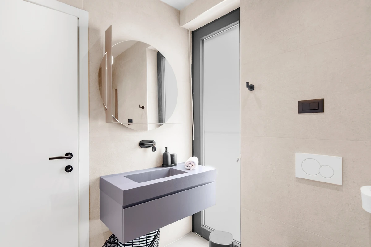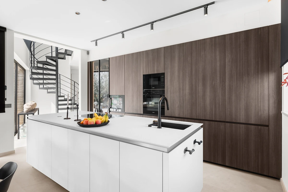Im Erdgeschoss der Villa befindet sich ein offener Wohnbereich mit Wohnzimmer, Küche und Esszimmer. Durch die hellen Farben und die grossen Fensterfronten, die direkt auf die Terrasse führen, wirkt der Raum sehr luftig und lichtdurchflutet. Das Wohnzimmer ist mit einem gemütlichen Sofa und einem Smart-TV ausgestattet. Der modern gestaltete Kamin ist der ideale Ort für gesellige Brettspiele oder Filmabende. Die moderne, voll ausgestattete Küche verfügt über eine geräumige Kochinsel mit Induktionsherd. Der Designer-Esstisch steht direkt neben der Küche und bei Bedarf kann ein Hochstuhl für ein Kind aufgestellt werden.