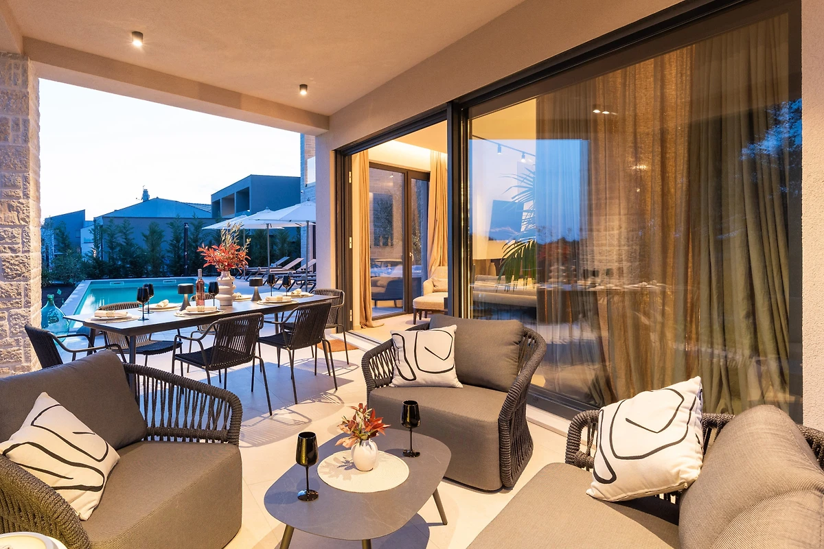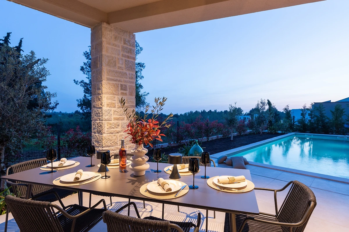 Der 606 m² grosse Garten ist komplett eingezäunt. Die elegante überdachte Terrasse und der schöne Swimmingpool werden Sie begeistern. Der Salzwasserpool kann gegen einen Aufpreis von 30 € pro Tag beheizt werden. Es gibt eine moderne Liegewiese mit 6 Liegestühlen mit Blick auf die istrische Landschaft, Handtücher und eine Aussendusche stehen zur Verfügung. Für zusätzliche Entspannung sorgt ein Whirlpool für 3 Personen. Auf der überdachten Terrasse befindet sich ein Esstisch, an dem Sie die auf dem Gasgrill zubereiteten Speisen geniessen können, und daneben eine Sitzecke, in der Sie Ihren Morgenkaffee trinken können. Das Anwesen verfügt über einen Parkplatz für 2 Fahrzeuge, eine Ladestation für Elektroautos und ist sicher für Fahrzeuge mit niedrigem Fahrgestell.