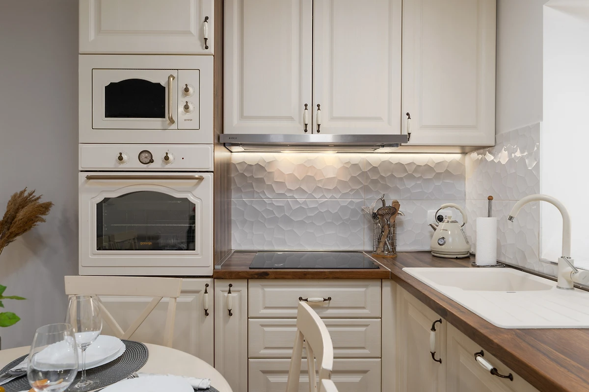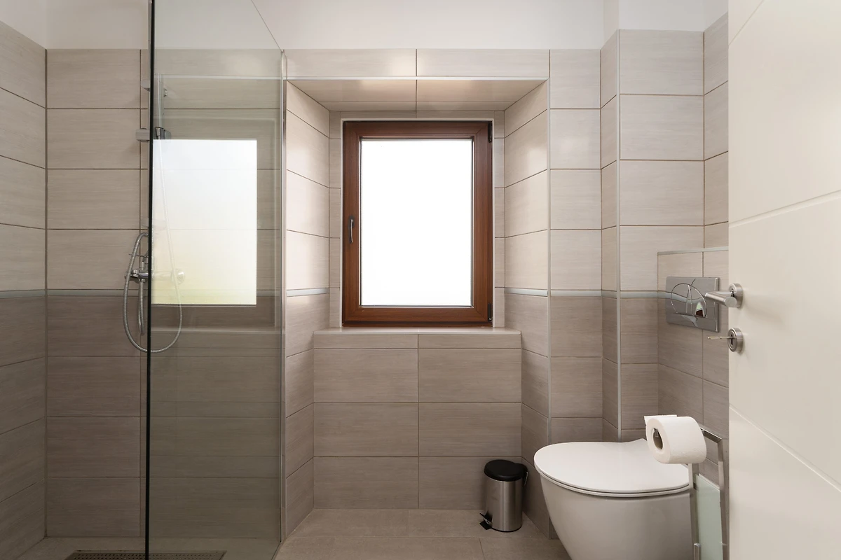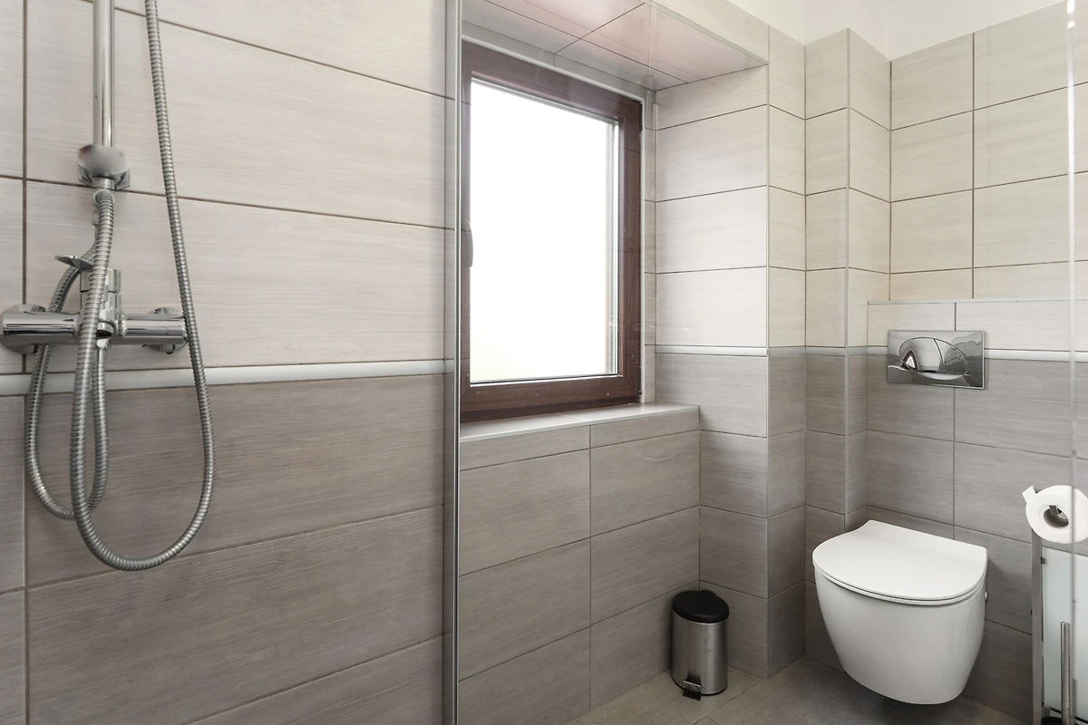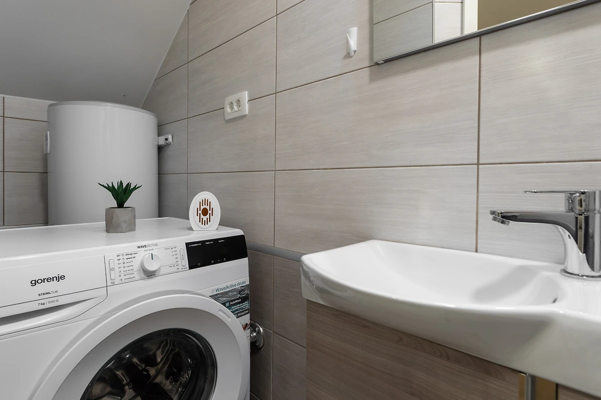 Das Innere der Villa ist 100 m² gross und besteht aus 3 Etagen. Im Erdgeschoss befindet sich ein moderner, heller und angenehmer Raum zum Entspannen und Essen. Er besteht aus einem Wohnzimmer mit TV, einer Essecke und einer voll ausgestatteten Küche im modernen, rustikalen Stil. Die Küche ist mit allem ausgestattet, was man zur Zubereitung von Mahlzeiten, zum Kaffeekochen und zum Abwaschen braucht. Im Erdgeschoss gibt es auch eine Gästetoilette und eine Waschmaschine.