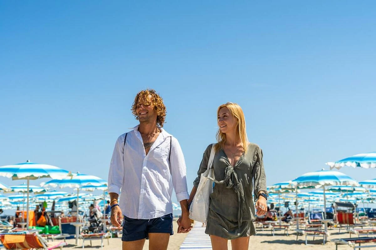 Den langen Sandstrand erreichen Sie in wenigen Minuten nach einem kurzen Spaziergang im Schatten der Pinien. Entweder geniessen Sie den freien Strandabschnitt oder nutzen die Annehmlichkeiten der Vertragsbadeanstalt (gegen Gebühr) mit Liegen, Sonnenschirmen, Beachtennis- und Beachvolleyballfeld, Spielplatz, Bar, Restaurant, Duschen, Sanitäranlagen und Tag- und Abendunterhaltung.