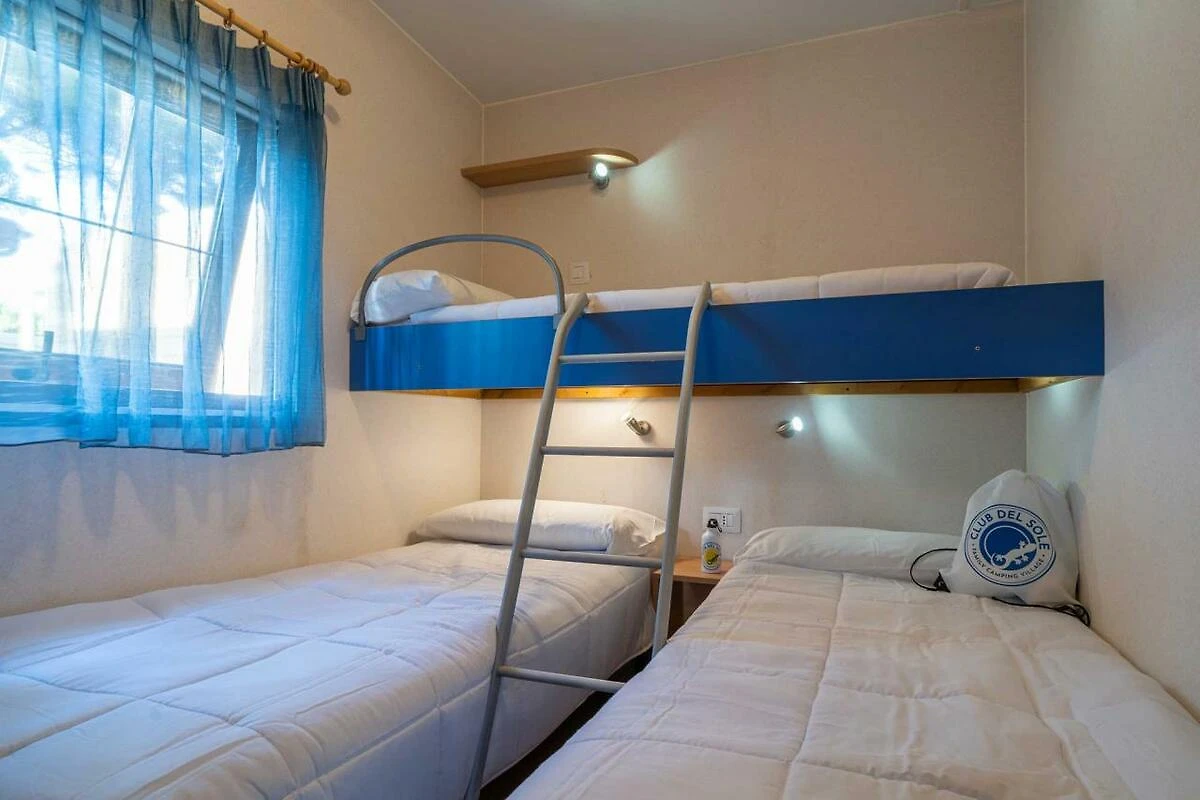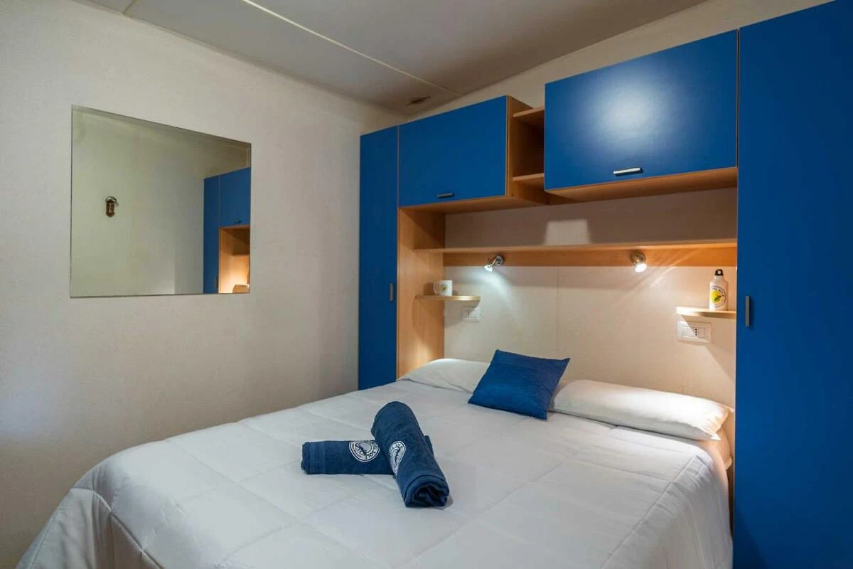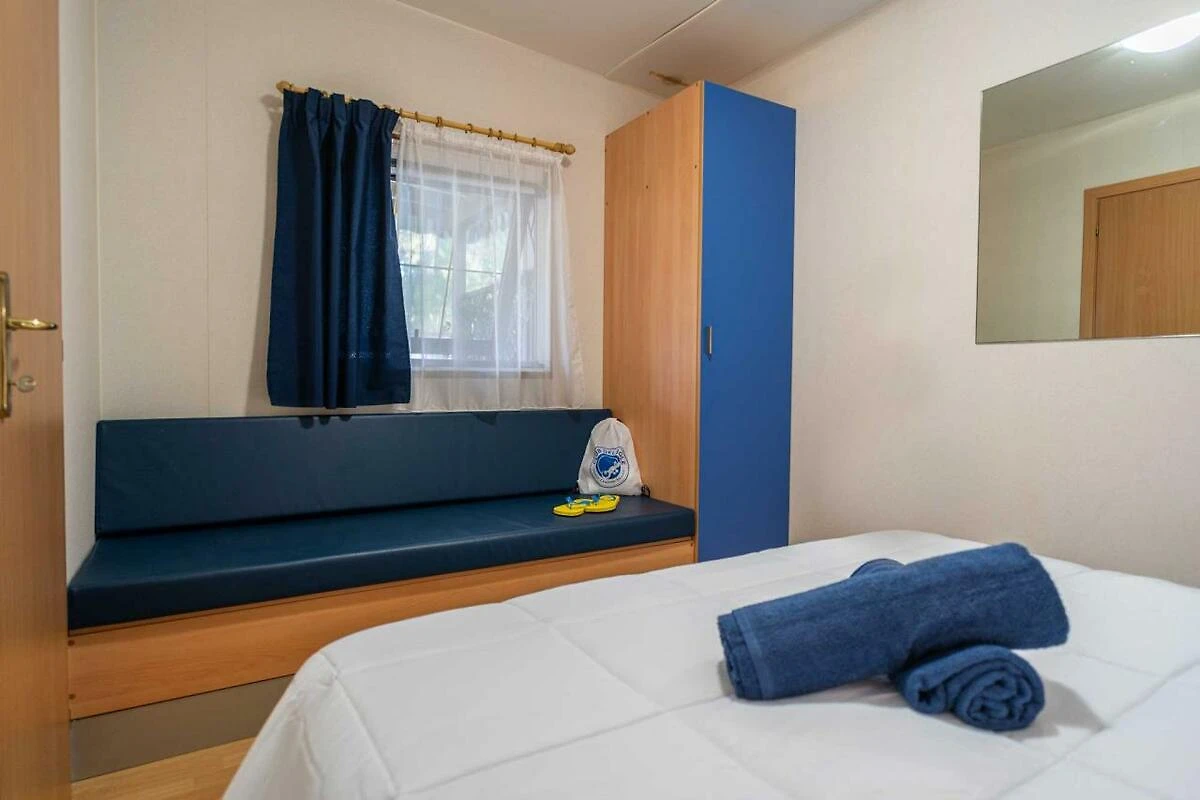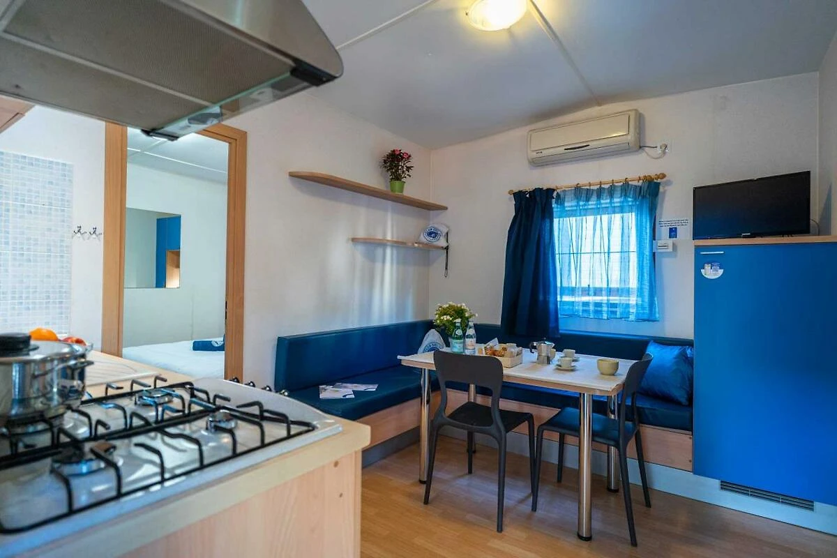 Das Mobilehome Lodge Superior Dog bietet Platz für maximal 5 Personen und verfügt über ein Schlafzimmer mit Doppelbett sowie ein Schlafzimmer mit zwei Einzelbetten und einem Hochbett für ein Kind unter 10 Jahren. Der Wohn- und Essbereich ist mit einem Fernseher und einer Küchenzeile mit Herd, Geschirr, Besteck, Töpfen, Pfannen und einem Kühlschrank mit Eisfach ausgestattet. Ein Tisch und Stühle sind ebenfalls vorhanden. Das Badezimmer bietet WC, Bidet, Dusche und Waschbecken. Die überdachte Holzterrasse mit Tisch und Stühlen lädt zum Entspannen ein. Fahrzeit zur italienischen Grenze ca. 4 Stunden. Hinweis: Mehrere Unterkünfte dieses Typs sind verfügbar.
