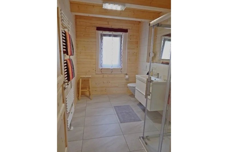 Das moderne Badezimmer im Obergeschoss verfügt über eine Dusche, eine Badewanne, einen Waschtisch, ein WC und einen Handtuchwärmer. Zusätzlich gibt es ein weiteres Badezimmer im Erdgeschoss mit Dusche, WC und Waschtisch. Der Zugang zur Terrasse erfolgt direkt vom Wohnbereich aus, sodass Sie die frische Luft und die Ruhe der Umgebung geniessen können.