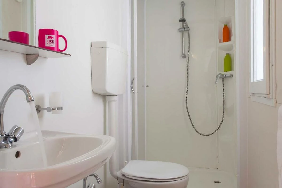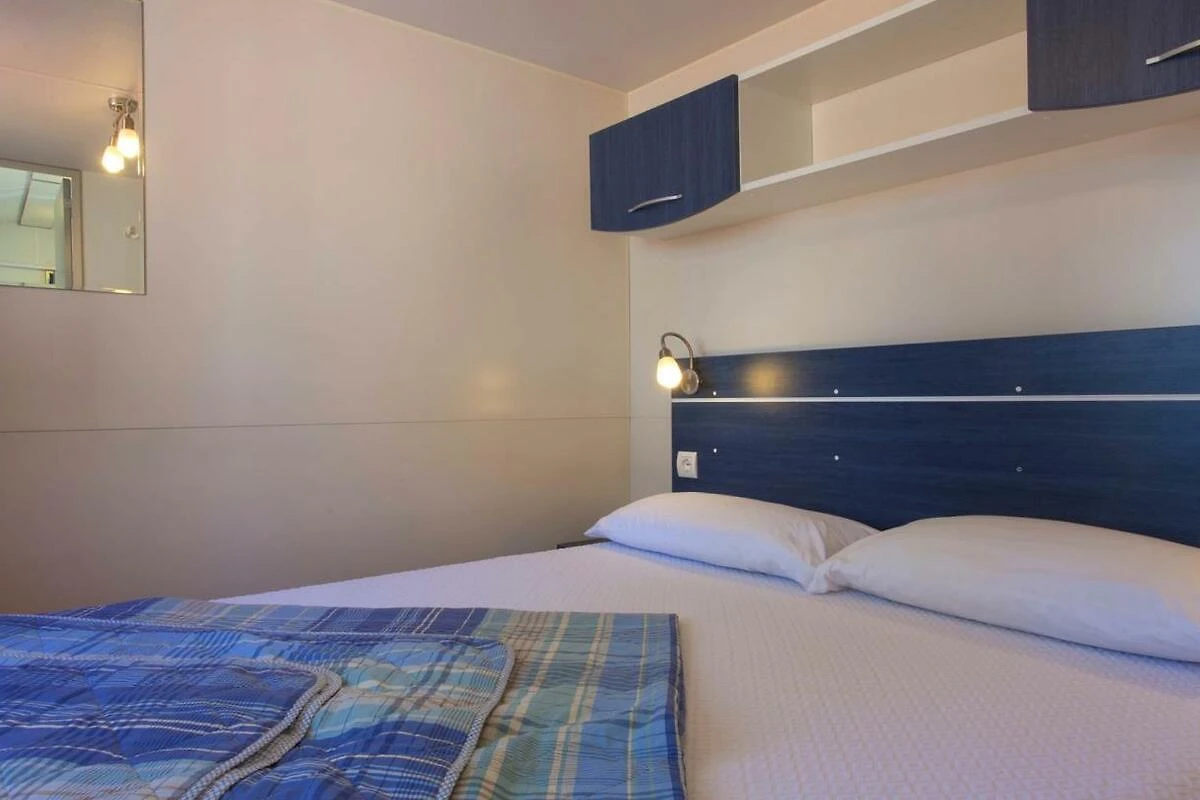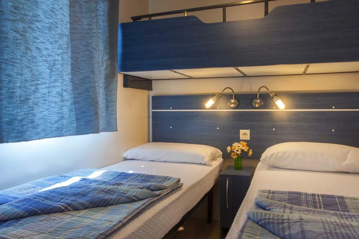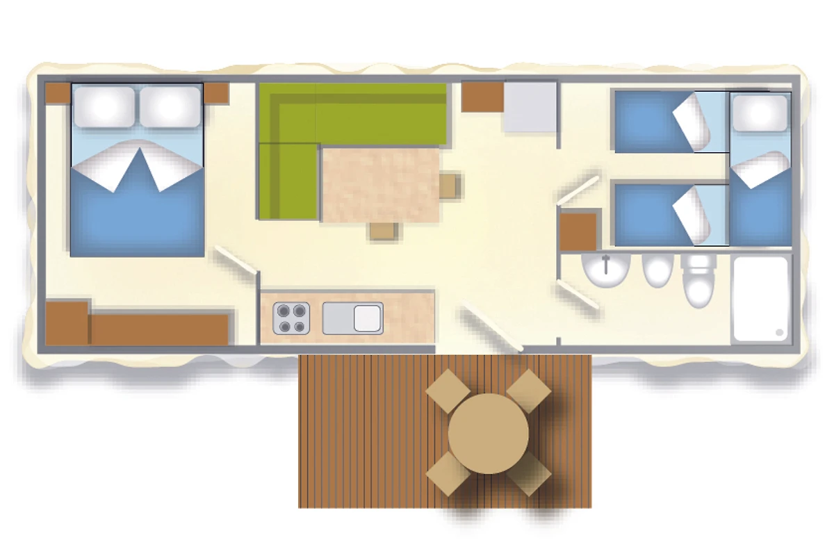Das Mobilehome Blu Romantic bietet Platz für max. 5 Personen. Es verfügt über ein Schlafzimmer mit einem Doppelbett und einem weiteren Zimmer mit zwei Einzelbetten und einem Hochbett für ein Kind (unter 12 Jahren). Das Wohnzimmer verfügt über eine gemütliche Essecke mit SAT-TV. Die Küche ist im Wohnraum integriert und verfügt über einen Herd, Töpfe, Geschirr, Besteck und einen Kühlschrank mit Eisfach. Das Badezimmer besteht aus einer Dusche, WC und einem Waschbecken. Der überdachte Sitzplatz mit Tisch und Stühlen lädt zum gemütlichen Entspannen ein, während die Kinder sich auf dem Spielplatz austoben können. Hinweis: Wenn Sie mehr als eine Unterkunft benötigen, ist dies bei uns in der Regel möglich, da wir über mehrere Objekte des gleichen Haustyps verfügen.
