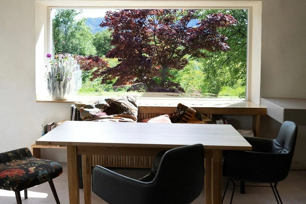 Elf neue, modern ausgestattete Ferienwohnungen, grosse Wiese für die Gäste direkt vor dem Haus, Frühstücksraum mit Produkten der Bauern aus der Umgebung, ausgewählte Bibliothek.