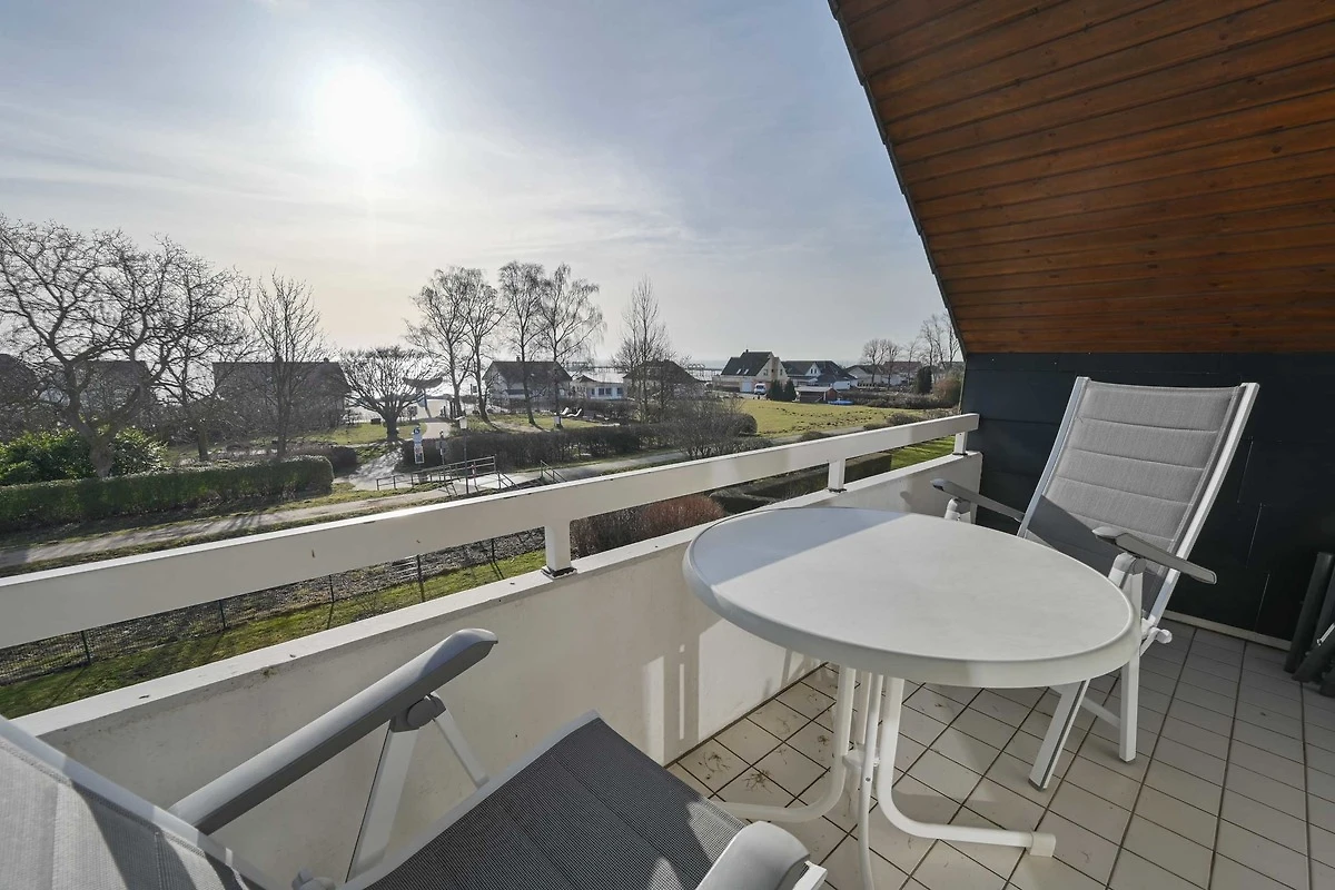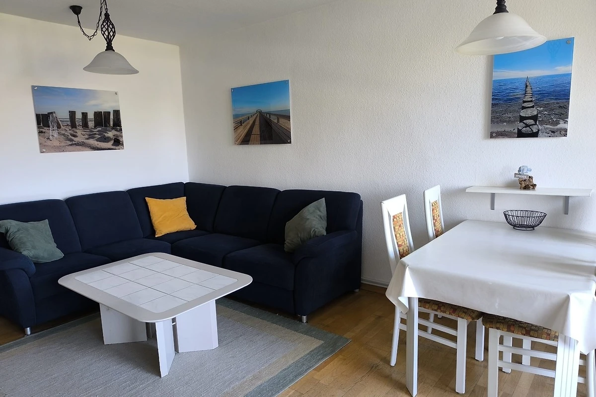 Der kombinierte Wohn-Schlafraum ist in eine Ess- und eine Couchecke aufgeteilt. Hier befindet sich für eine Person ein Schlafsofa mit Lattenrost (1,40). Des Weiteren beinhaltet der Wohnbereich einen SAT-TV Flachbildschirm-Fernseher und ein DAB+ Radio mit Bluetooth. Vor dem Wohnzimmer befindet sich ein Balkon, der mit Gartenstühlen bestückt ist. Von hier aus haben Sie, je nach Jahreszeit, einen eingeschränkten Seeblick. Ebenfalls haben Sie die Möglichkeit, die Rasenfläche des Grundstückes zu nutzen.