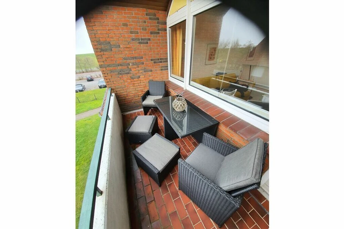 Ein Esstisch mit vier Stühlen, der Flatscreen und natürlich ein Balkon mit Sicht auf den Deich runden die Wohnung ab.