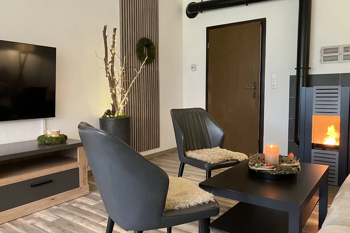 • Erdgeschoss: Hier heißt Sie unsere Wohnküche mit Backofen, Mikrowelle etc. herzlich willkommen. Am Bartisch mit vier Hockern können Sie mit dem Koch ins Gespräch kommen, während dieser die Speisen für Ihre Lieben zubereitet. Das Zentrum der Gastlichkeit ist der gemütliche Wohnraum mit behaglichem Pelletofen, ausziehbarer Schlafcouch für 2 Personen, Smart-TV und Highboard. Am großen Esstisch lassen sich die Eindrücke des Urlaubstages gemeinsam Revue passieren. Darüber hinaus finden Sie Spiele und Bücher zu Ihrer Unterhaltung. Das geräumige Bad mit begehbarer Dusche, Wanne, WC und BD lädt zum Entspannen ein.