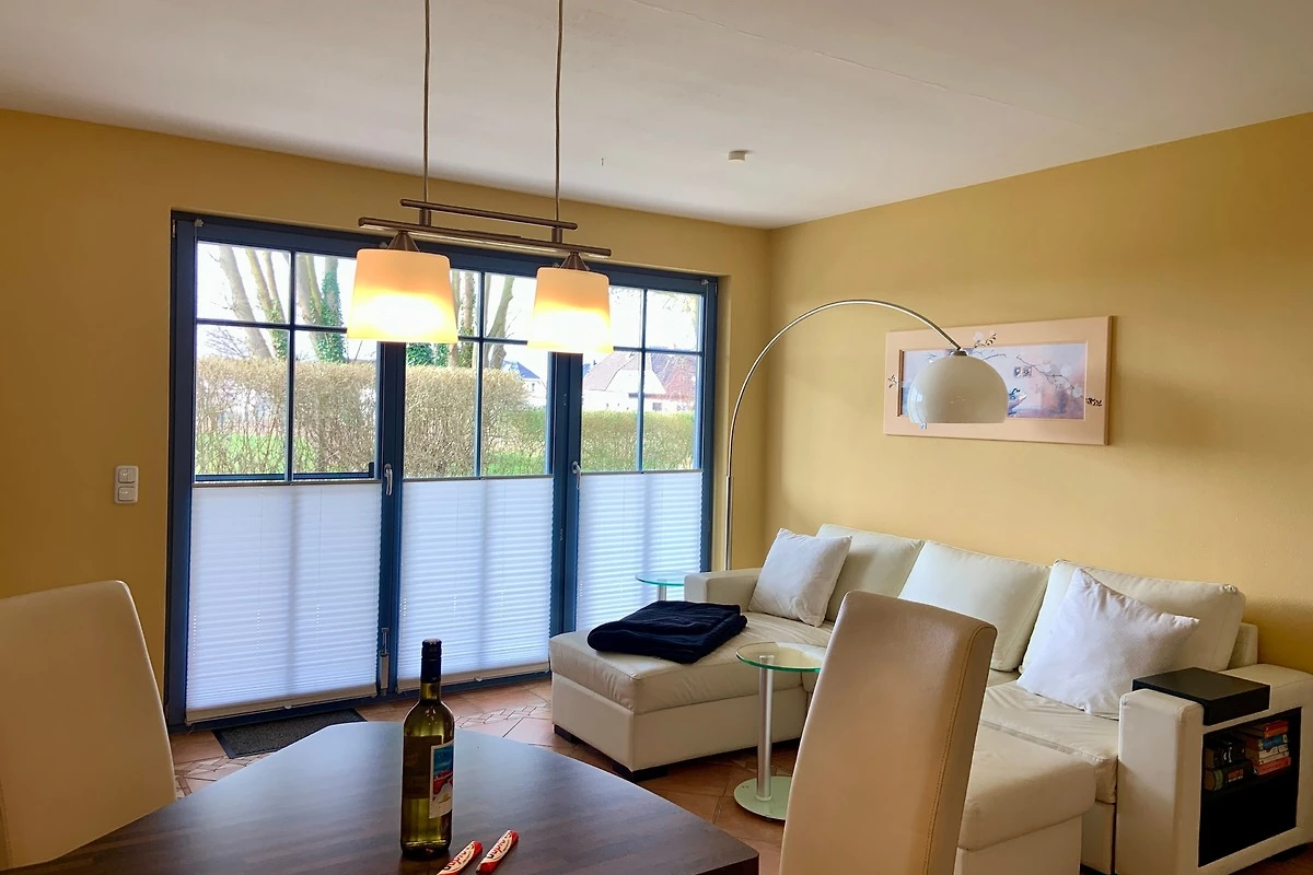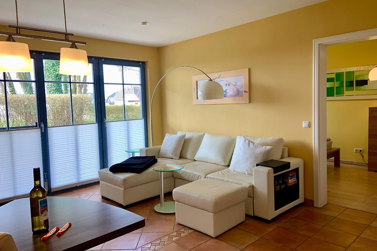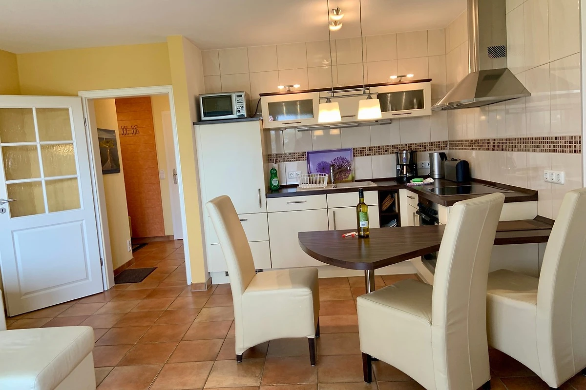 Sie erwartet eine modern vollausgestattete, absolut ruhig gelegene Wohnung in direkter Boddennähe. Geniessen sie Abende auf der Terrasse, profitieren von der umfassend ausgestatteten Küche oder machen sie es sich auf der Couch mit Ottamane einfach nur bequem. Fahren sie Fahrrad auf dem Deich rundum Zingst oder sitzen einfach nur am nur wenige Meter entfernten Bodden mit dem Charme des Sonnenauf- oder Unterganges. Geniessen sie den Ein- und Ausflug der Kraniche am Bodden.