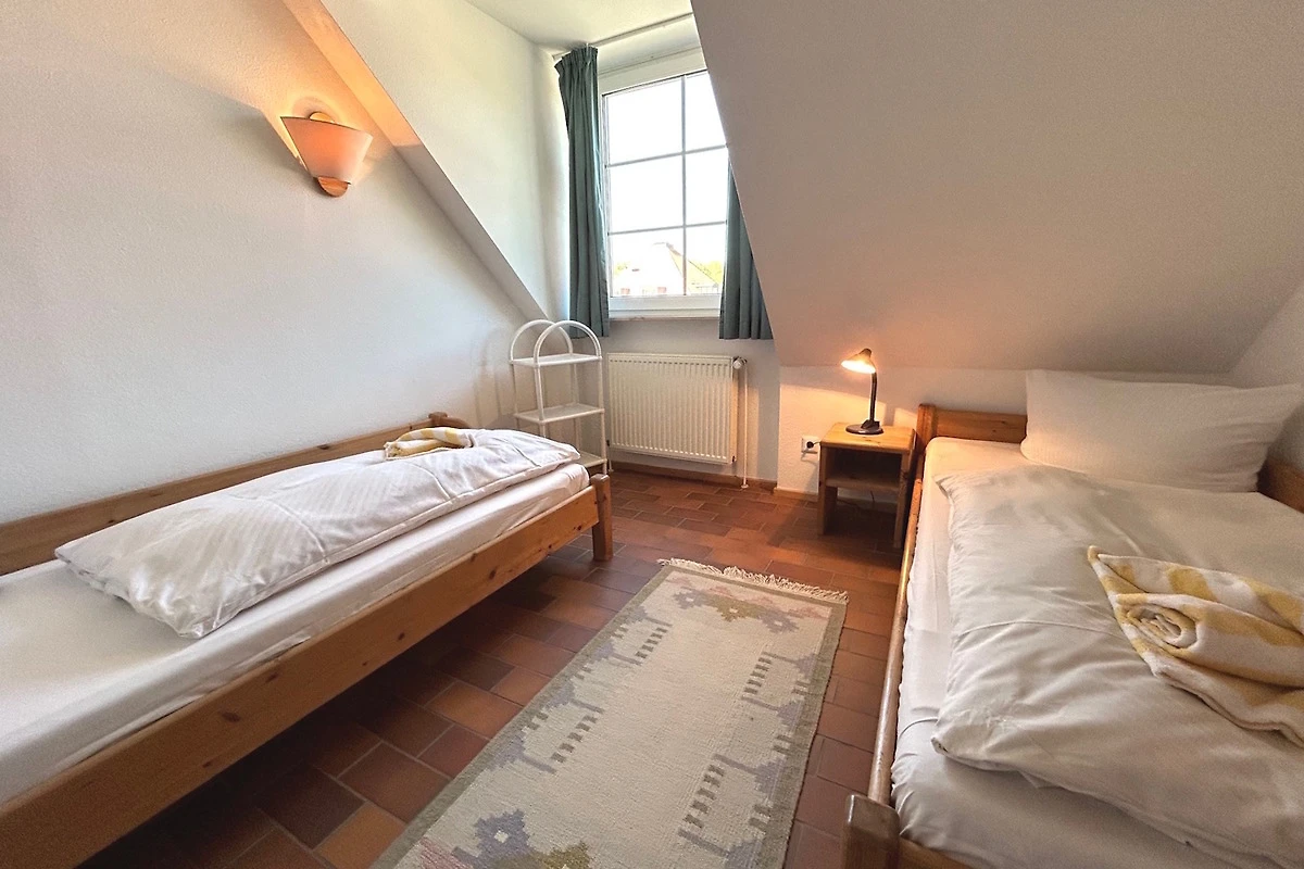 3 Zimmer-Maisonette ca. 75 qm für 2-6 Personen, Haus P in der Residenz Kormoran, Grüne Strasse 45A-R, Ostseebad Prerow. 1.OG: Wohnzimmer mit Schlafcouch, Sitzgarnitur, Kleiderschrank, SAT-TV/Radio, WLAN, Duschbad/WC, Balkon, Essecke mit Küchenzeile (Spülmaschine). 2.OG: 2 Schlafzimmer, 1x Doppelbett, 1x 2 Einzelbetten, Dusche/WC