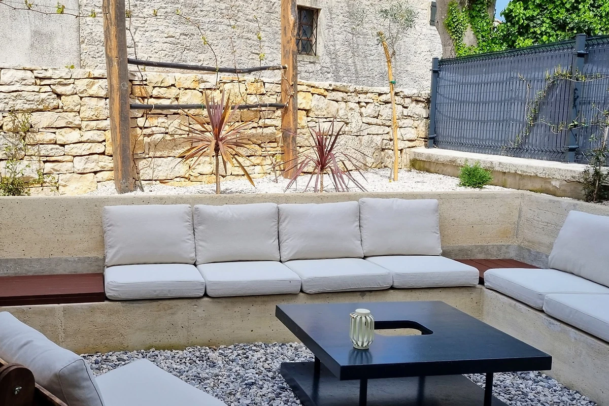 Die traditionelle Steinfassade des Hauses und die mediterrane Bepflanzung verleihen dem 500 m² grossen Garten einen besonderen Charme. Dank der verschiedenen Entspannungsbereiche, des Swimmingpools und der Sommerküche können Sie hier die meiste Zeit des Tages verbringen. Nehmen Sie ein Bad im beheizten Meerwasserpool und entspannen Sie sich anschliessend auf einem der 8 Liegestühle. Für ein geselliges Beisammensein bei einem Cocktail oder einem Glas Wein gibt es einen überdachten Lounge-Bereich und eine abgegrenzte Ecke mit Sitzgelegenheiten im Freien für bis zu 10 Personen. Die Sommerküche ist ebenfalls überdacht und komplett ausgestattet. Mit einem grossen Kühlschrank, einem Gasherd und einem Grill können Sie alle Ihre Mahlzeiten zubereiten, während Sie die mediterrane Luft geniessen. Hier können Sie dank des grossen Esstisches für 8 Personen köstliche Spezialitäten geniessen.