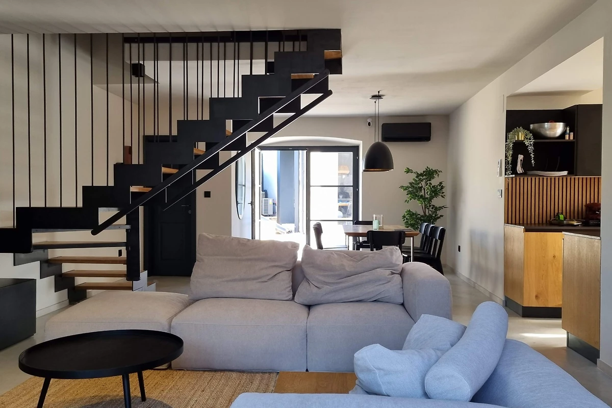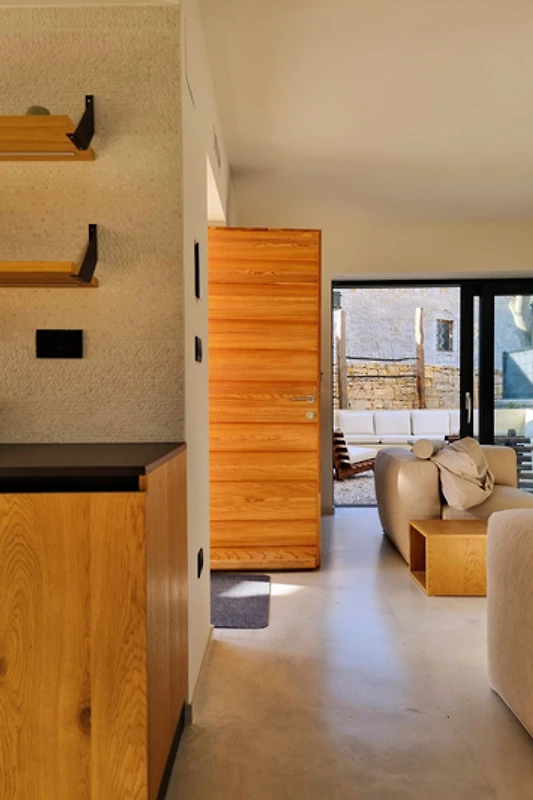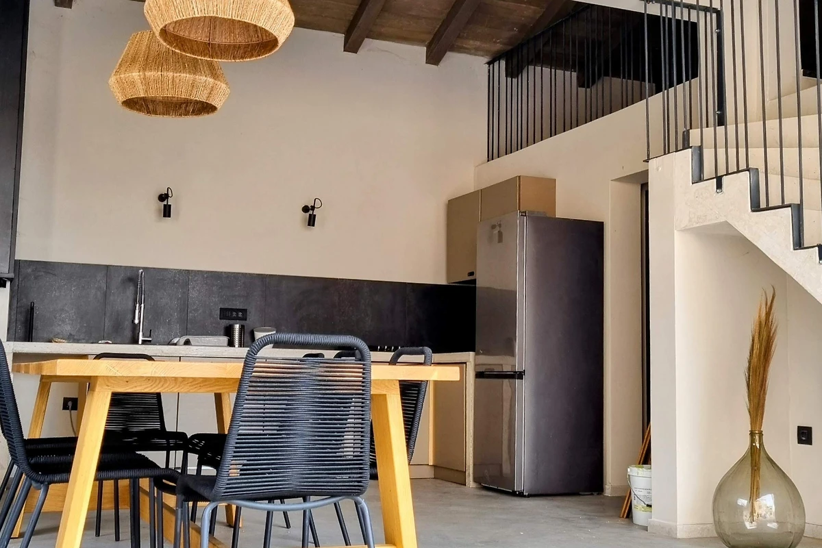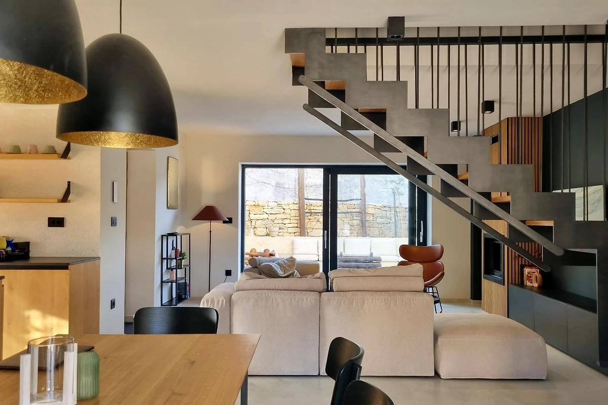 Das Erdgeschoss wurde in ein offenes Wohnzimmer, eine Küche und ein Esszimmer umgewandelt. Das moderne, minimalistische Dekor steht im Vordergrund, wobei Holzelemente und helle Farben den Raum erwärmen. Das gilt besonders für das Wohnzimmer, wo ein bequemes Sofa vor einem modernen Kamin steht. Die Einrichtung macht diesen Teil des Erdgeschosses hell und luftig, ebenso wie die grossen Schiebetüren, die direkt auf die Aussenterrasse führen. Auf der anderen Seite des Raumes befindet sich der Esstisch aus Holz, an dem 8 Personen Platz finden. Daneben befindet sich der Eingang zur separaten Küche. Die Küche ist in einer raffinierten Kombination aus Beige und Schwarz gehalten und ist komplett ausgestattet. Hier werden Sie sicher gerne Ihre morgendliche Tasse Kaffee mit Blick auf den Garten zubereiten.